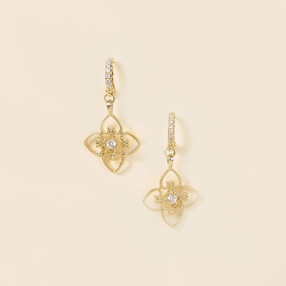 Elles se composent d’une dormeuse serties d'oxyde de zirconium dorée à l’or fin 24 carats et d’une médaille en forme de freur trèfle et avec au centre unet oxyde de zirconium.