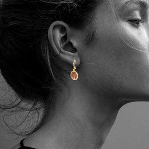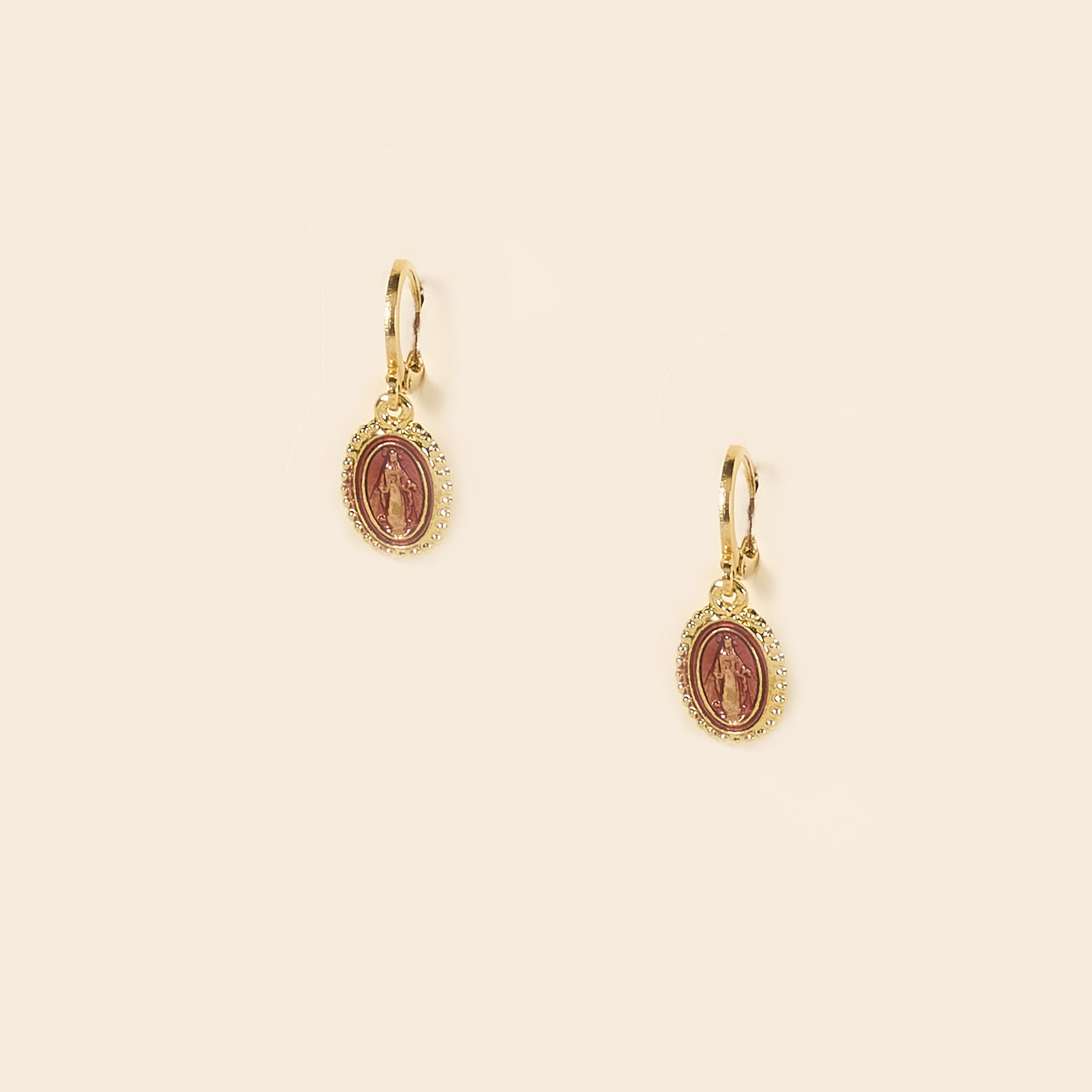 Les boucles d’oreilles Leon se composent d’une dormeuse en laiton doré à l’or fin 24 carats, avec une finition 2 microns. Y est suspendue une médaille de Vierge miraculeuse, entourée d’une fine chaîne perlée qui lui apporte délicatesse et légèreté. Elle est émaillée avec soin dans notre atelier à Nîmes, dans un émail rose foncétransparent qui laisse apparaître la silhouette de la Vierge tout en diffusant une subtile touche de lumière et d’éclat.