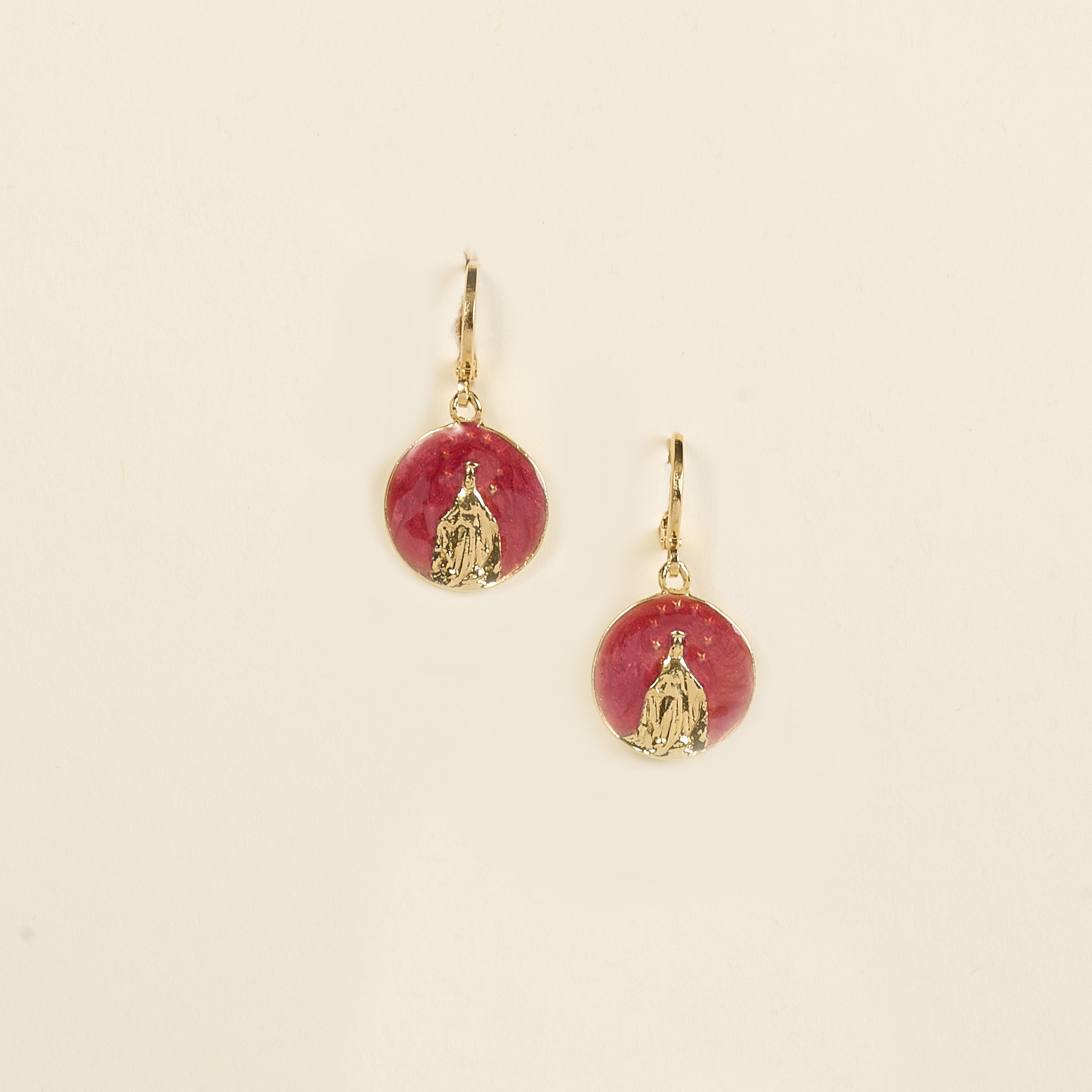 Les boucles d’oreilles Liam se distinguent par leur délicatesse et leur symbolique. Elles se composent d’une dormeuse en laiton doré à l’or fin 24 carats, accompagnée d’une médaille de Vierge auréolée de huit étoiles.