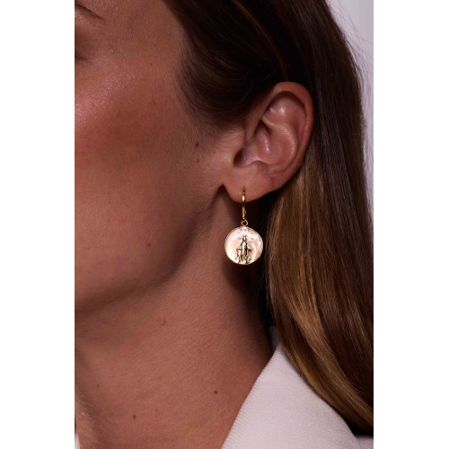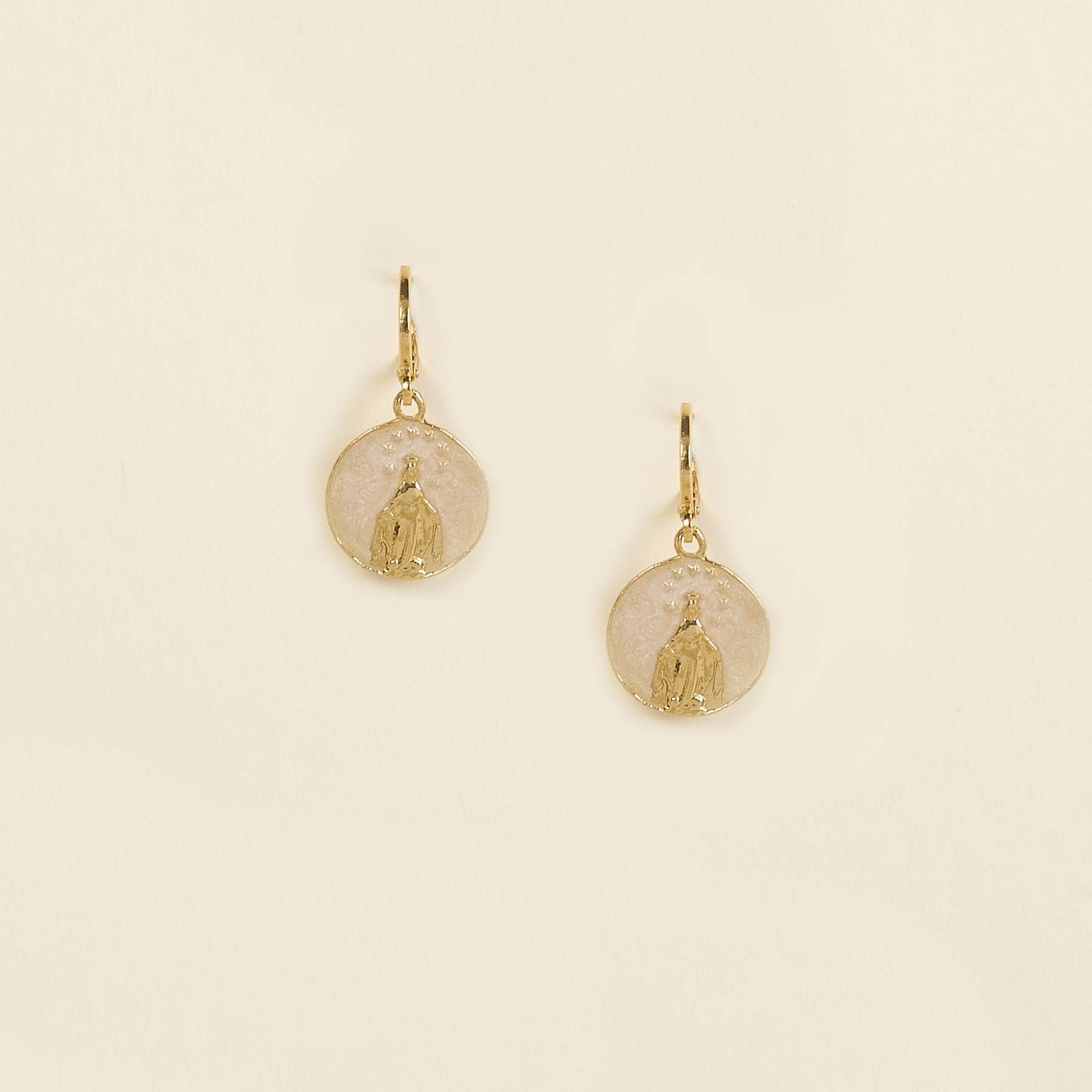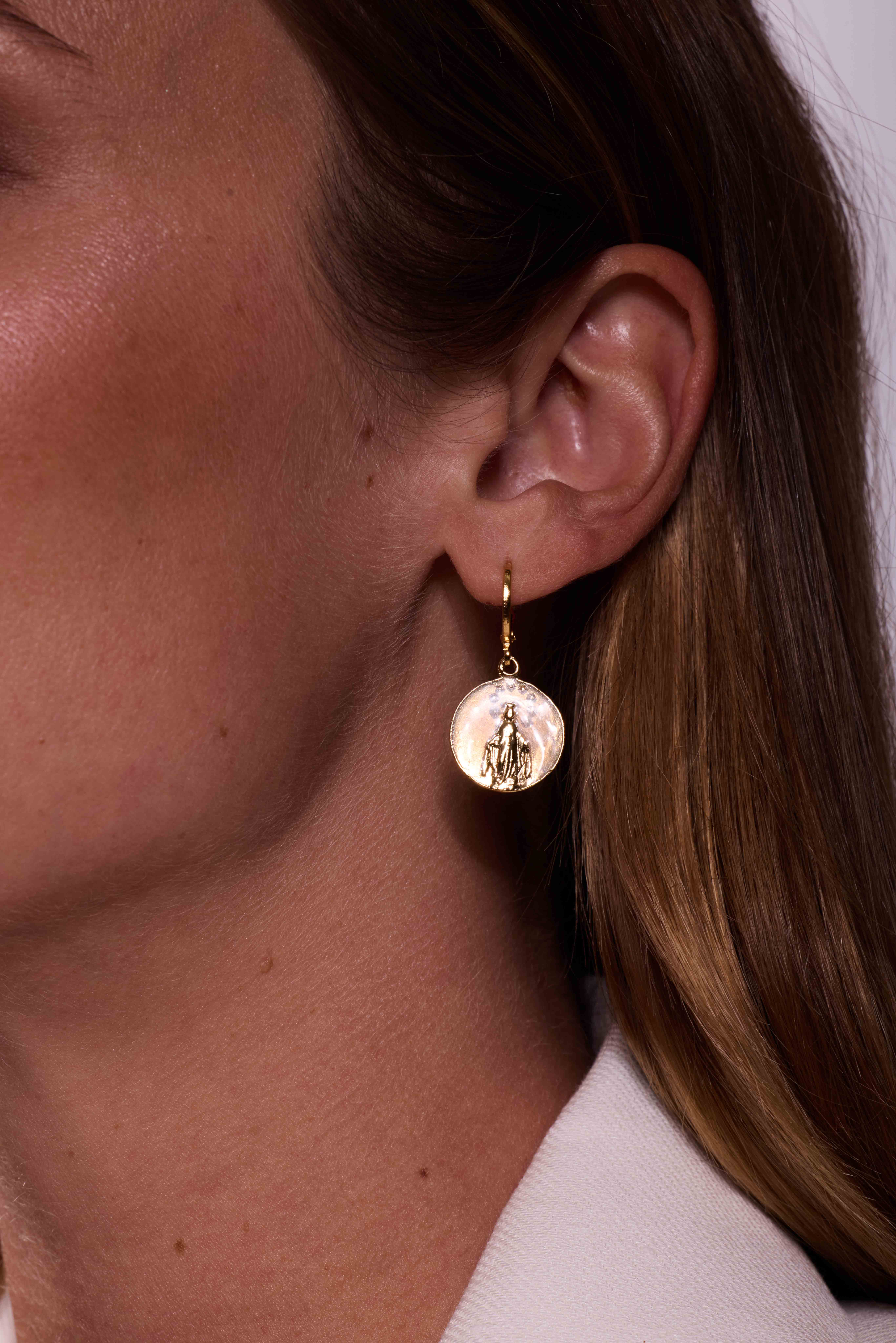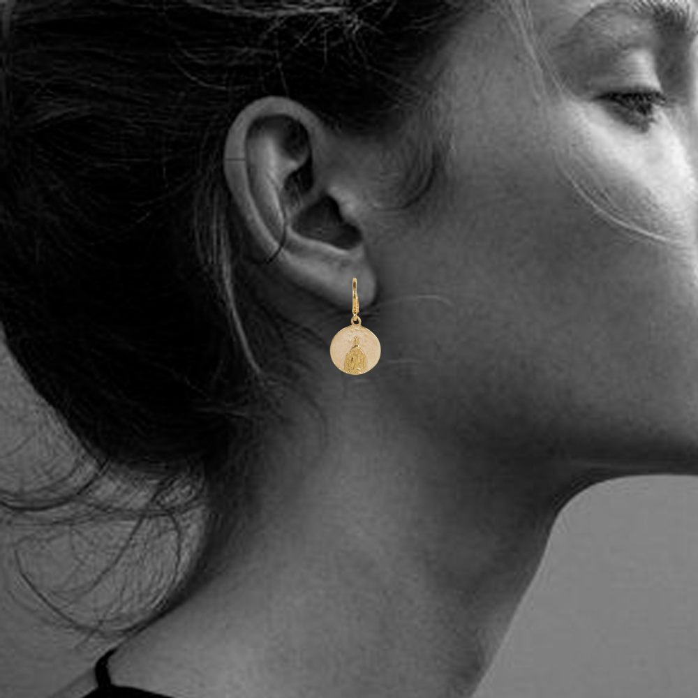 Les boucles d’oreilles Liam se distinguent par leur délicatesse et leur symbolique. Elles se composent d’une dormeuse en laiton doré à l’or fin 24 carats, accompagnée d’une médaille de Vierge auréolée de huit étoiles.
