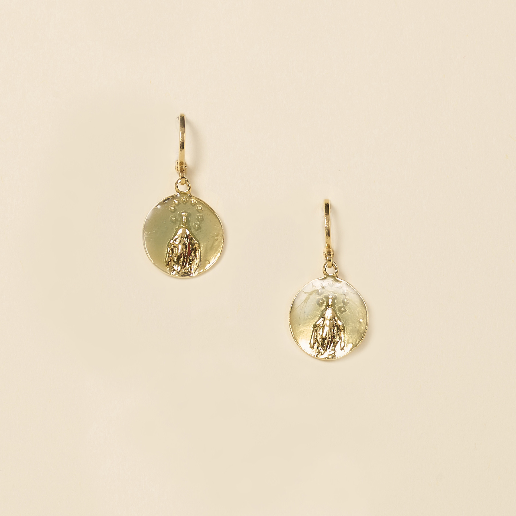 Les boucles d’oreilles Liam se distinguent par leur délicatesse et leur symbolique. Elles se composent d’une dormeuse en laiton doré à l’or fin 24 carats, accompagnée d’une médaille de Vierge auréolée de huit étoiles.