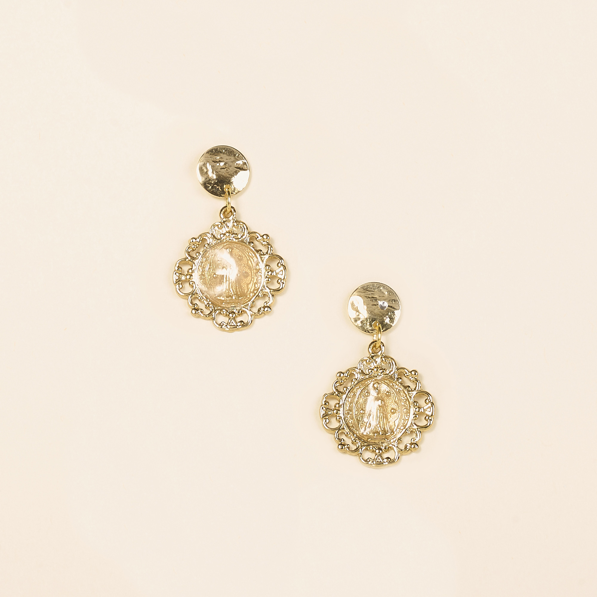 Elles sont composées d’une dormeuse en laiton doré à l’or fin 24 carats, ornée d’une médaille représentant la Vierge, auréolée d’étoiles.