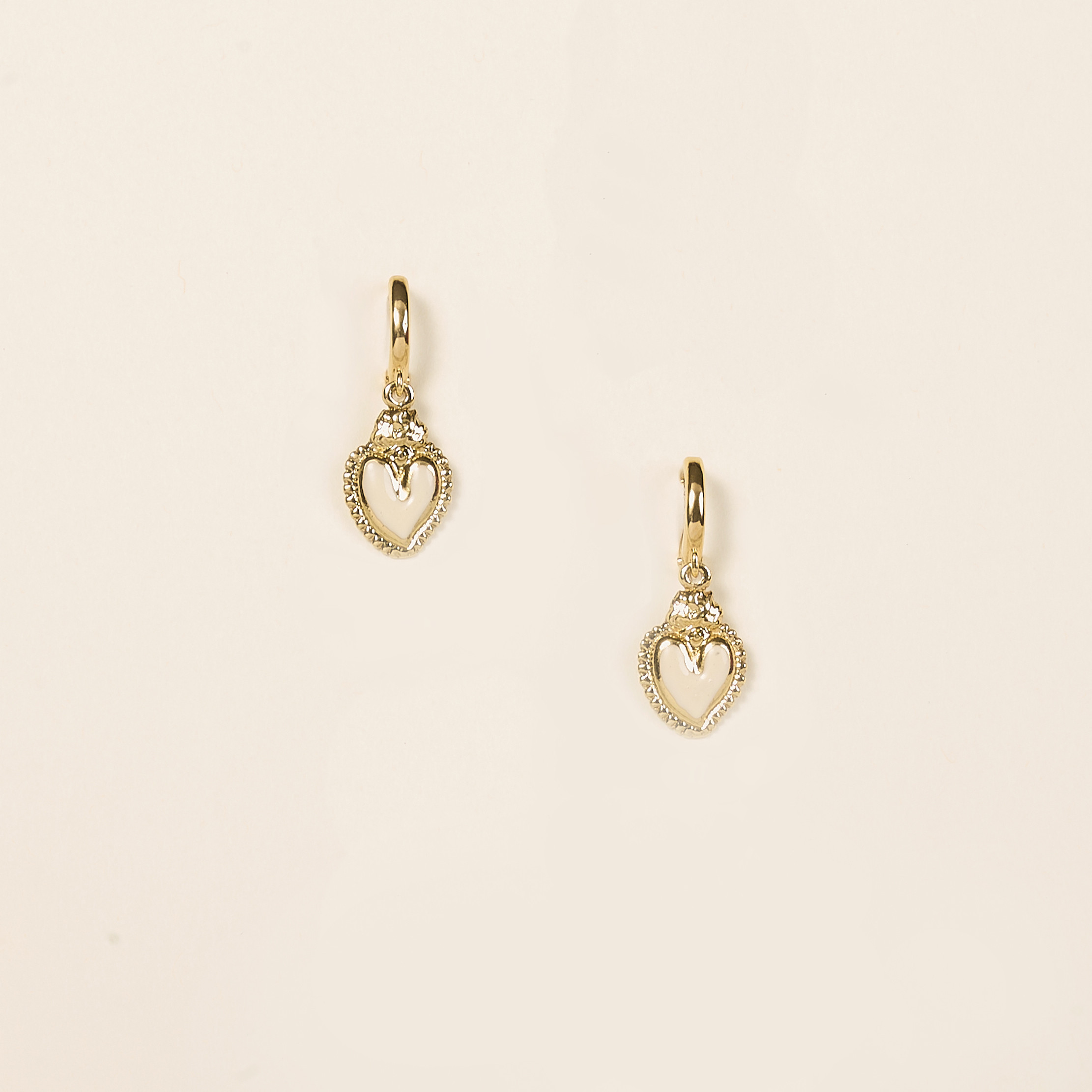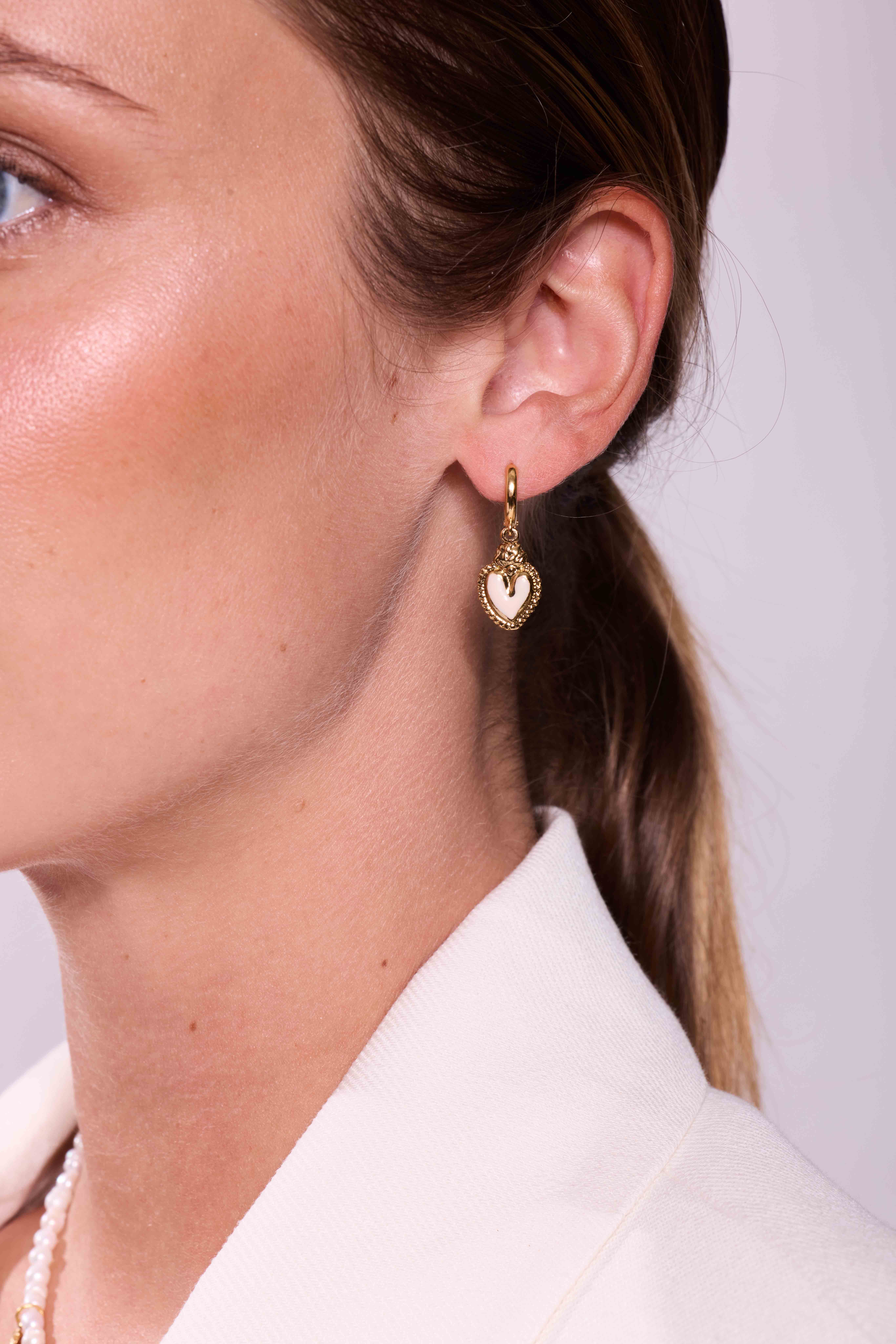 Les boucles d’oreilles Lumi Blanc dévoilent un cœur ajouré délicatement émaillé blanc, symbole de pureté et de lumière. Leur dorure à l’or fin rehausse l’éclat du visage avec élégance.