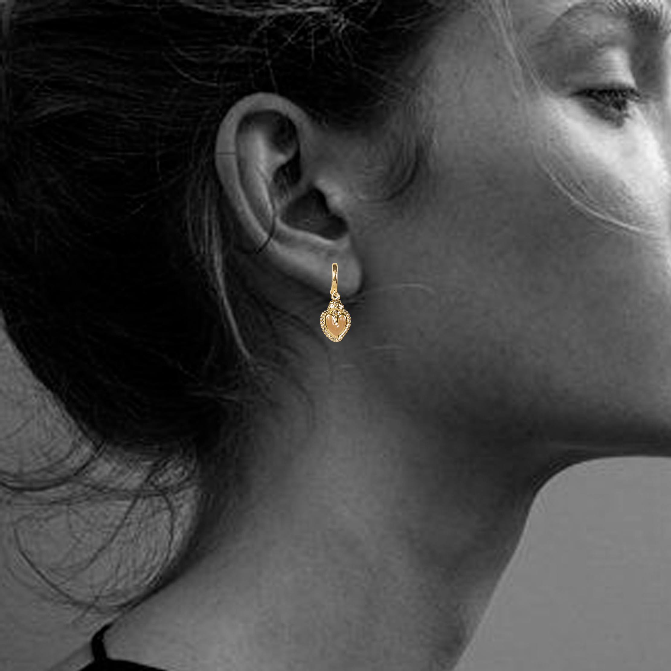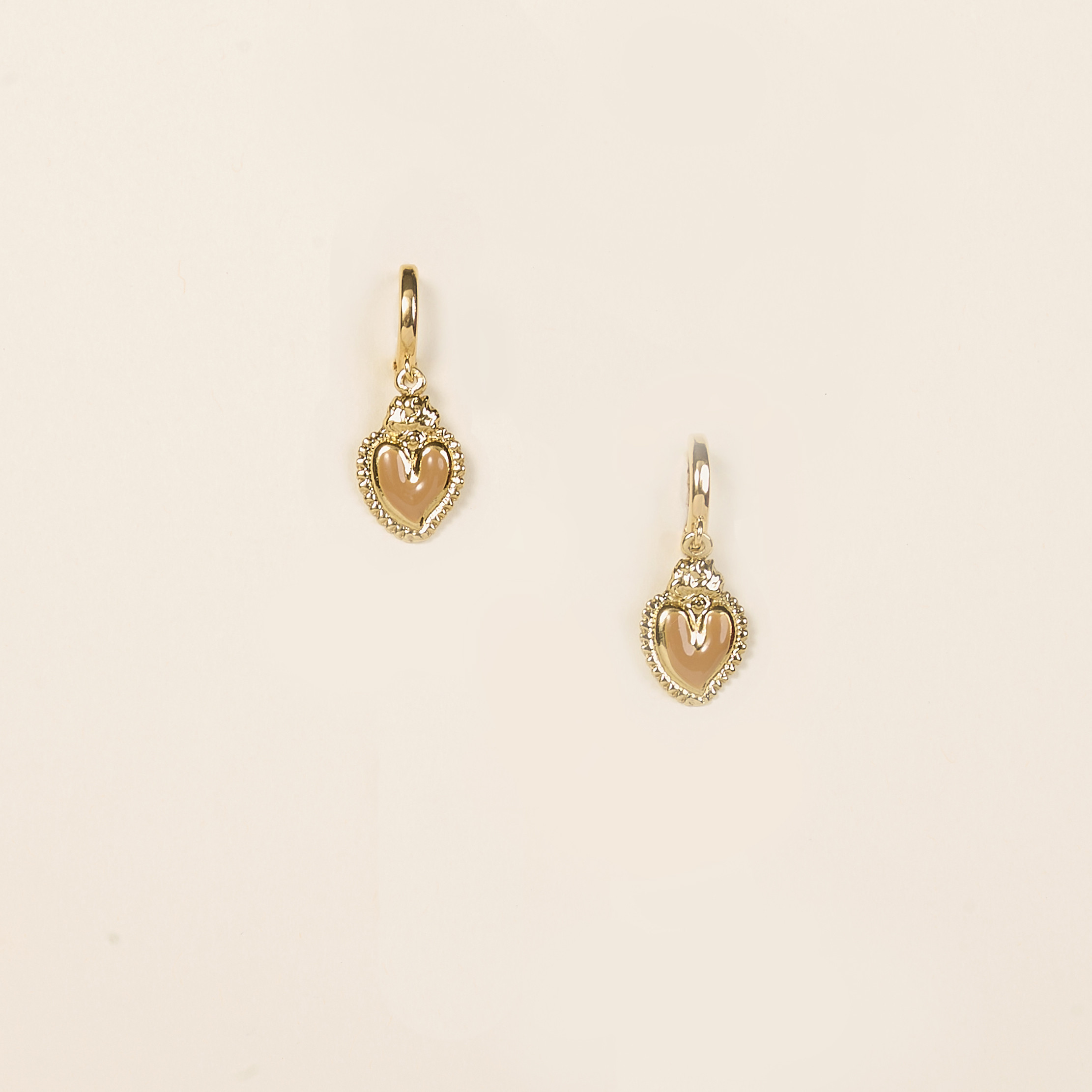 Les boucles d’oreilles Lumi Camel associent la douceur du beige doré à la chaleur du métal précieux. Leur cœur émaillé évoque les teintes solaires de la terre et de la lumière naturelle.