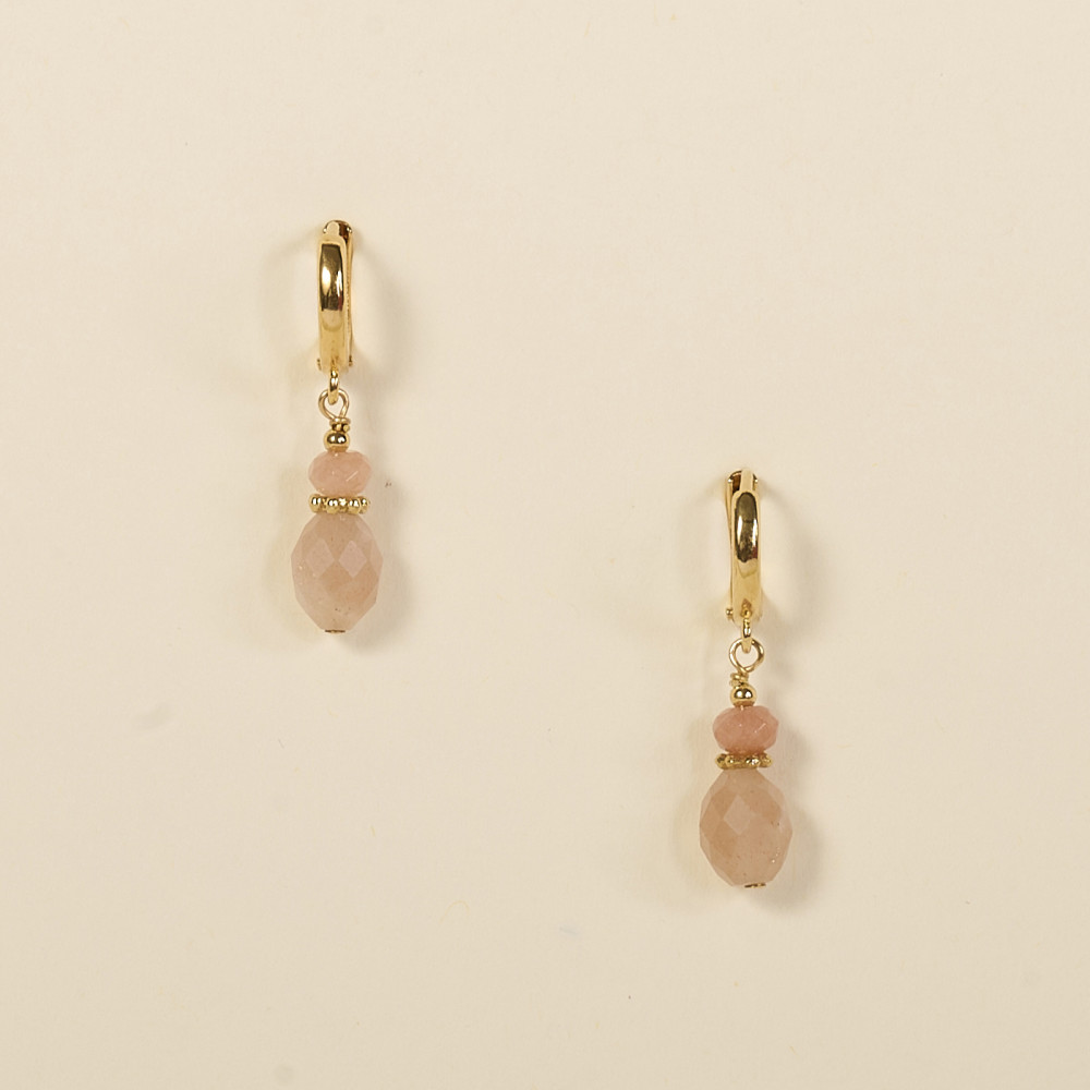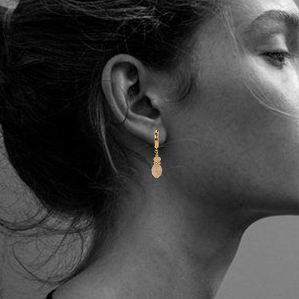 Les boucles d’oreilles Ciri se distinguent par leur finesse et leur délicatesse. Elles associent une perle ovale facettée à une perle ronde, toutes deux en pierre de lune pêche, pour un jeu d’éclats subtil et lumineux.