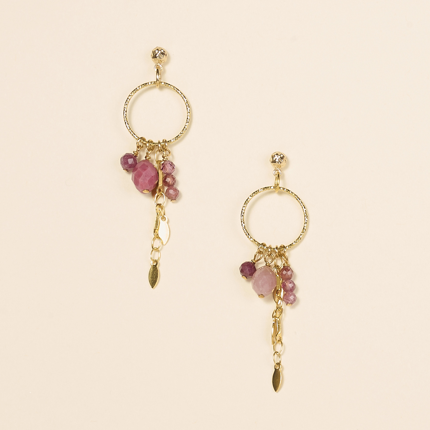 Les boucles d’oreilles Baïa allient l’éclat des pierres fines telles que : le grenat, la rhodonite à la finesse d’un anneau rond délicatement ciselé.