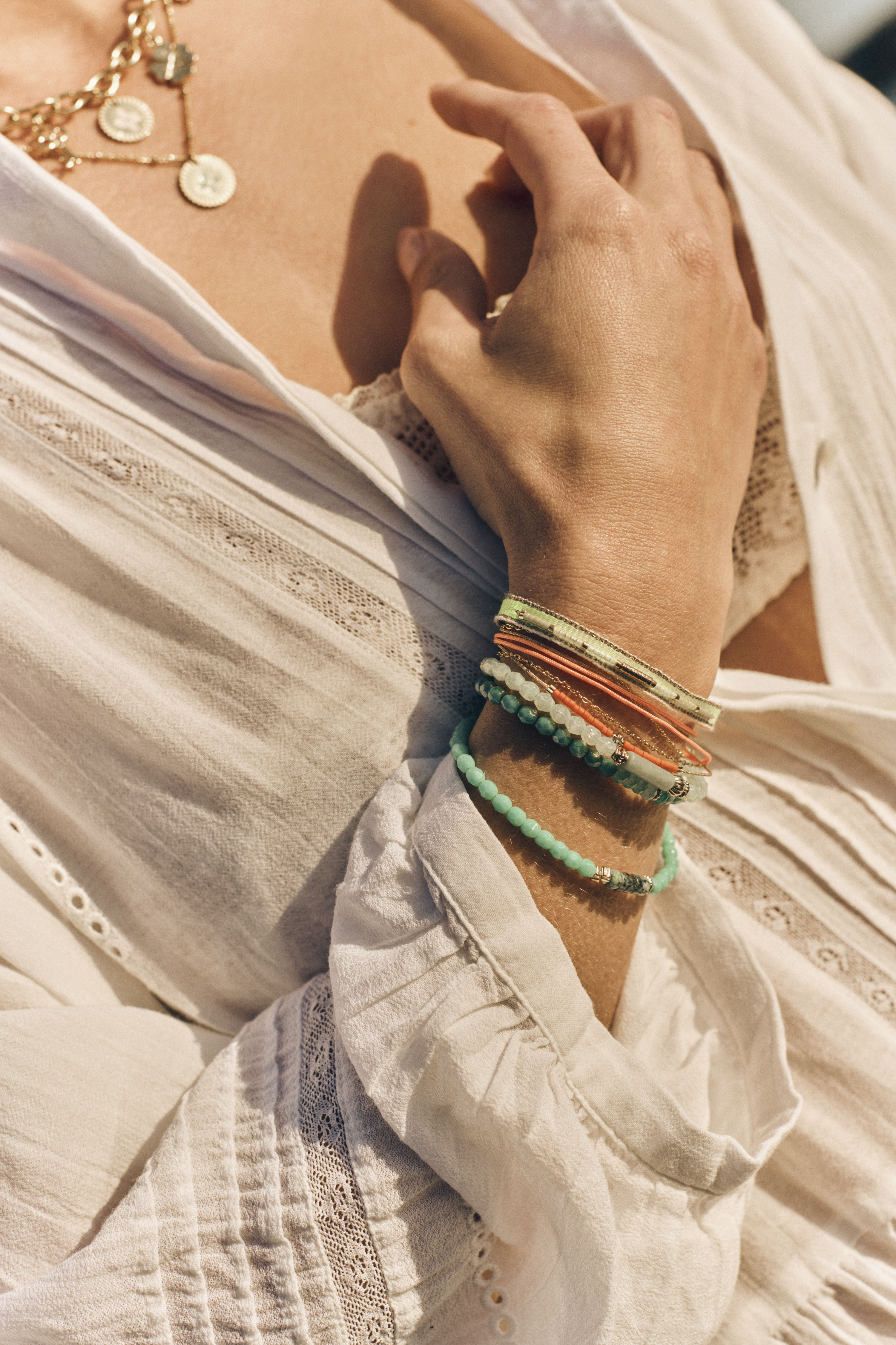Le bracelet Lila, véritable intemporel de la marque, est un bracelet multi tours composé d'une chaîne, de cordons unis, de perles Miyuki et de perles dorées à l'or fin 24 carats.