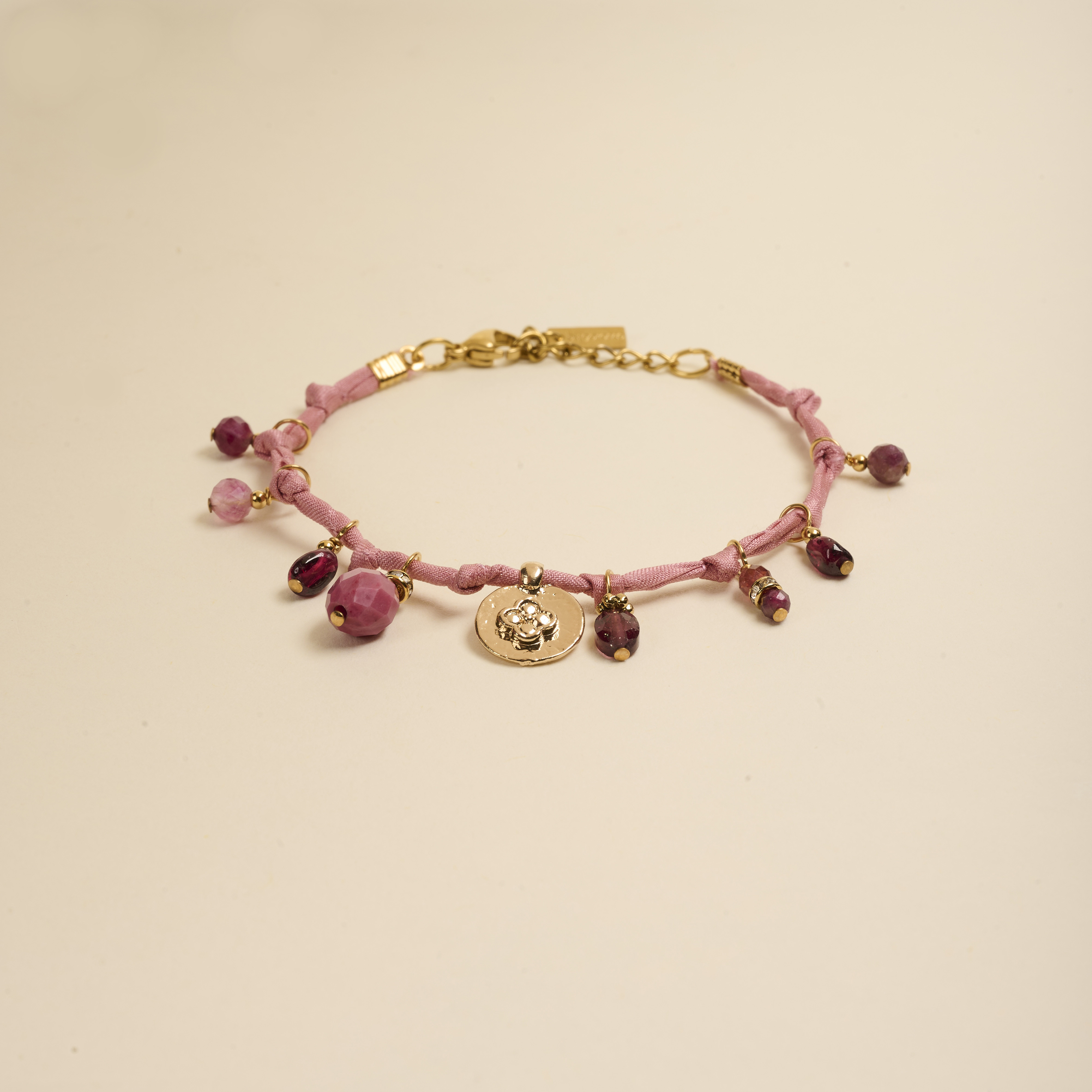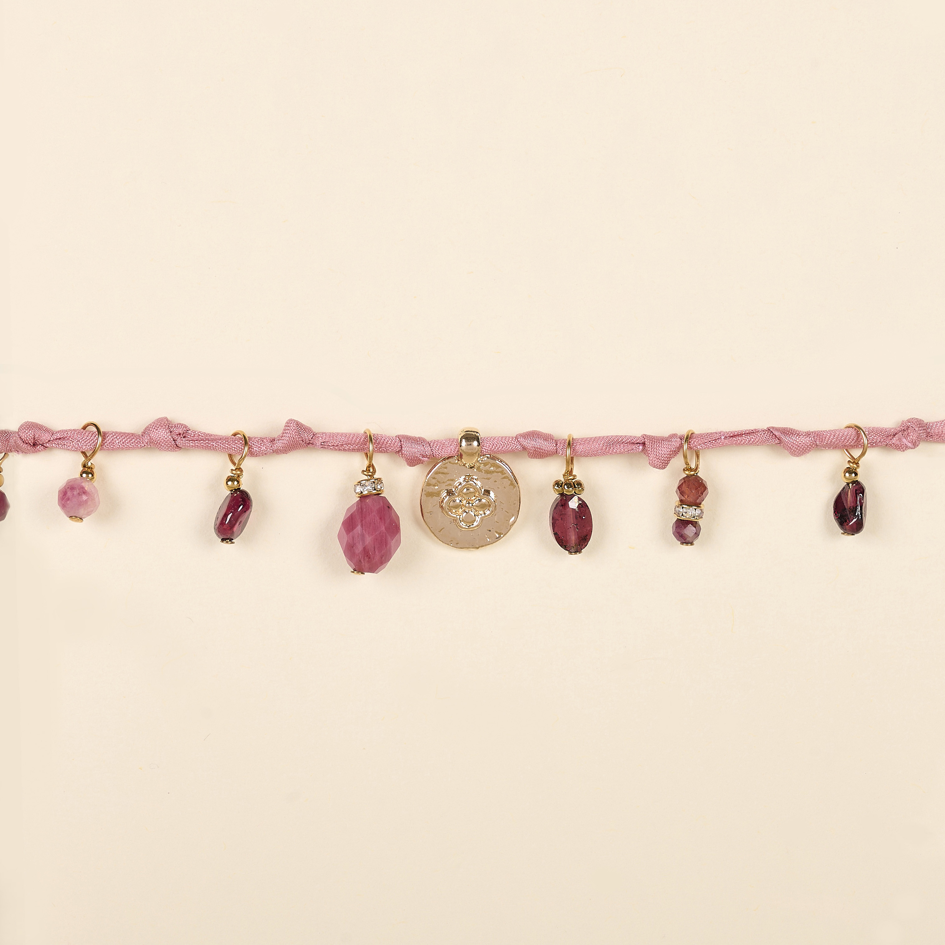 Il associe délicates pampilles en pierres fines : tourmaline rose, grenat, rhodonite. Ainsi qu'une médaille dorée à l'or fin, le tout sur un fil de soie roulé.