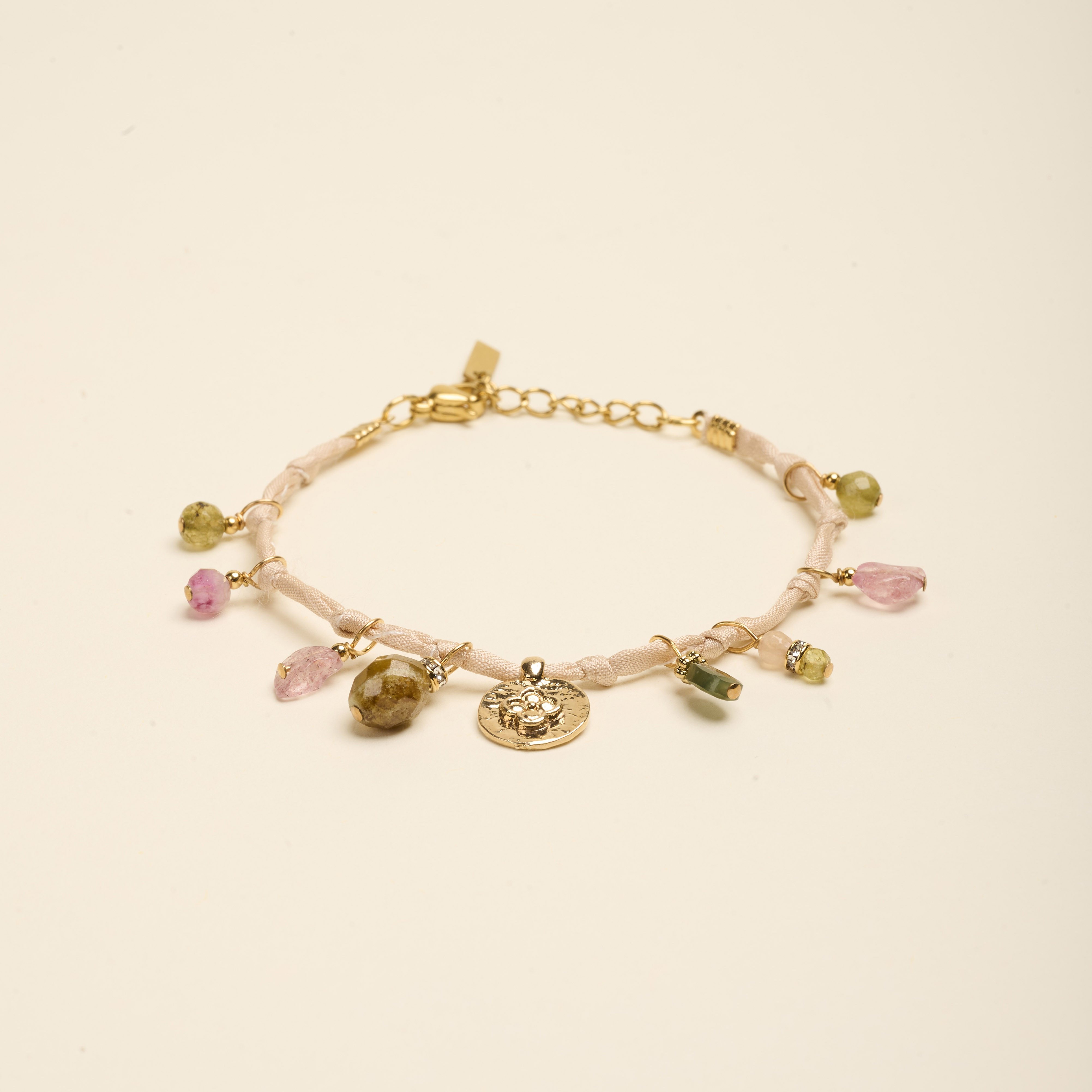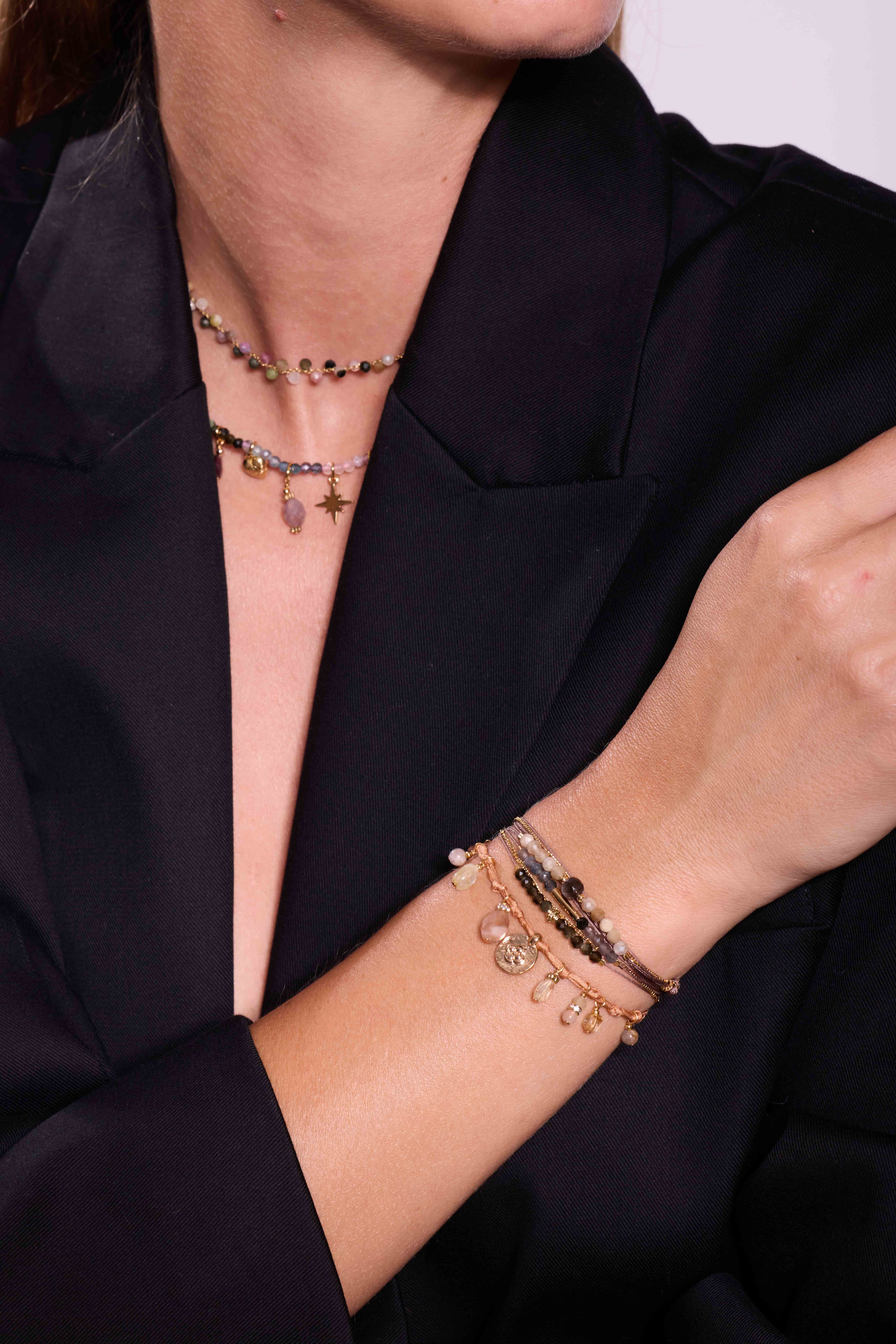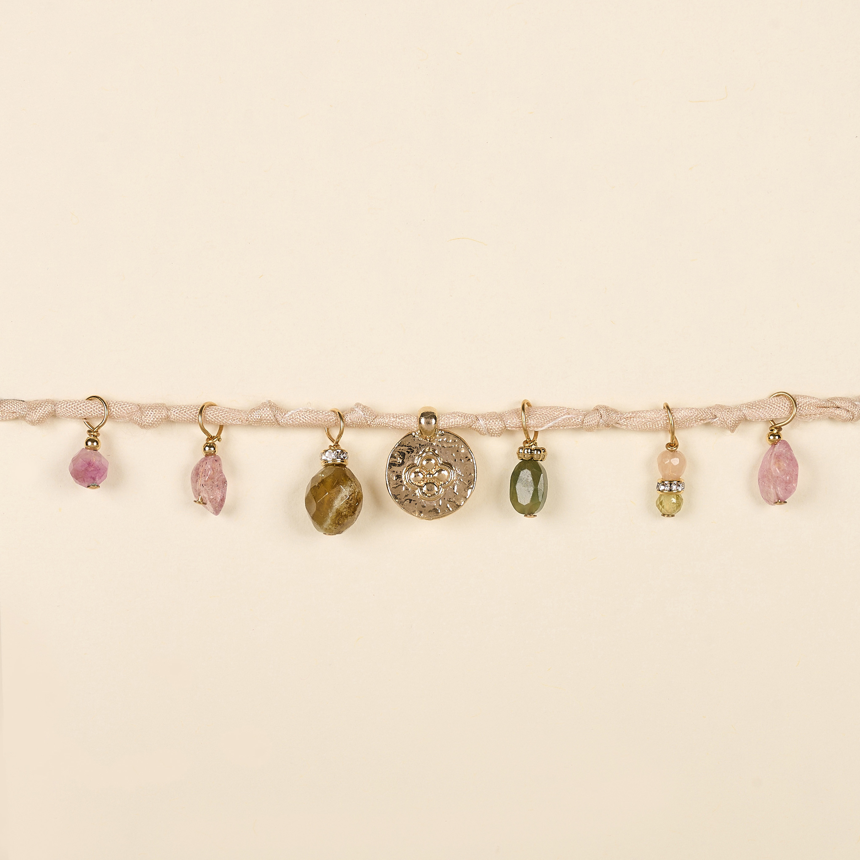 Il associe délicates pampilles en pierres fines : grenat vert, pierre de lune pêche, quartz cherry. Ainsi qu'une médaille dorée à l'or fin, le tout sur un fil de soie roulé.