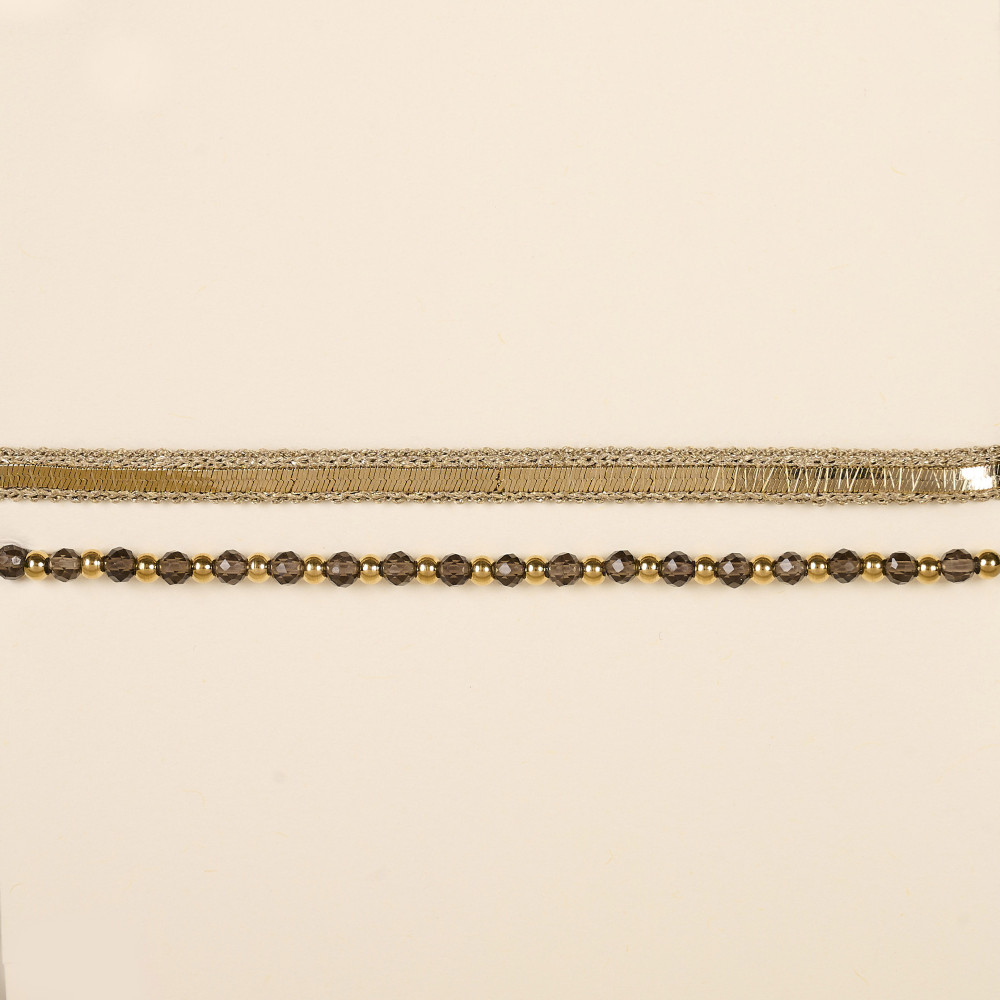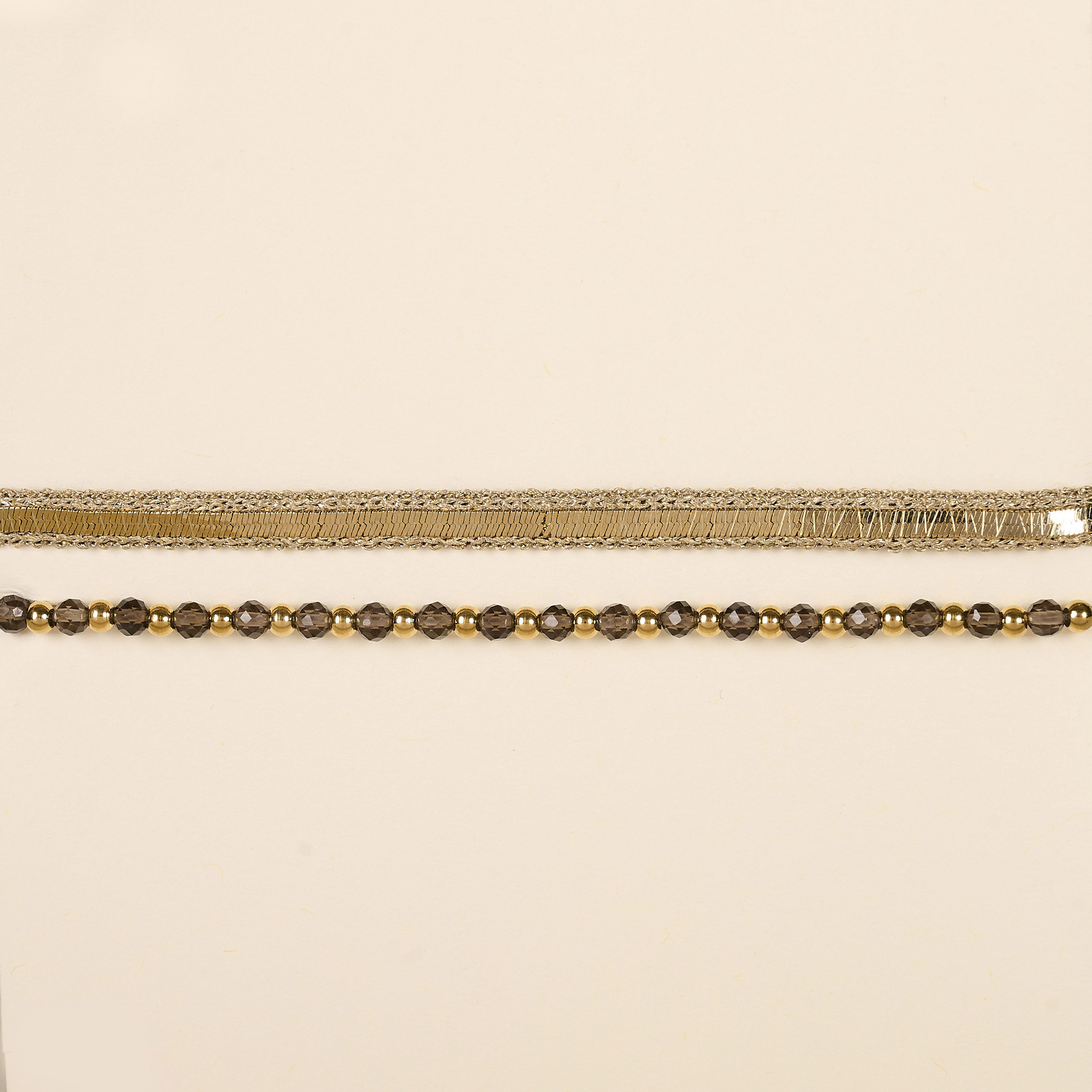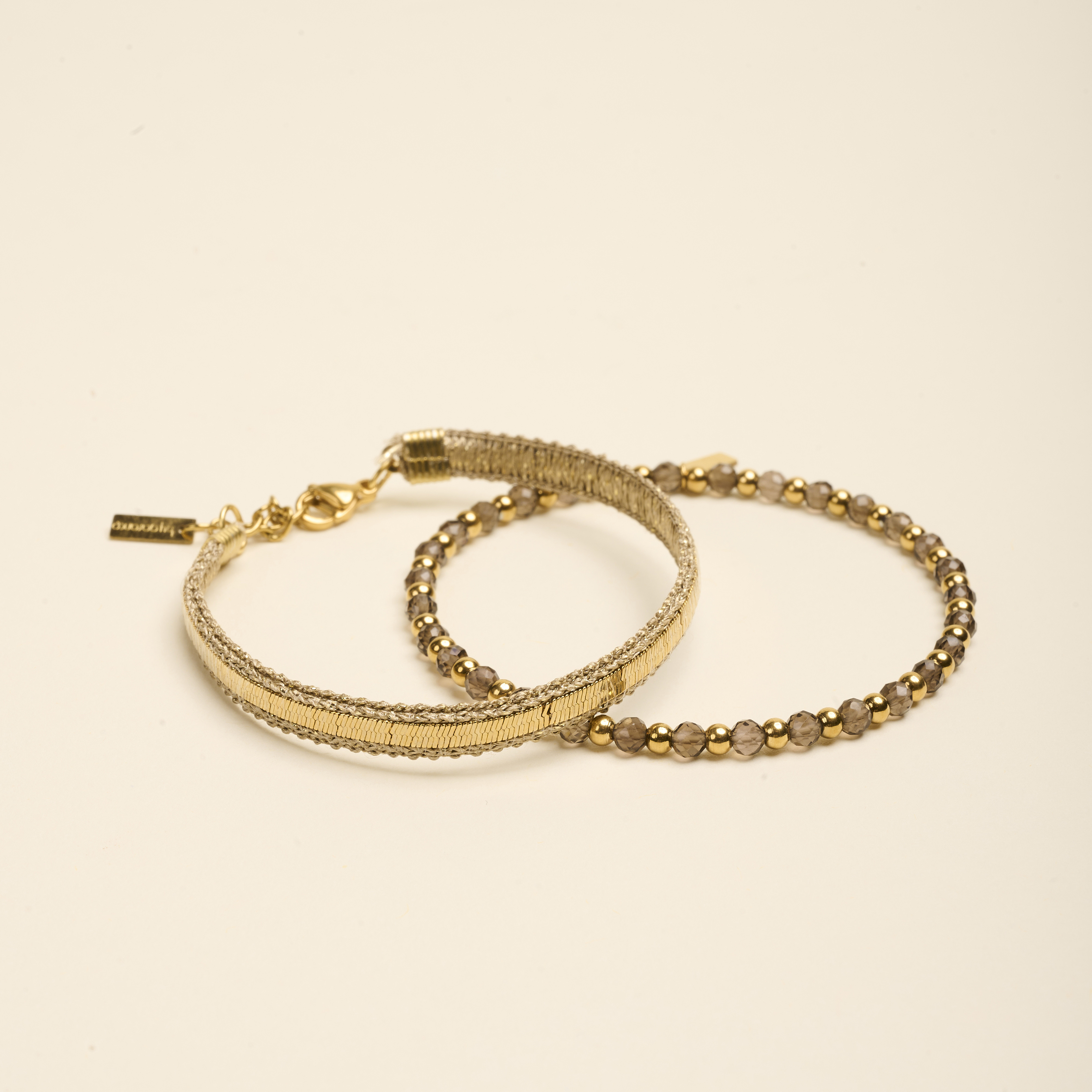 Le second est composé de petites perles facettées en quartz fumé de 3 mm, dont la teinte brun translucide capte délicatement la lumière. Monté sur un fil élastique solide, il s’ajuste facilement au poignet et se porte avec confort.