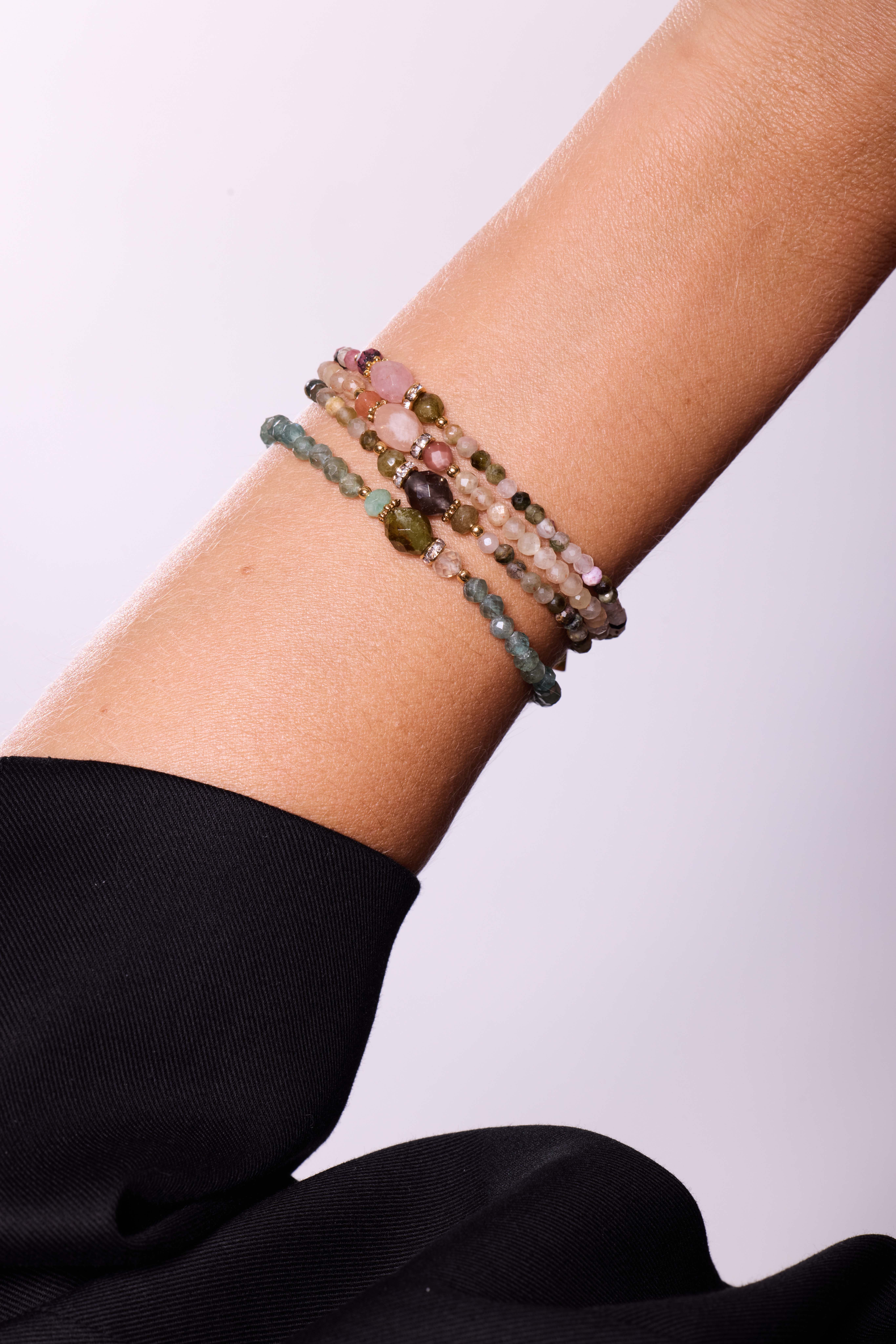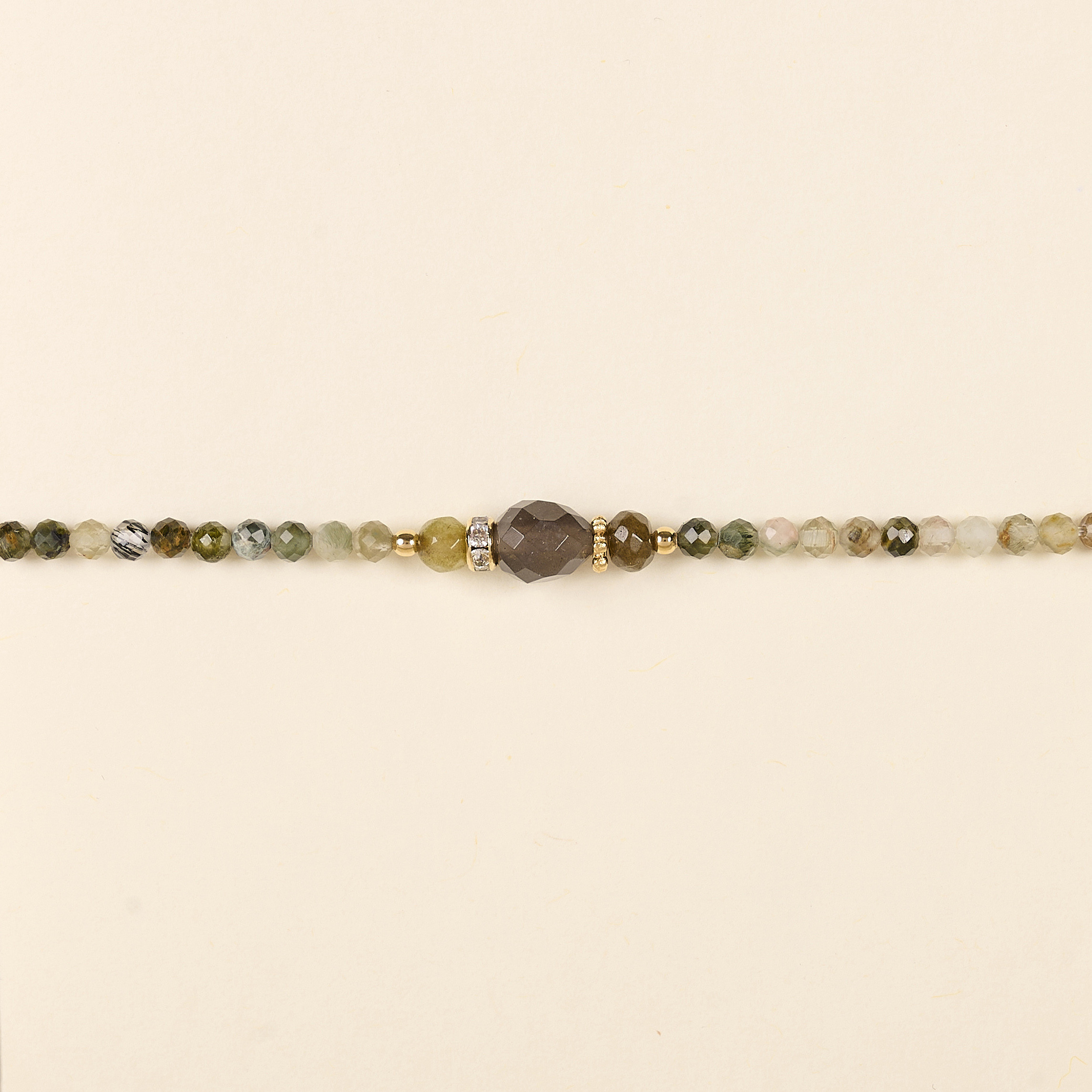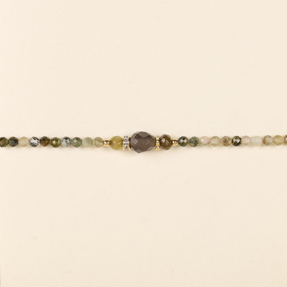 Le bracelet Bell associe des perles en grenat vert facettées à une pierre ovale en obsidienne.