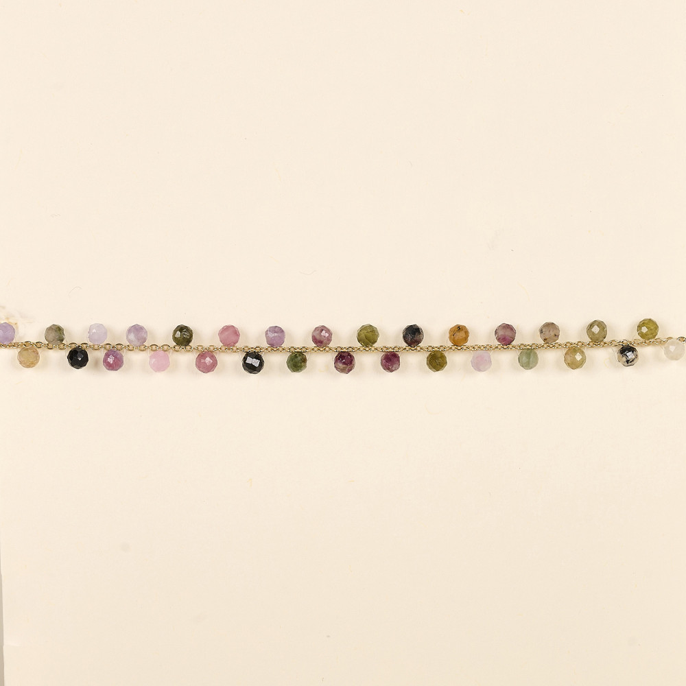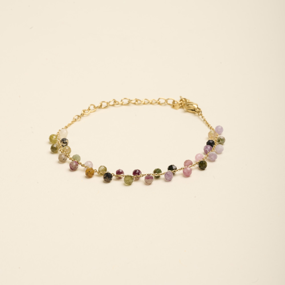 Le bracelet Bobi séduit par son raffinement et son éclat subtil. Il associe l’élégance des perles de tourmaline multicolore à la délicatesse d’une fine chaîne de 1 mm, créant un bijou à la fois lumineux et intemporel.