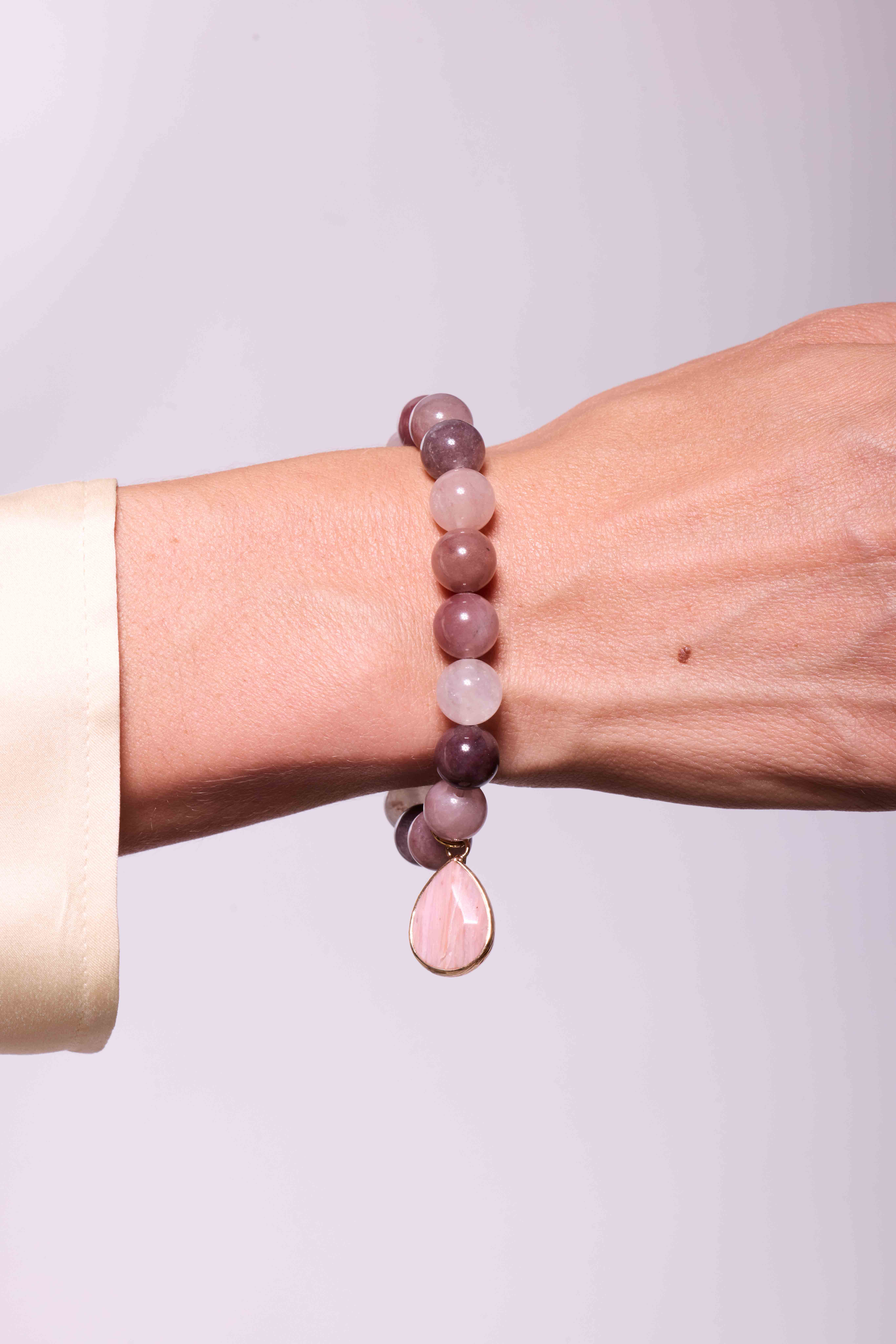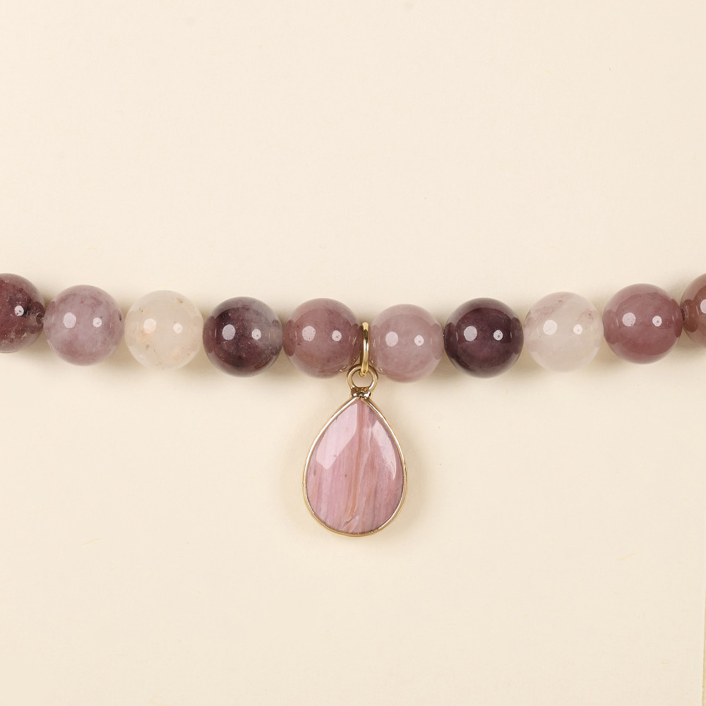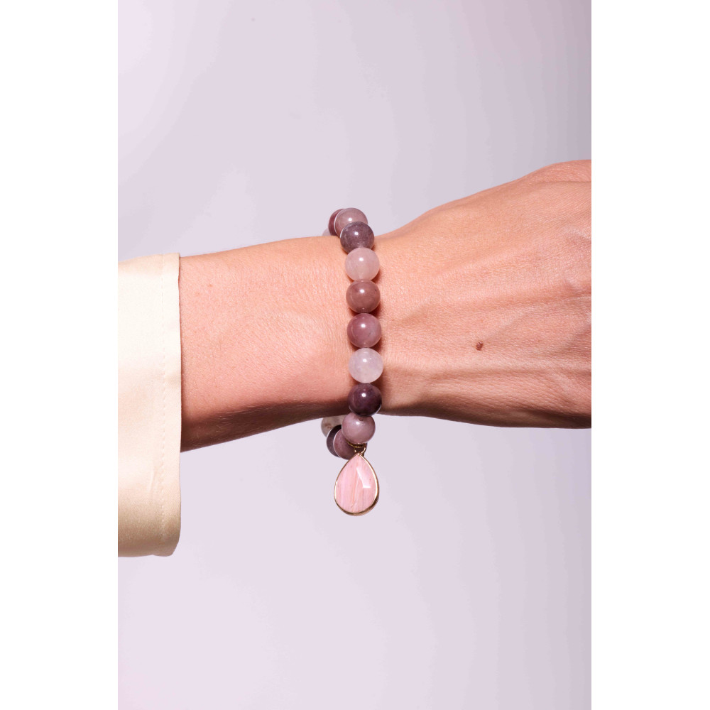Le bracelet Boqi associe des perles de 8mm de diamètre en quartz strawberry à un pendentif en forme de goutte en rhodonite.