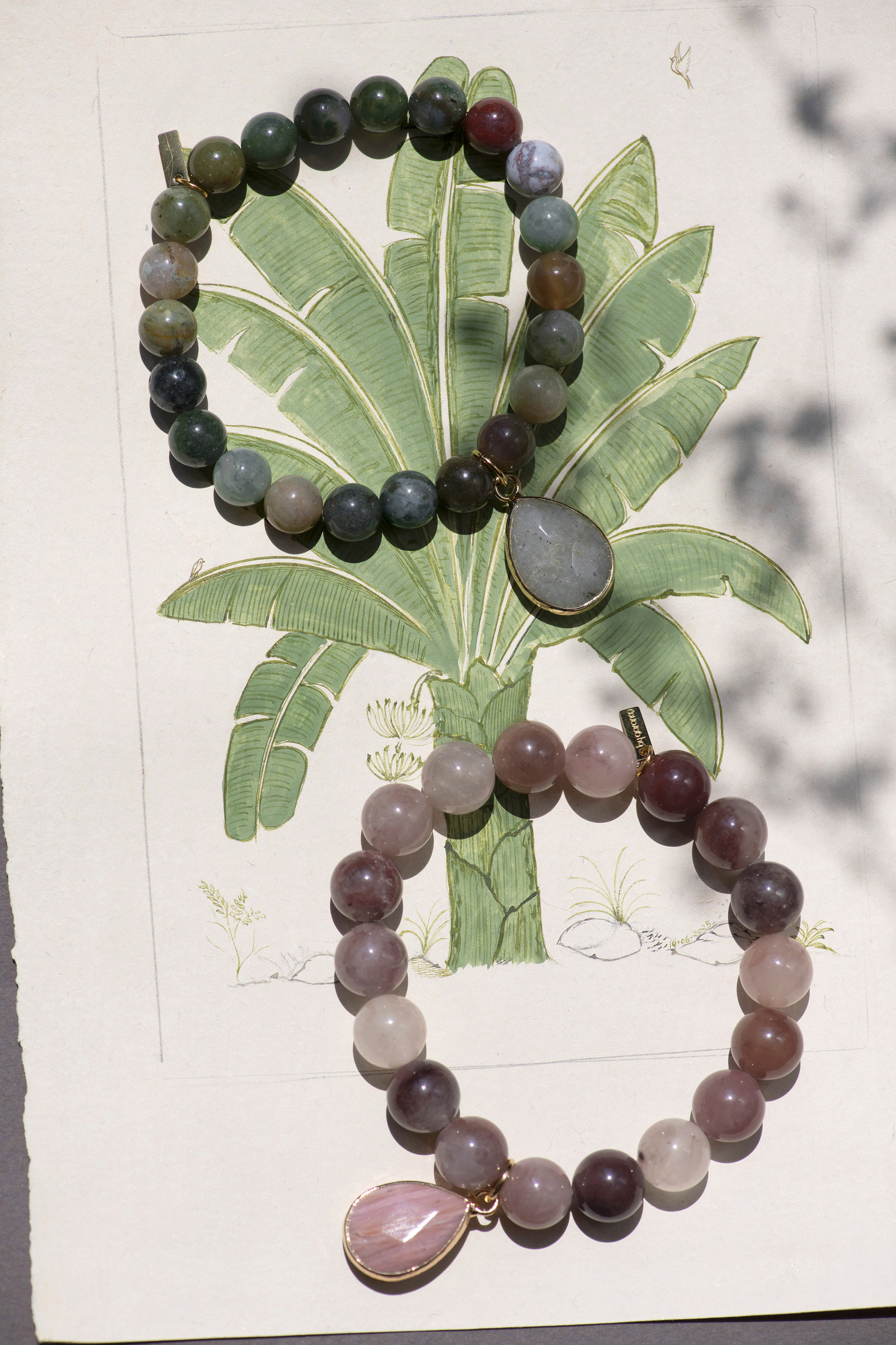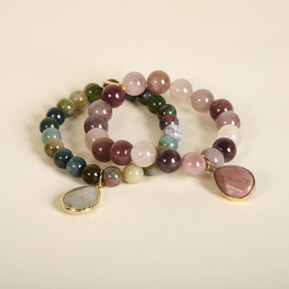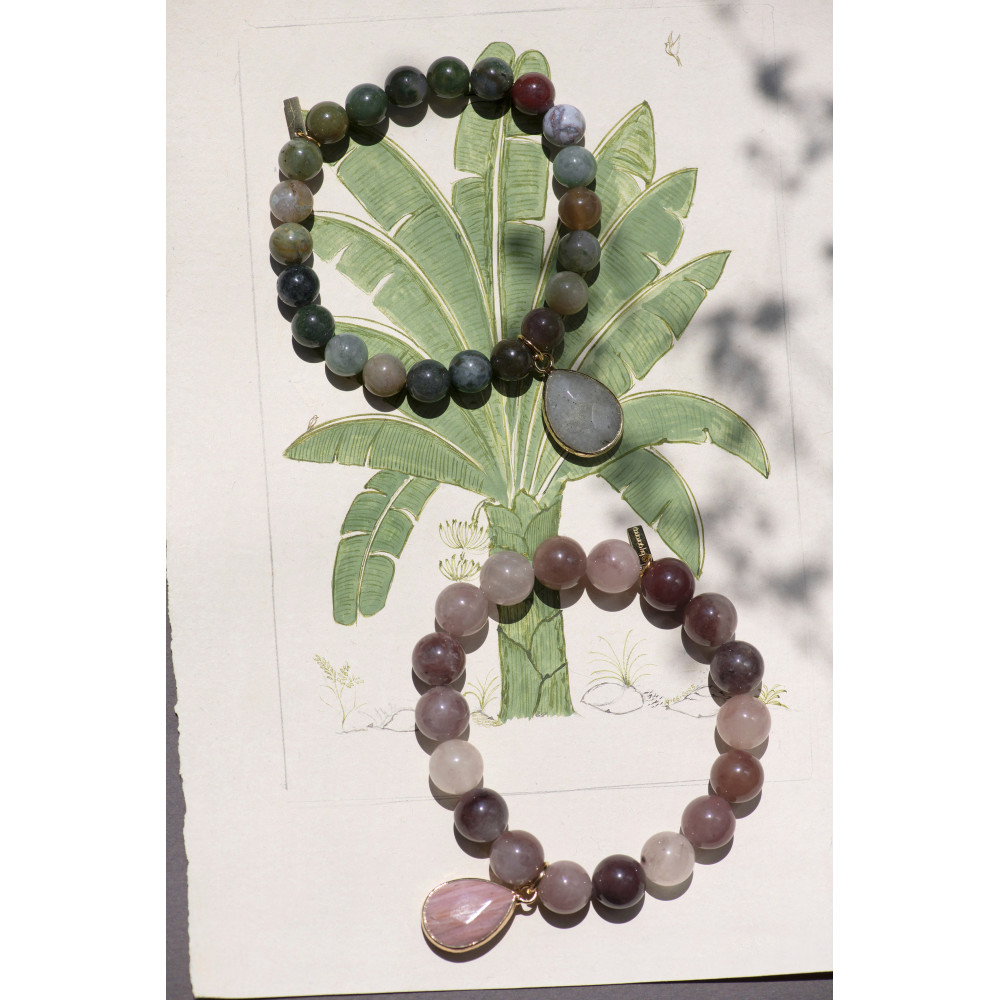 Le bracelet Boqi associe des perles de 8mm de diamètre en quartz strawberry à un pendentif en forme de goutte en rhodonite.