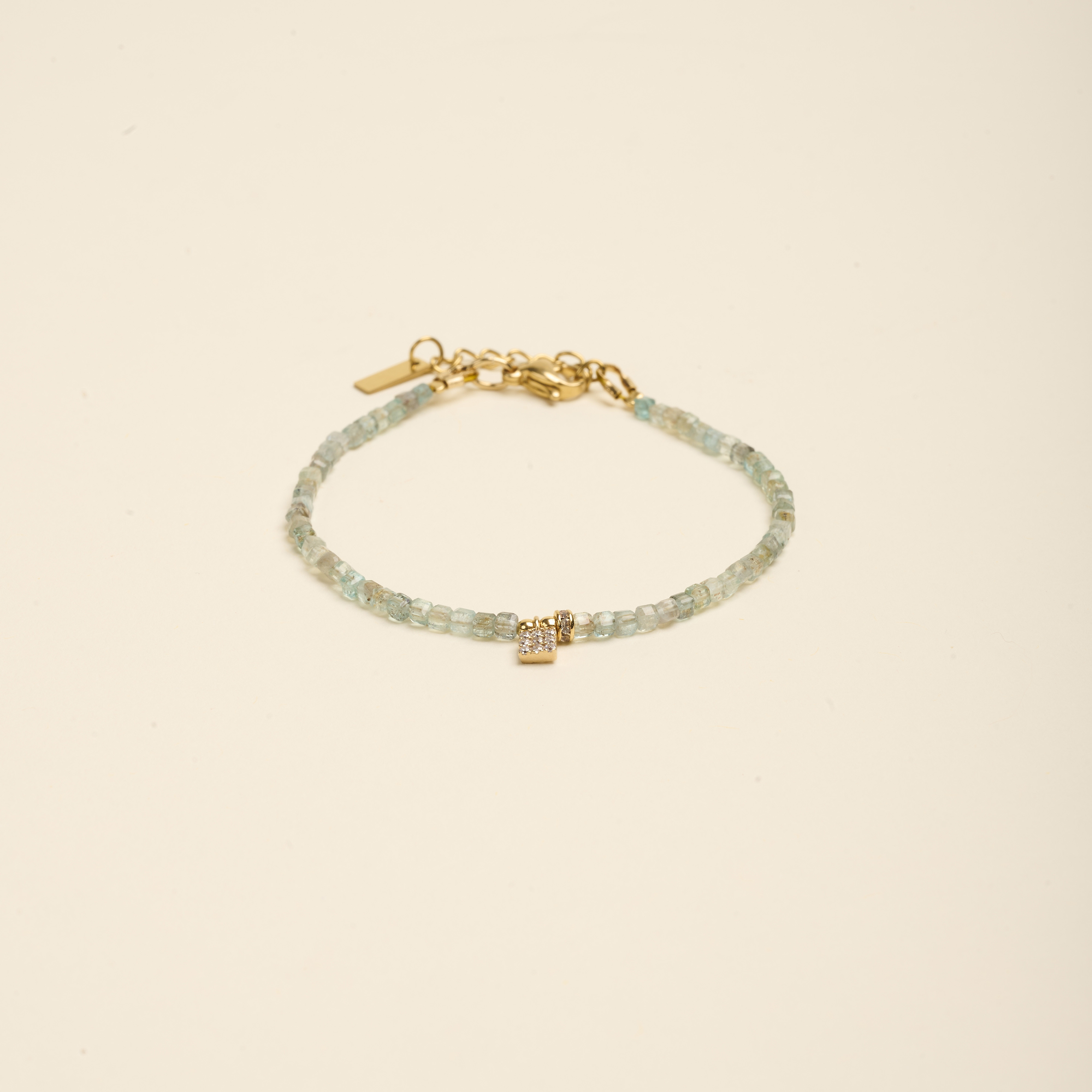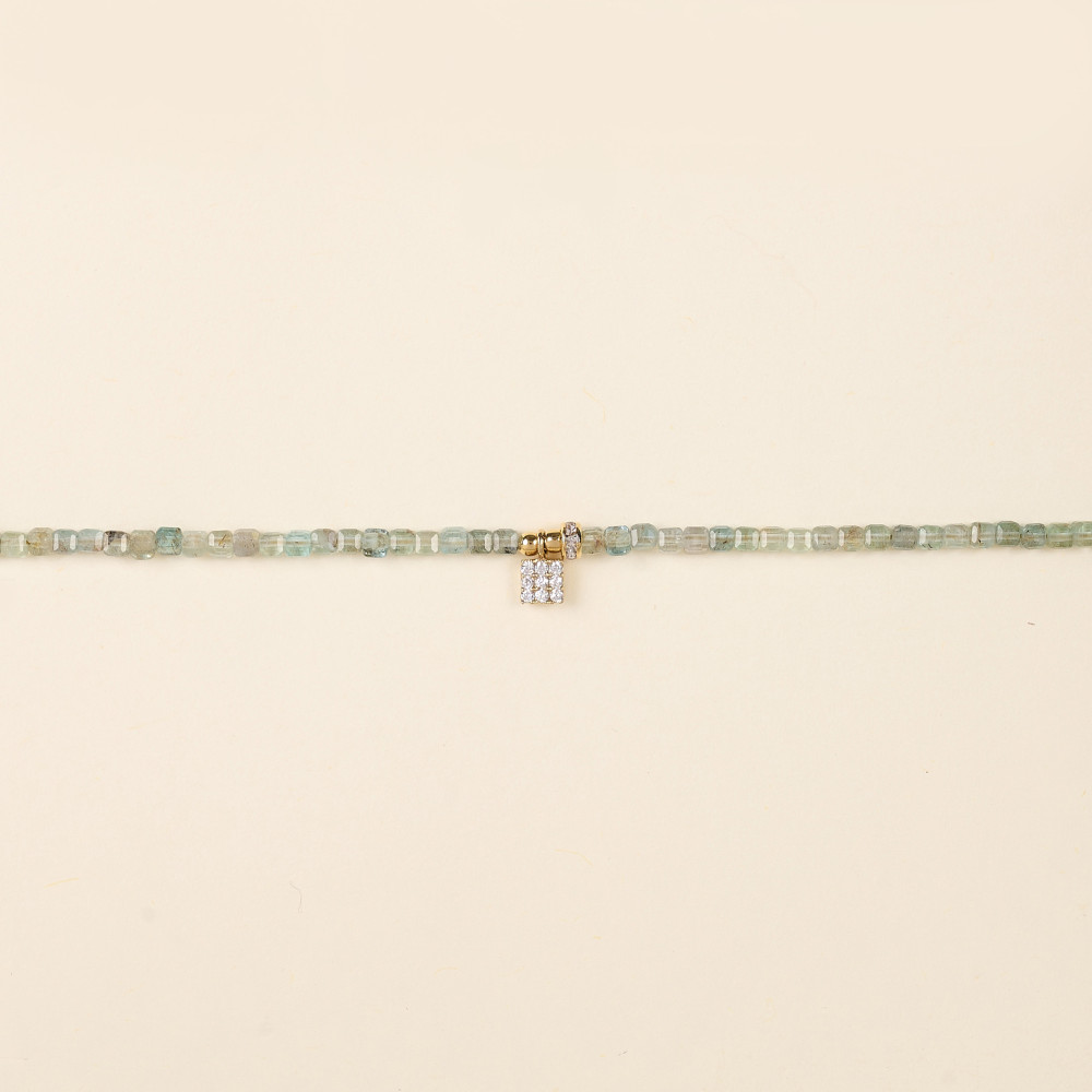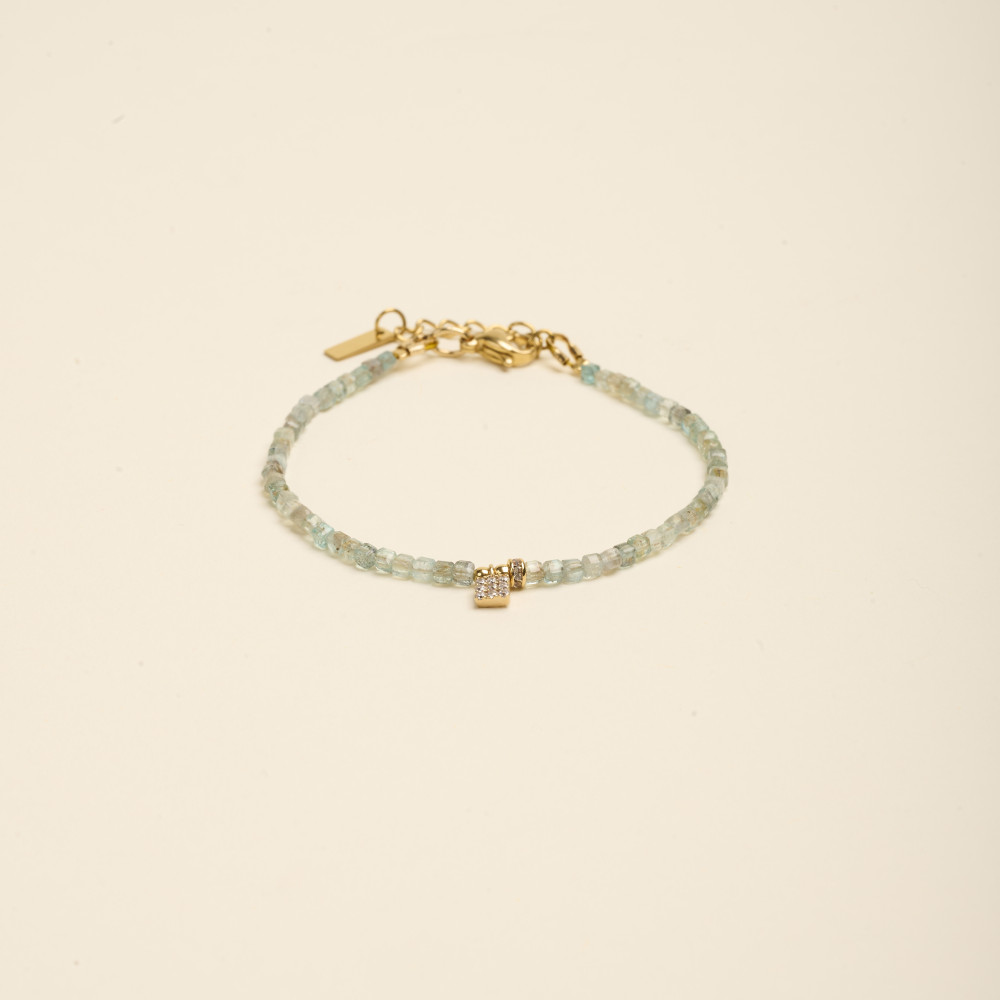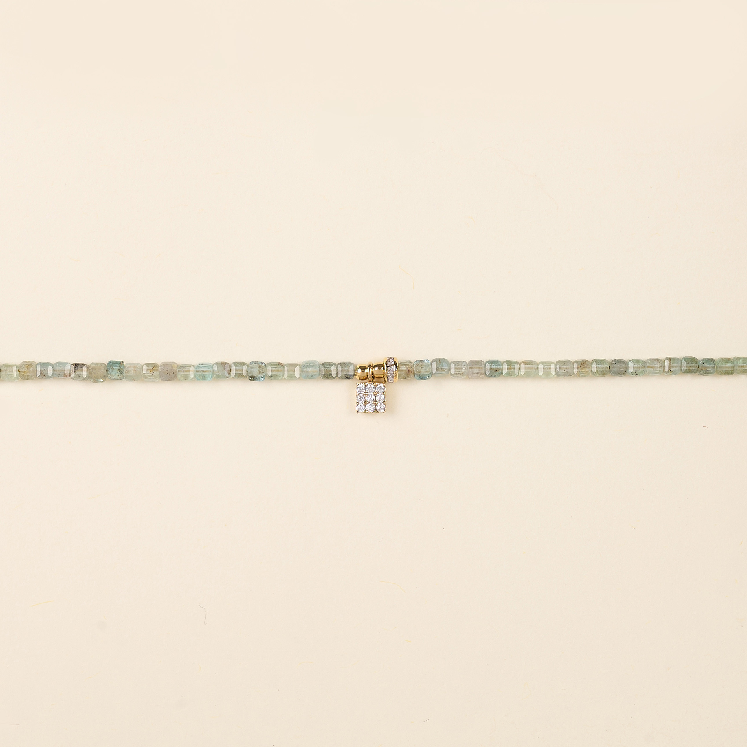 Ce bracelet raffiné associe l'élégance des perles d'apatite bleues carrées facettées à un pendentif carré apportant une touche de raffinement.