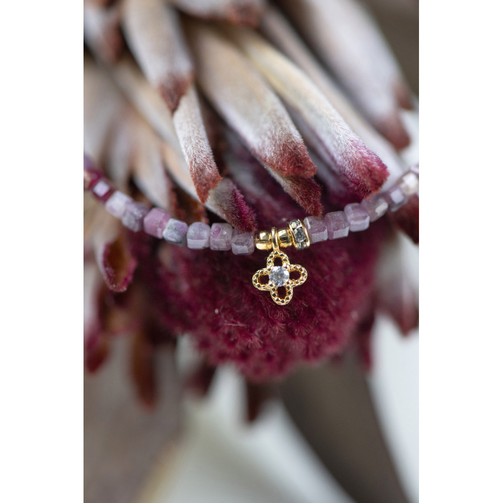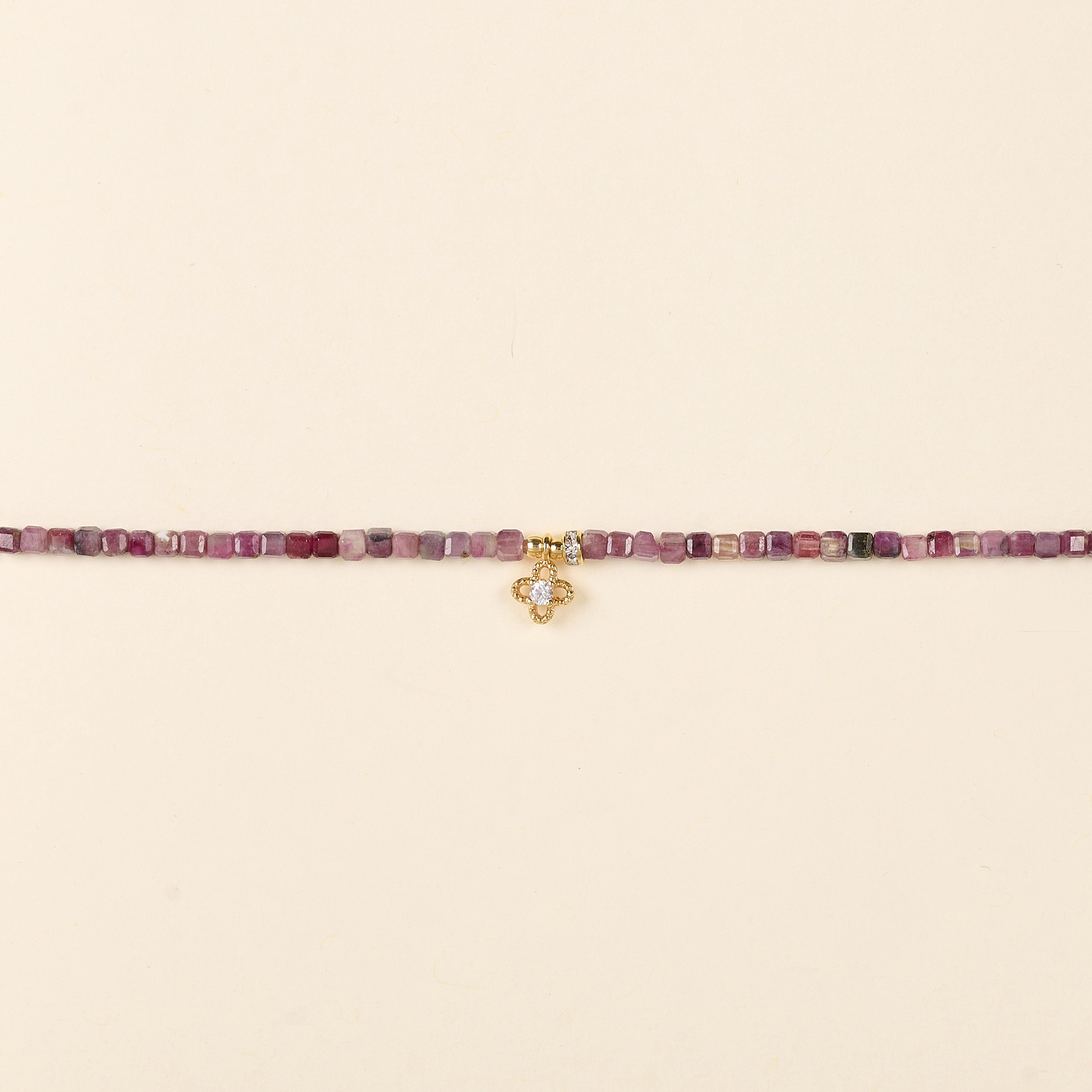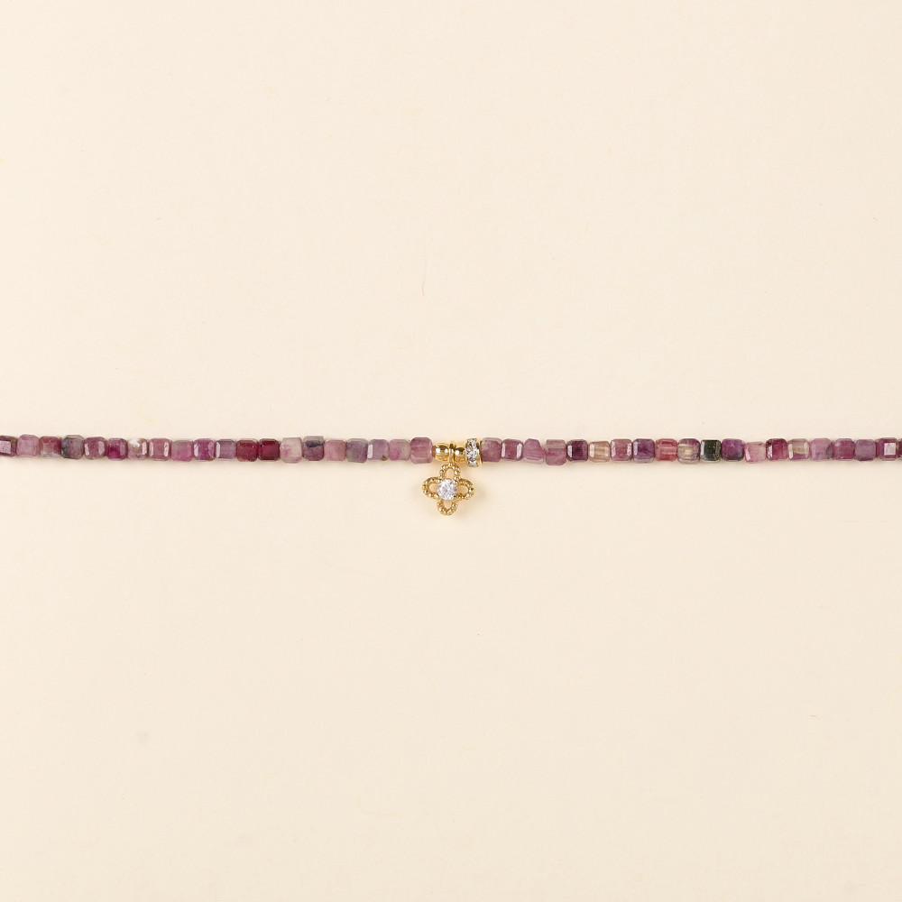 Ce bracelet raffiné associe l'élégance des perles de tourmaline bordeaux carrées facettées à un pendentif en forme de trèfle apportant une touche de raffinement.