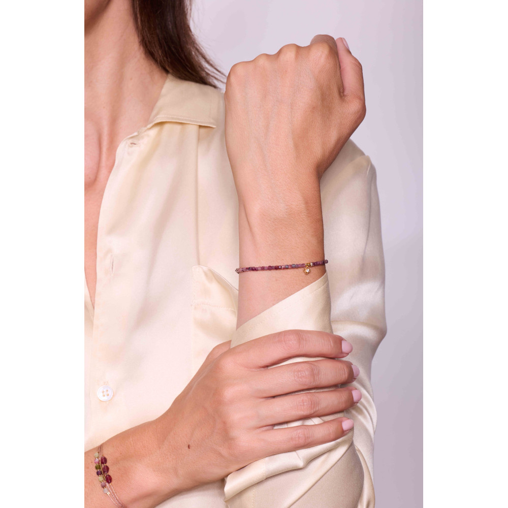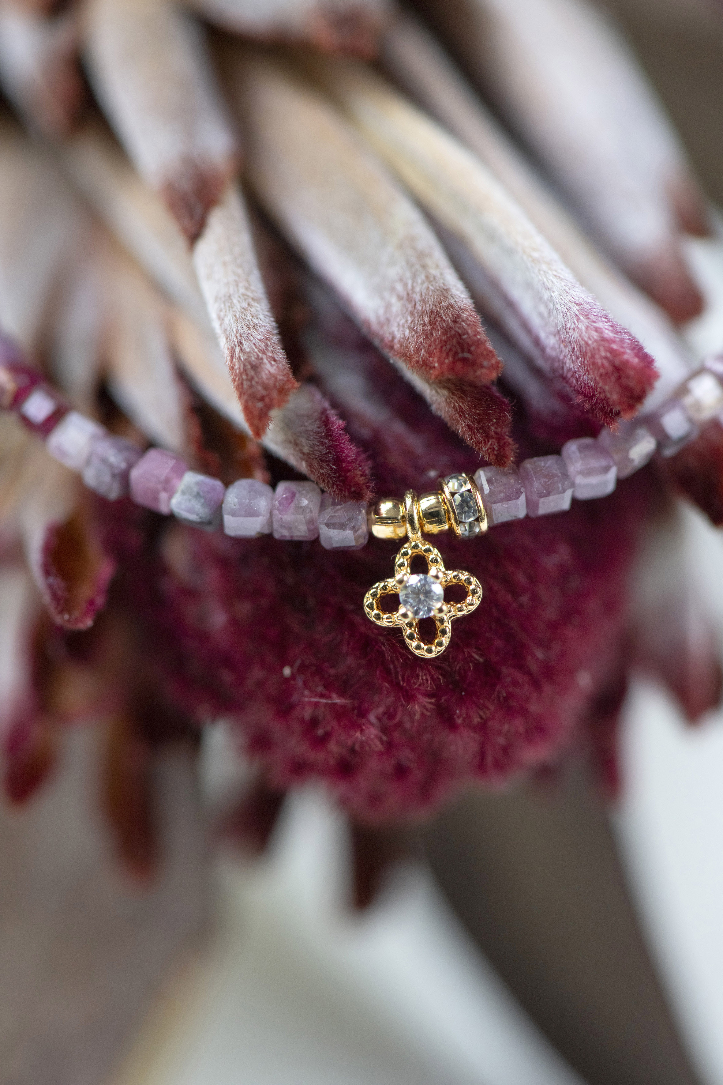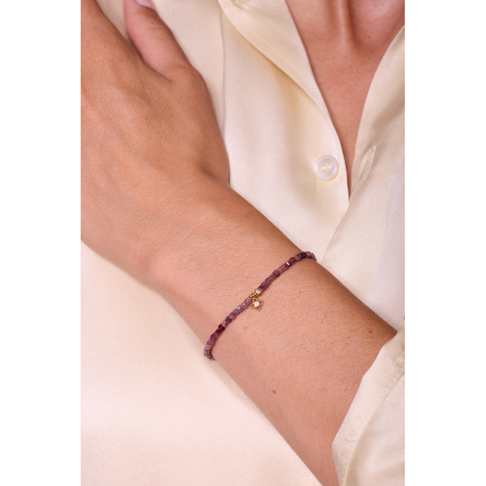 Ce bracelet raffiné associe l'élégance des perles de tourmaline bordeaux carrées facettées à un pendentif en forme de trèfle apportant une touche de raffinement.