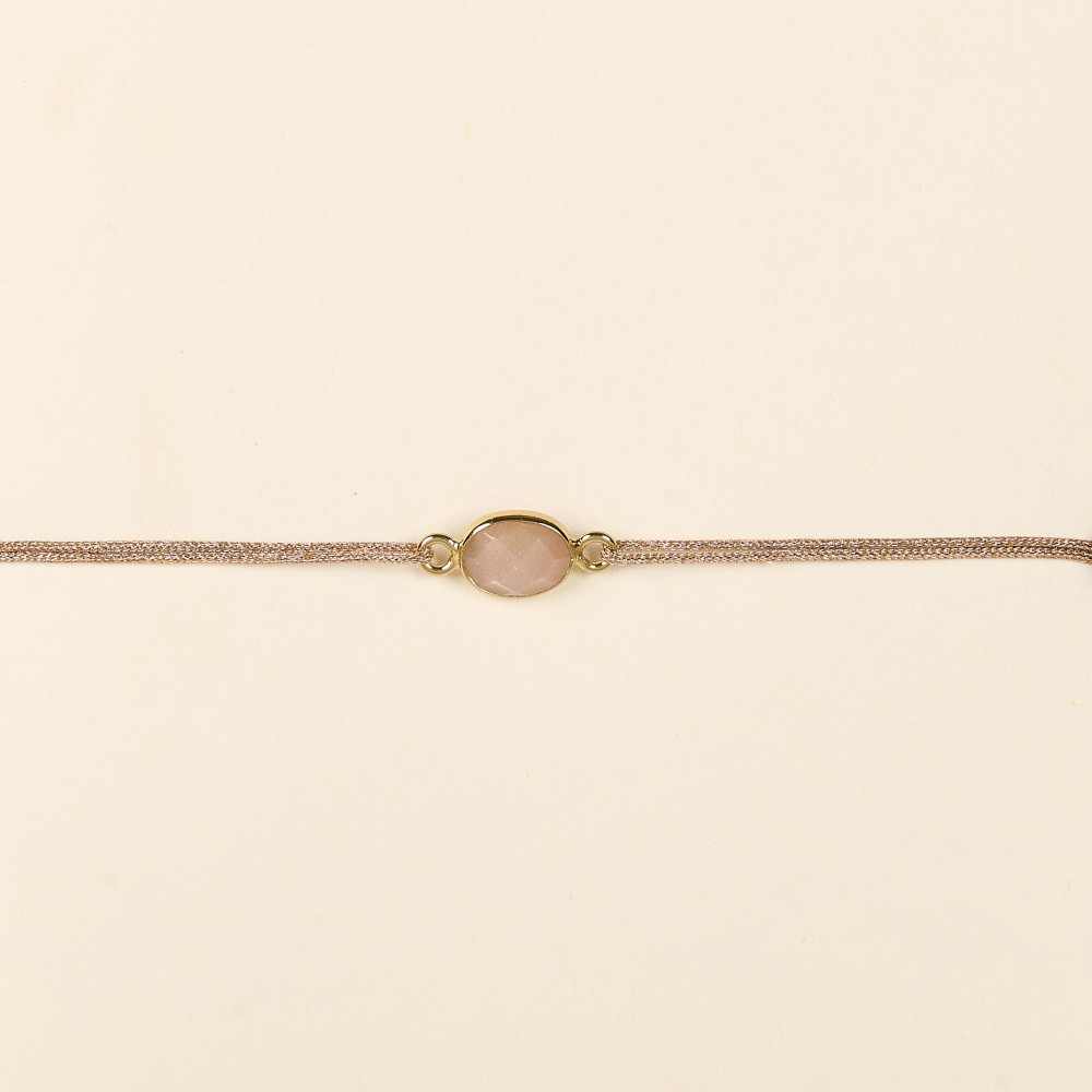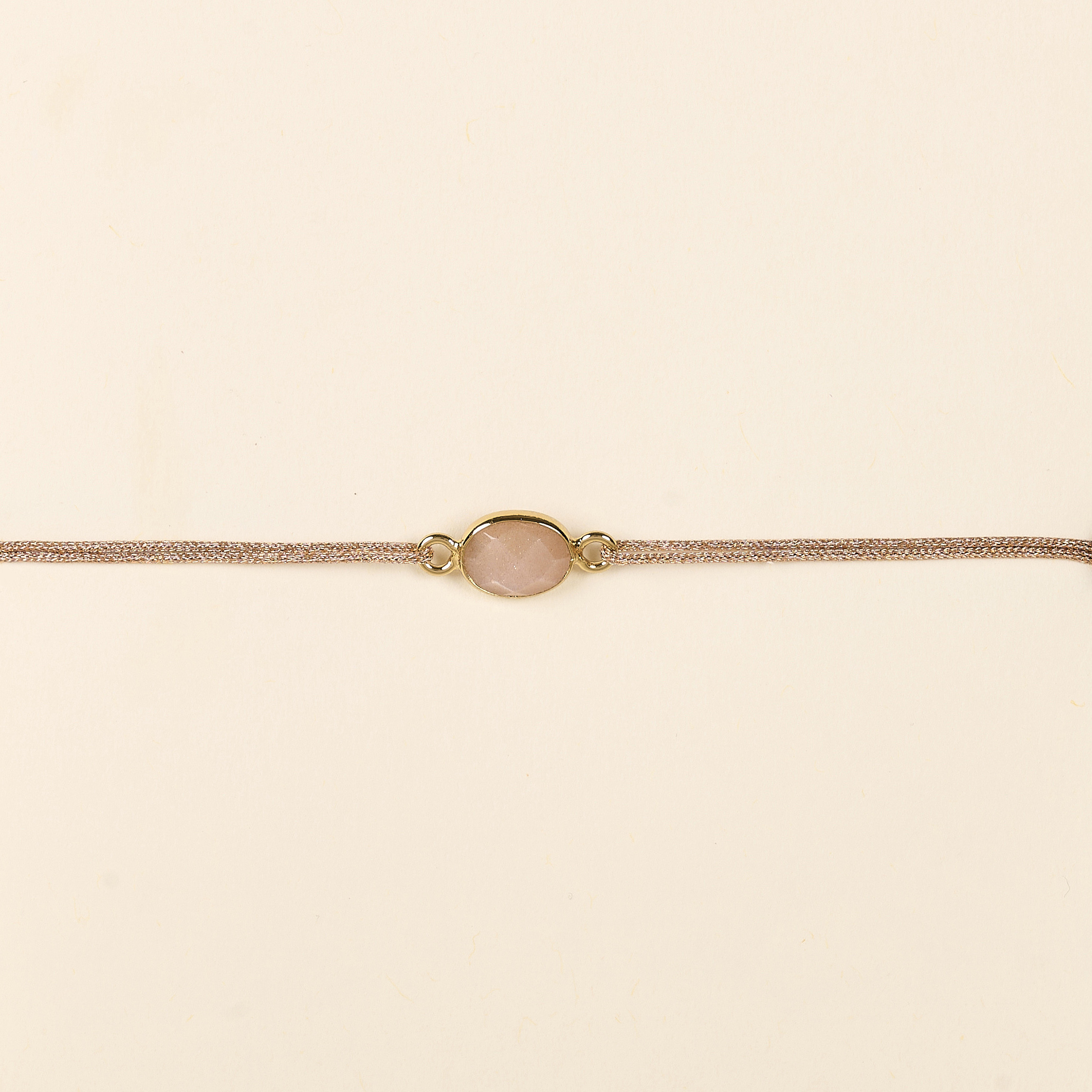 Il associe une pierre ovale serti clos en pierre de lune pêche et un fin cordon en lurex.