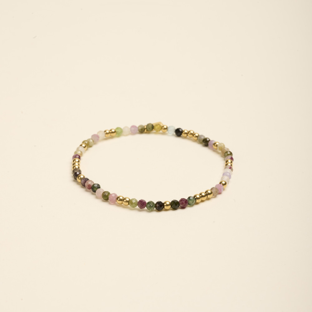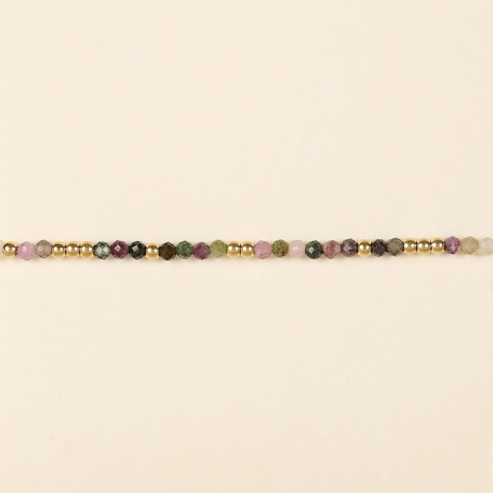 Le bracelet Cris associe des perles en tourmaline multicolore facettées à des perles en acier doré.