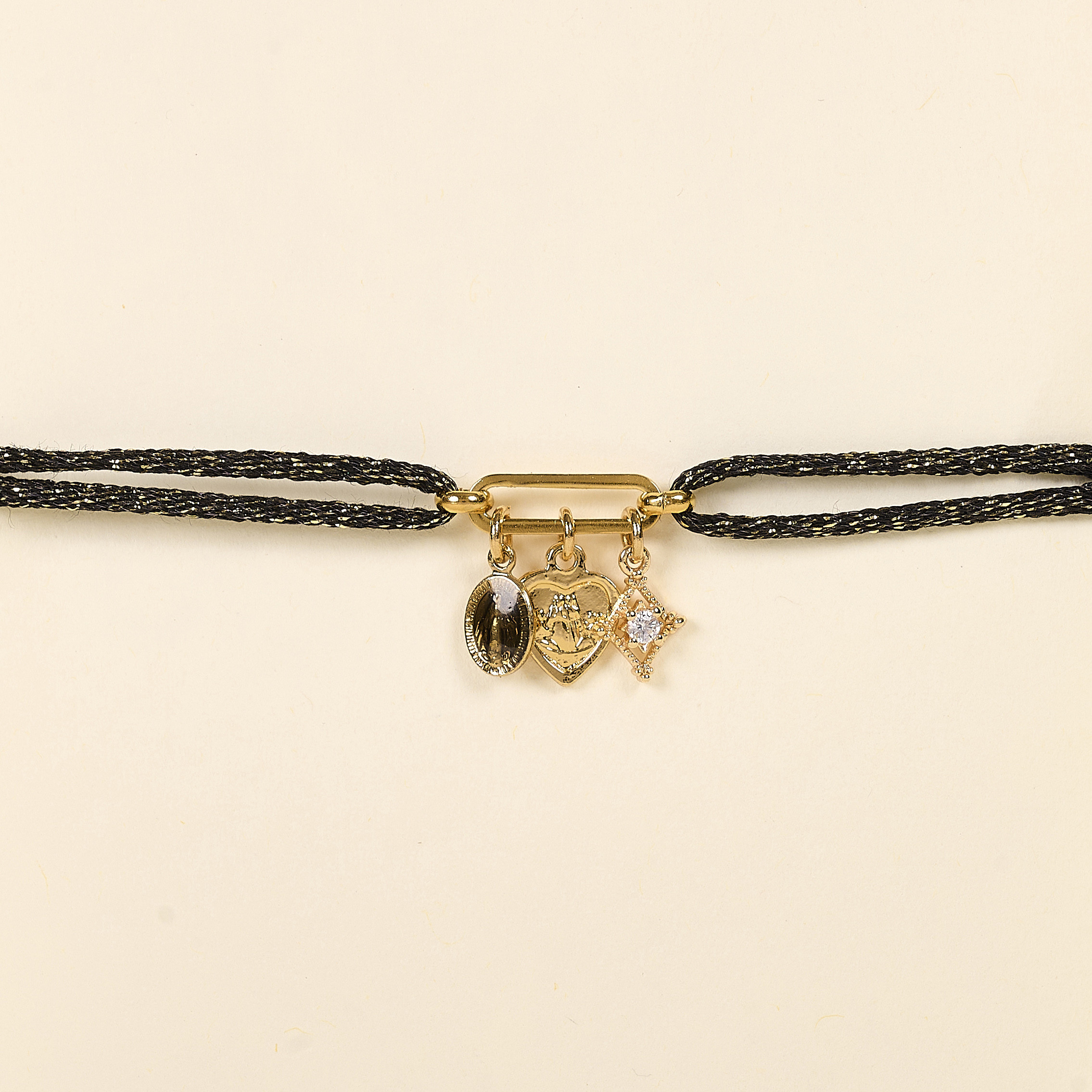 Au centre, un maillon rectangulaire aux angles arrondis accueille trois charms délicats : une petite médaille miraculeuse émaillée représentant la Vierge, un cœur orné de la Vierge Marie Sarah en hommage aux Saintes-Maries-de-la-Mer, et une médaille en forme de losange sertie d’un oxyde de zirconium, qui apporte une touche lumineuse et raffinée.