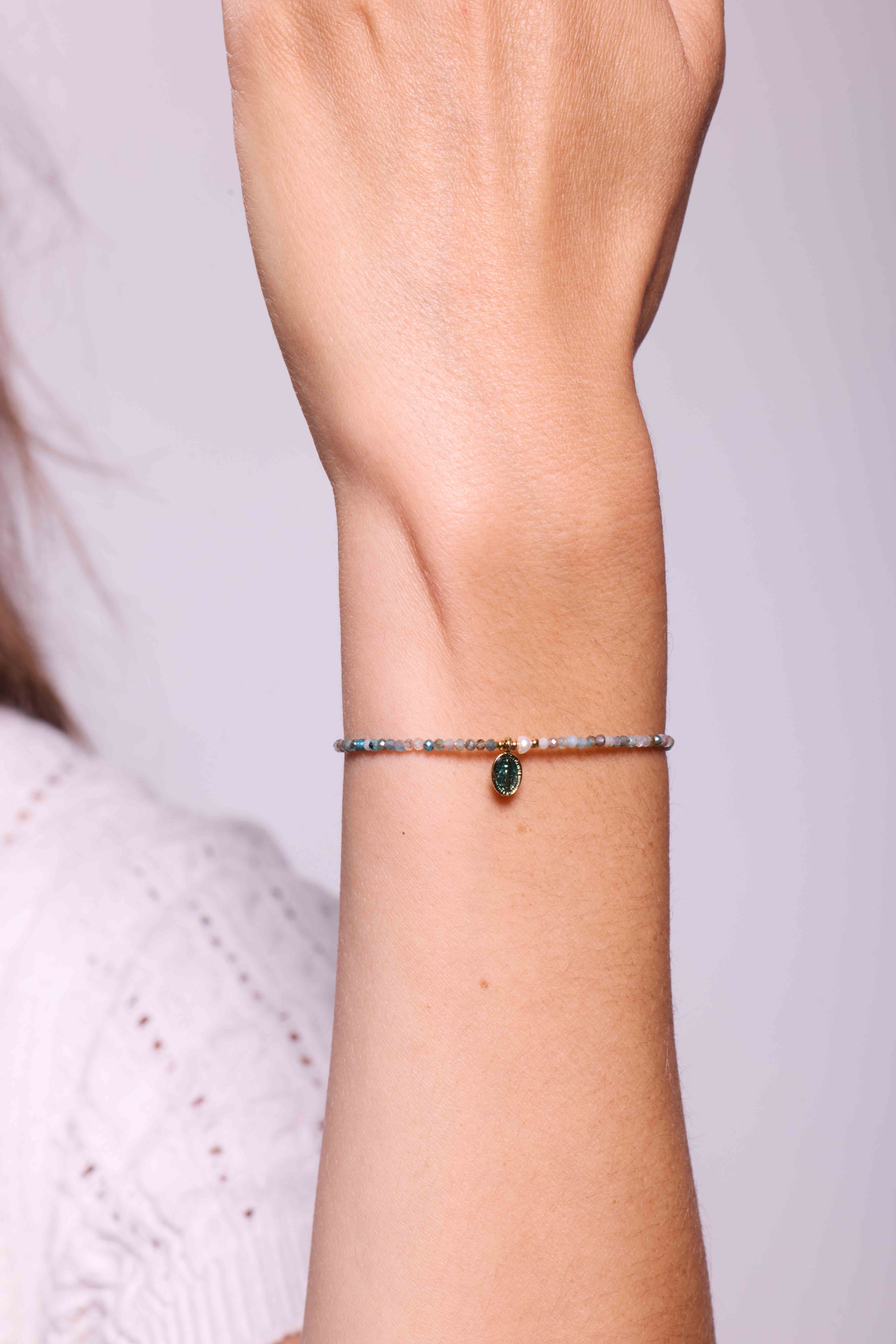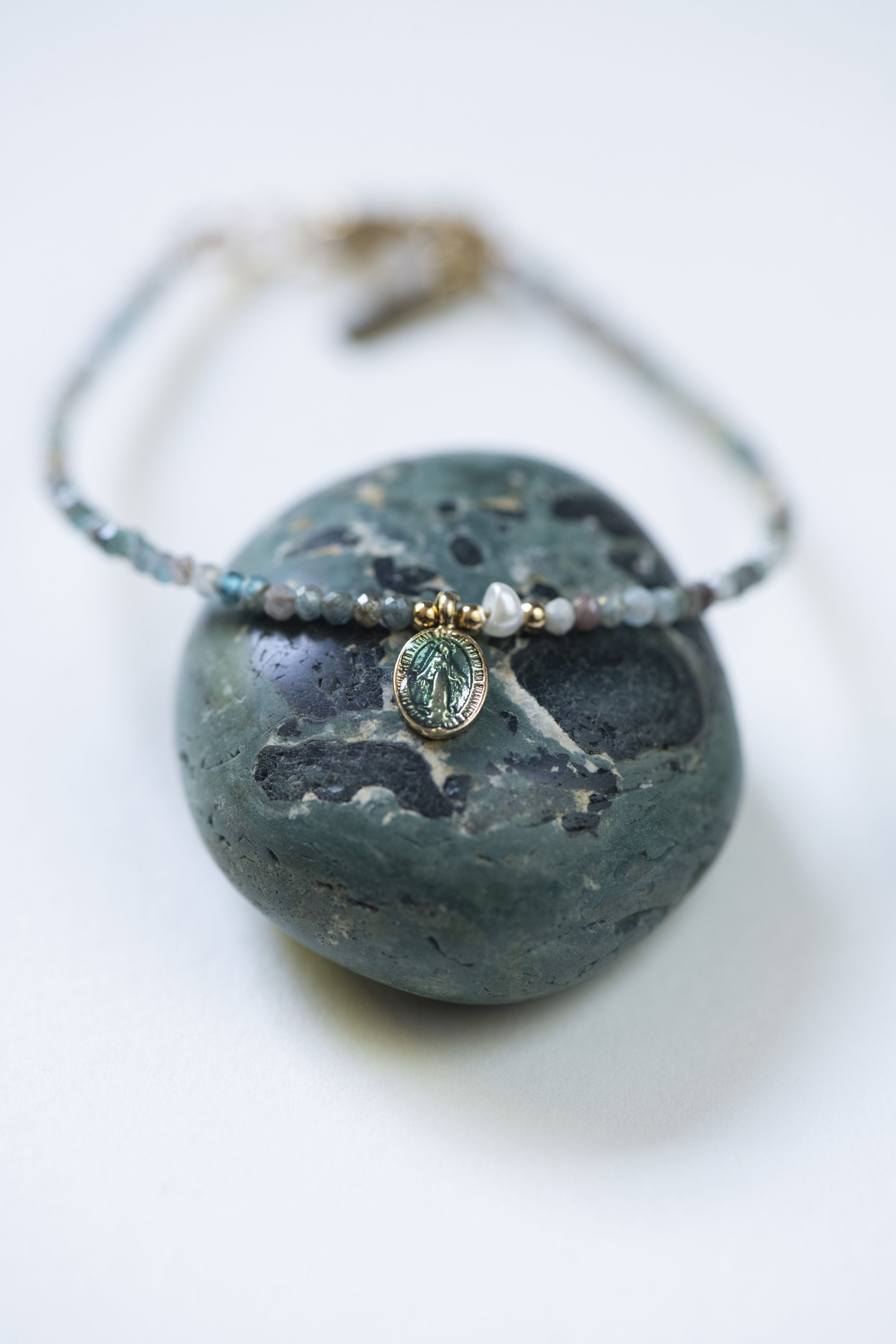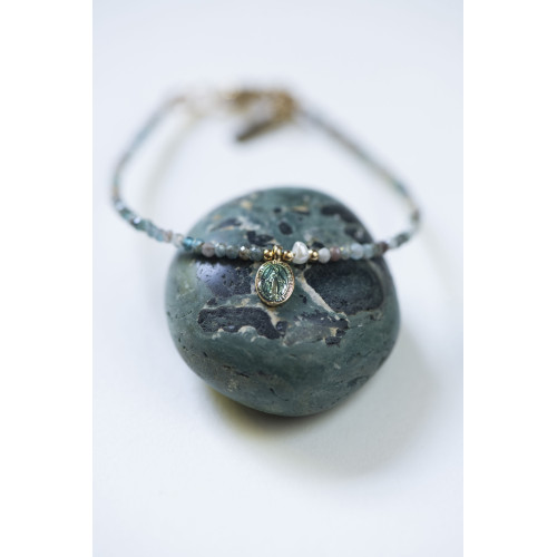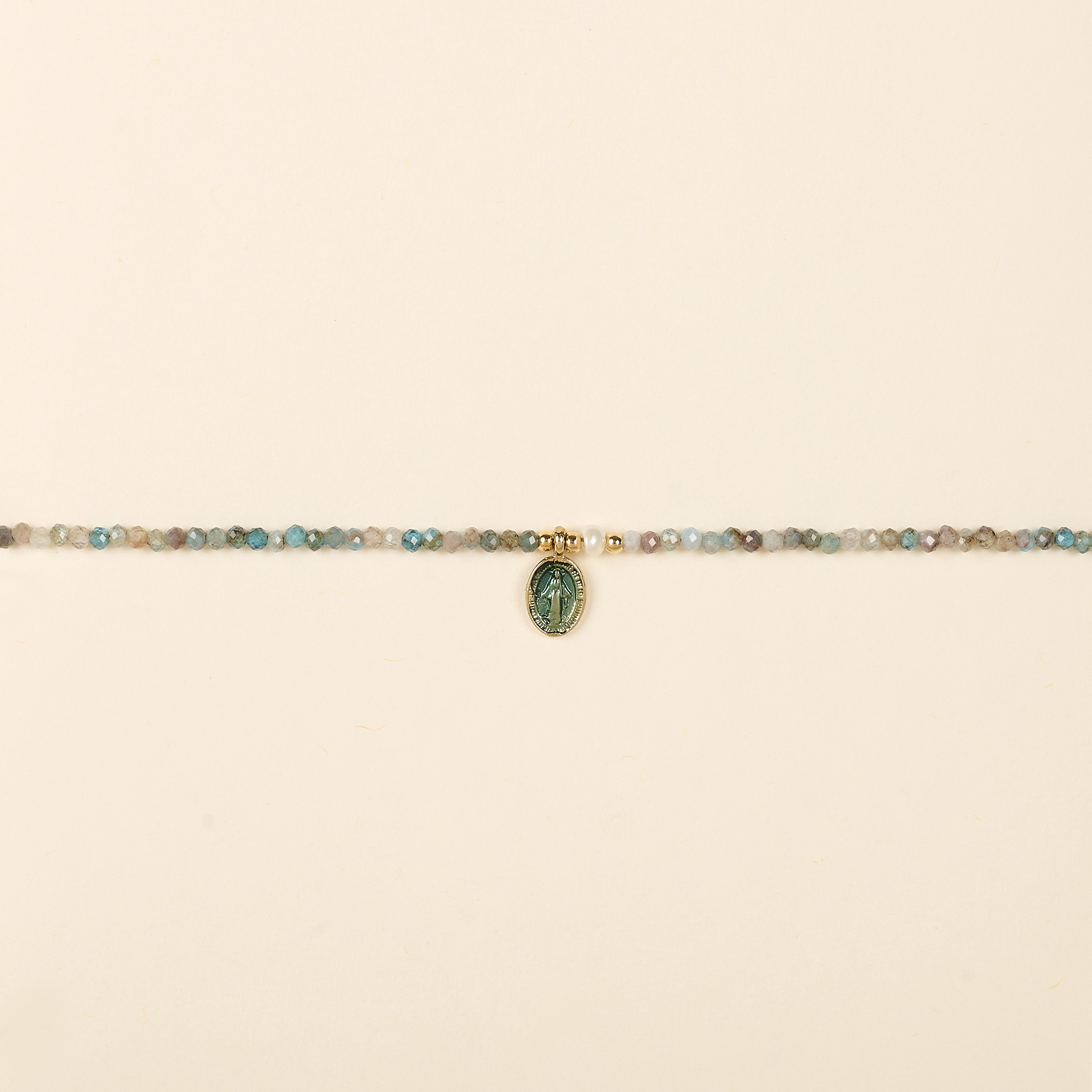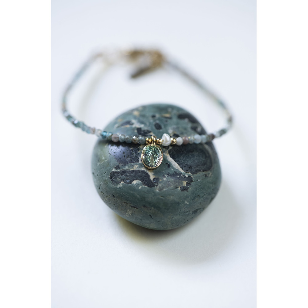 Ce bracelet raffiné associe l’élégance des perles d’apatite céladon facettées, des perles de culture et d’une médaille miraculeuse émaillée à la main dans notre atelier, apportant une touche de protection symbolique.