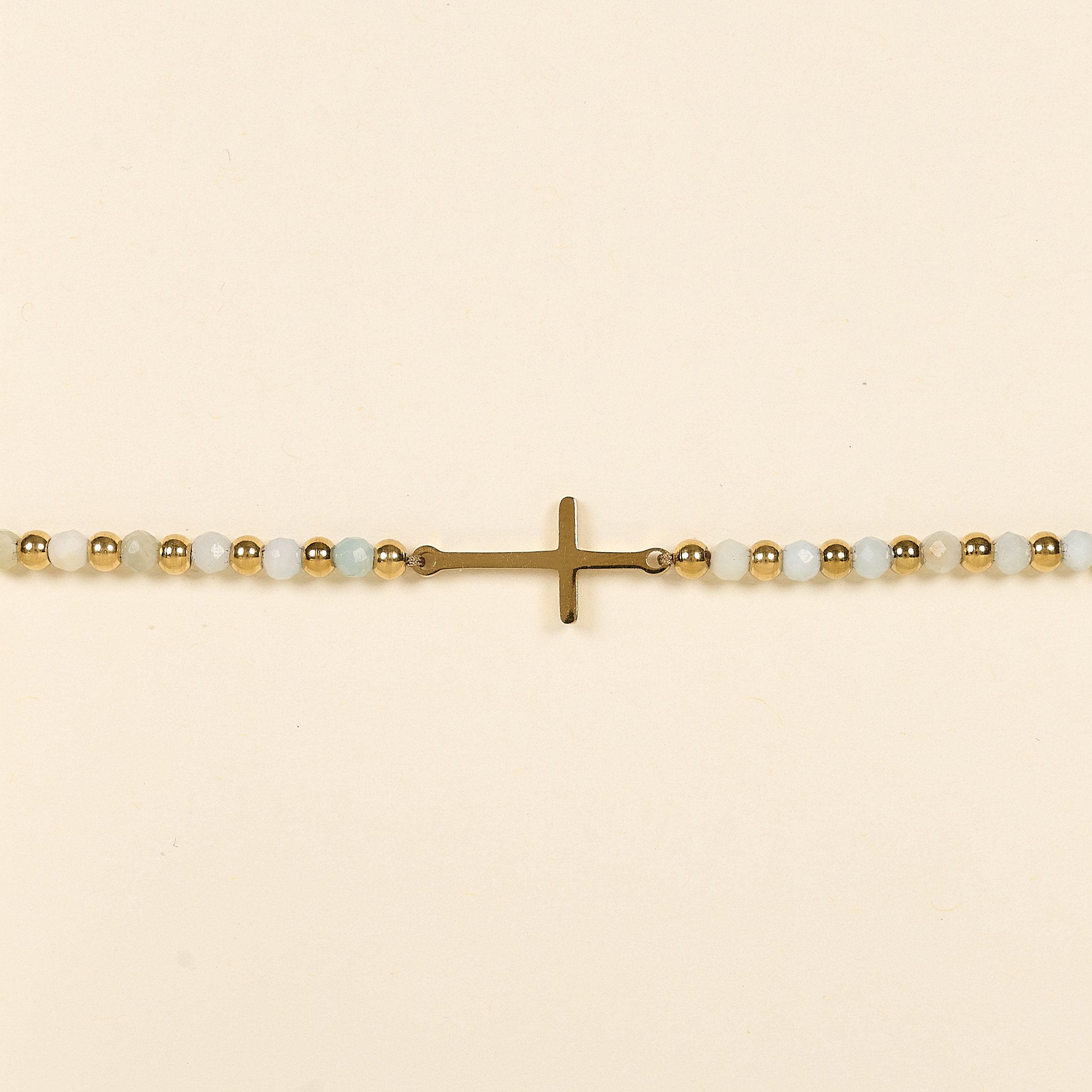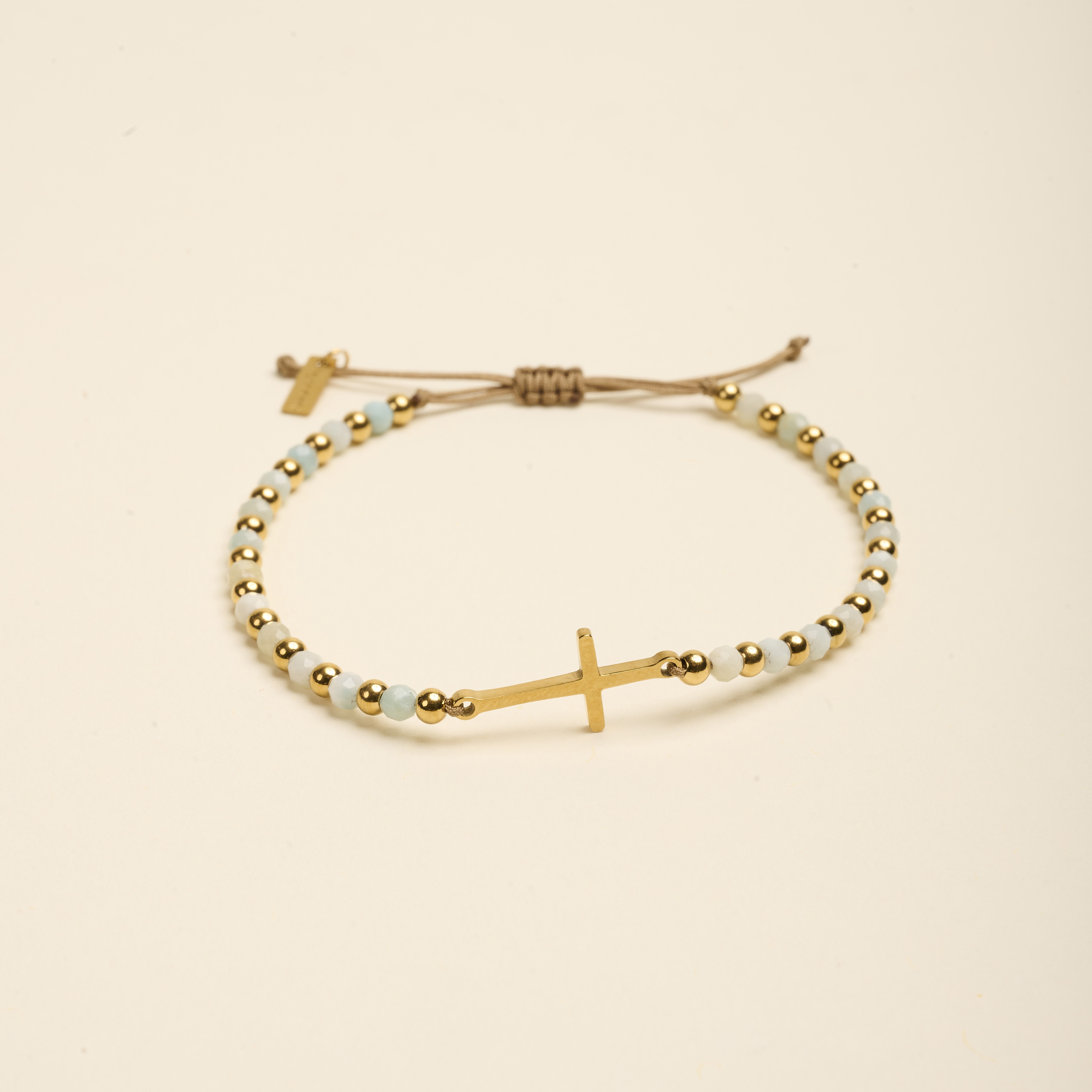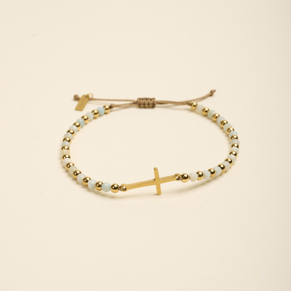 Le bracelet Luka Blanc associe la pureté des pierres fines d’agate blanche à l’éclat des perles dorées. Sa croix en acier inoxydable doré apporte une touche spirituelle et élégante, pour un bijou à la fois discret et lumineux.