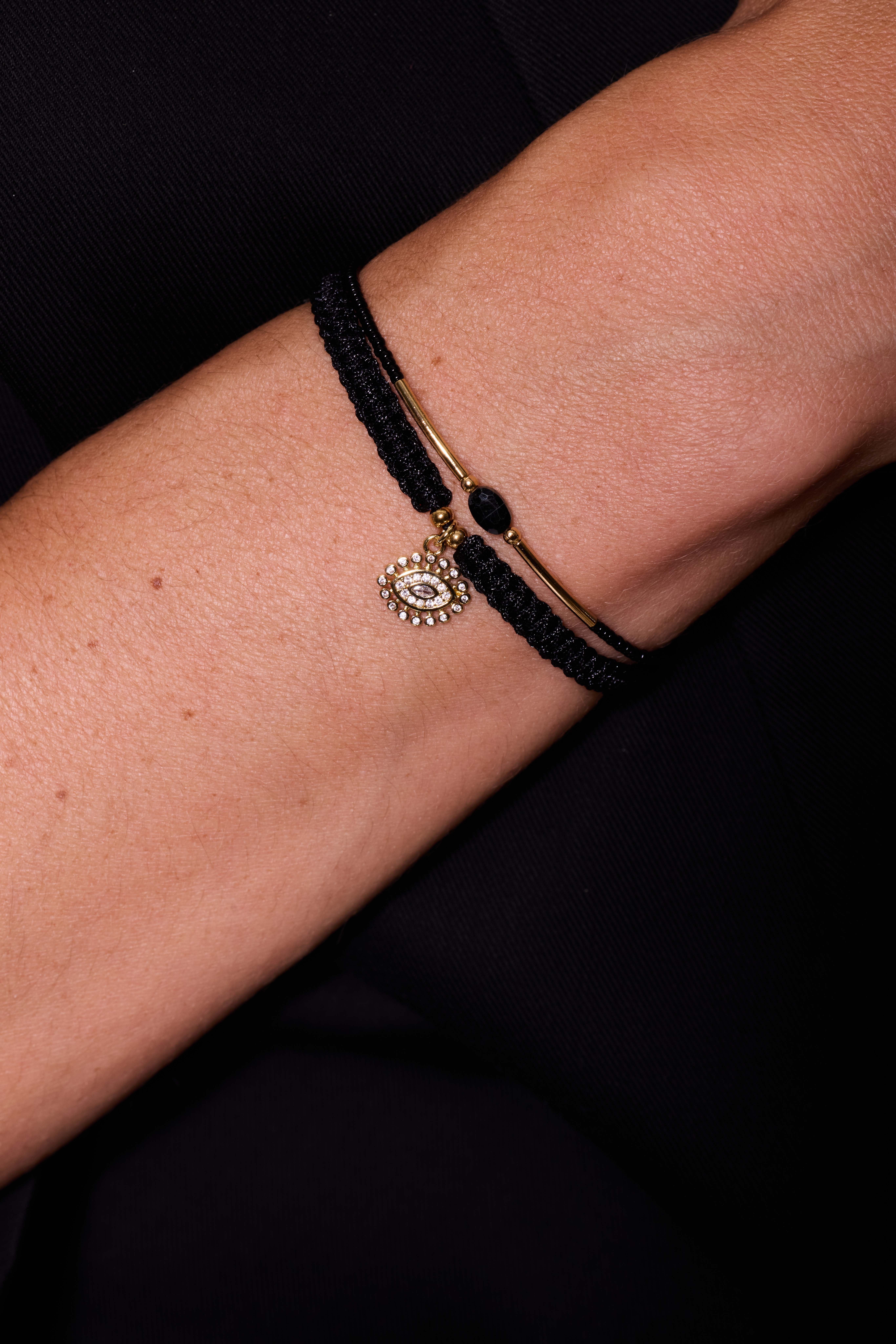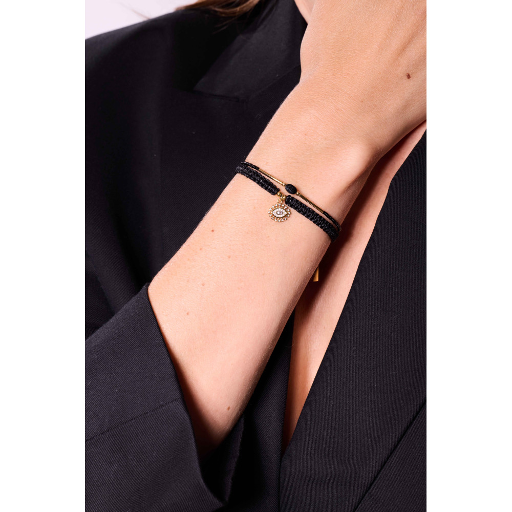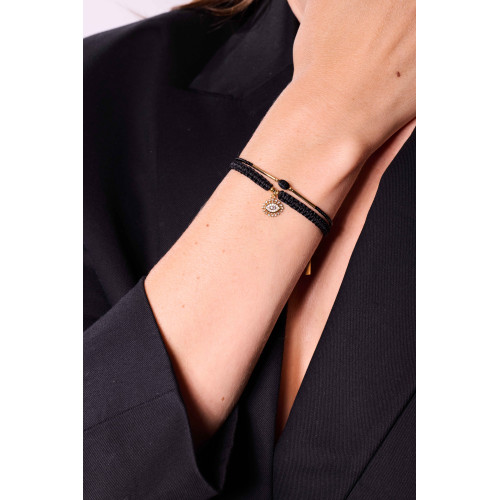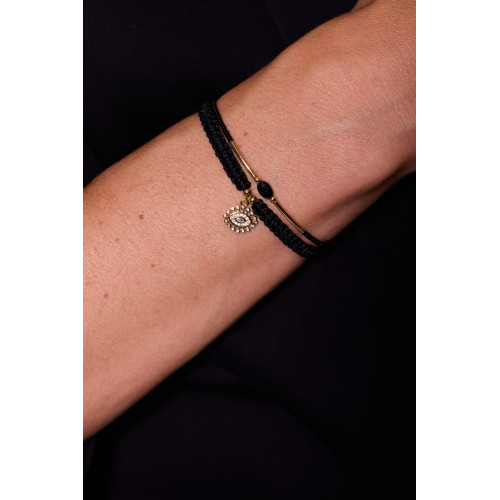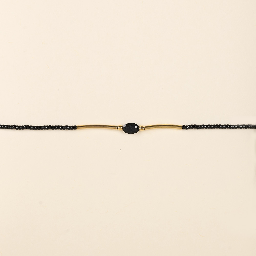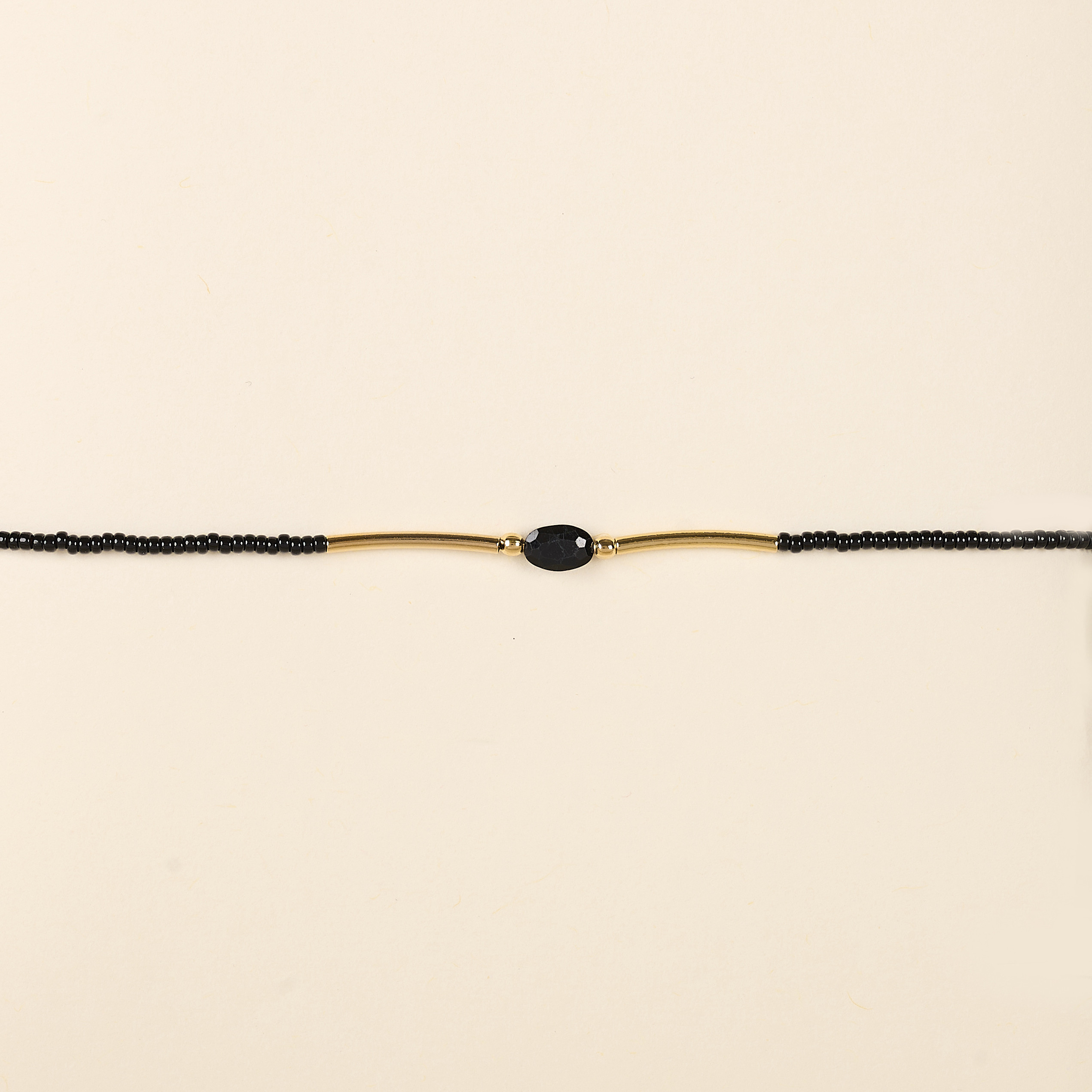 Le bracelet Nala G est un modèle une tour monté sur un câble fin doré. Il est orné d’une pierre ovale en agate noire au centre, entourée de perles noires facettées. Réalisé en acier doré inoxydable et pierres naturelles, il allie simplicité et élégance.