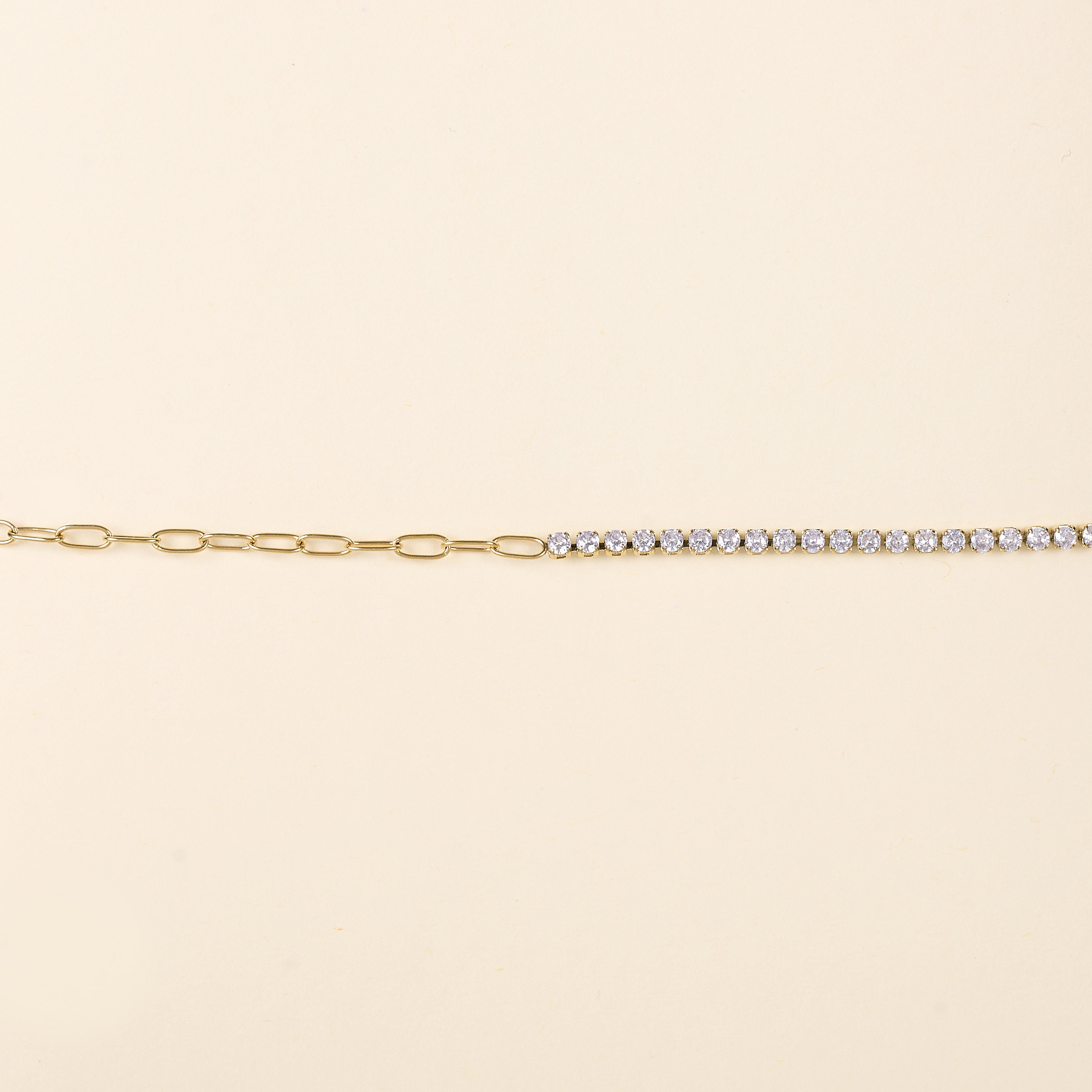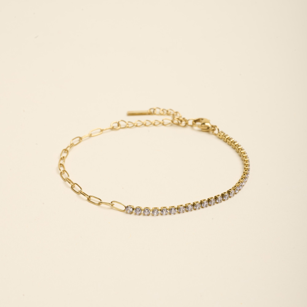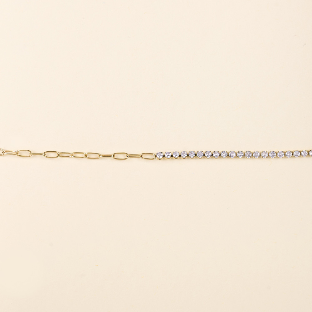 Le bracelet alterne harmonieusement des mailles rectangulaires et des mailles de type tennis, formées d’une succession de cristaux d’oxyde de zirconium. D’une longueur de 14 cm, il est complété par une chaîne de rallonge qui lui permet de s’adapter à tous les poignets. Confectionné en acier, il allie élégance et durabilité.