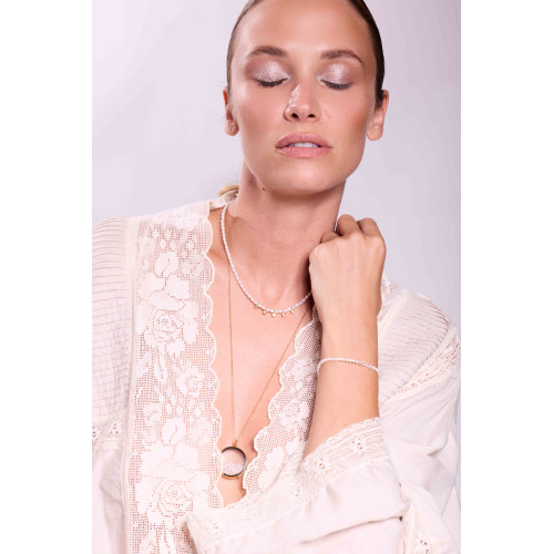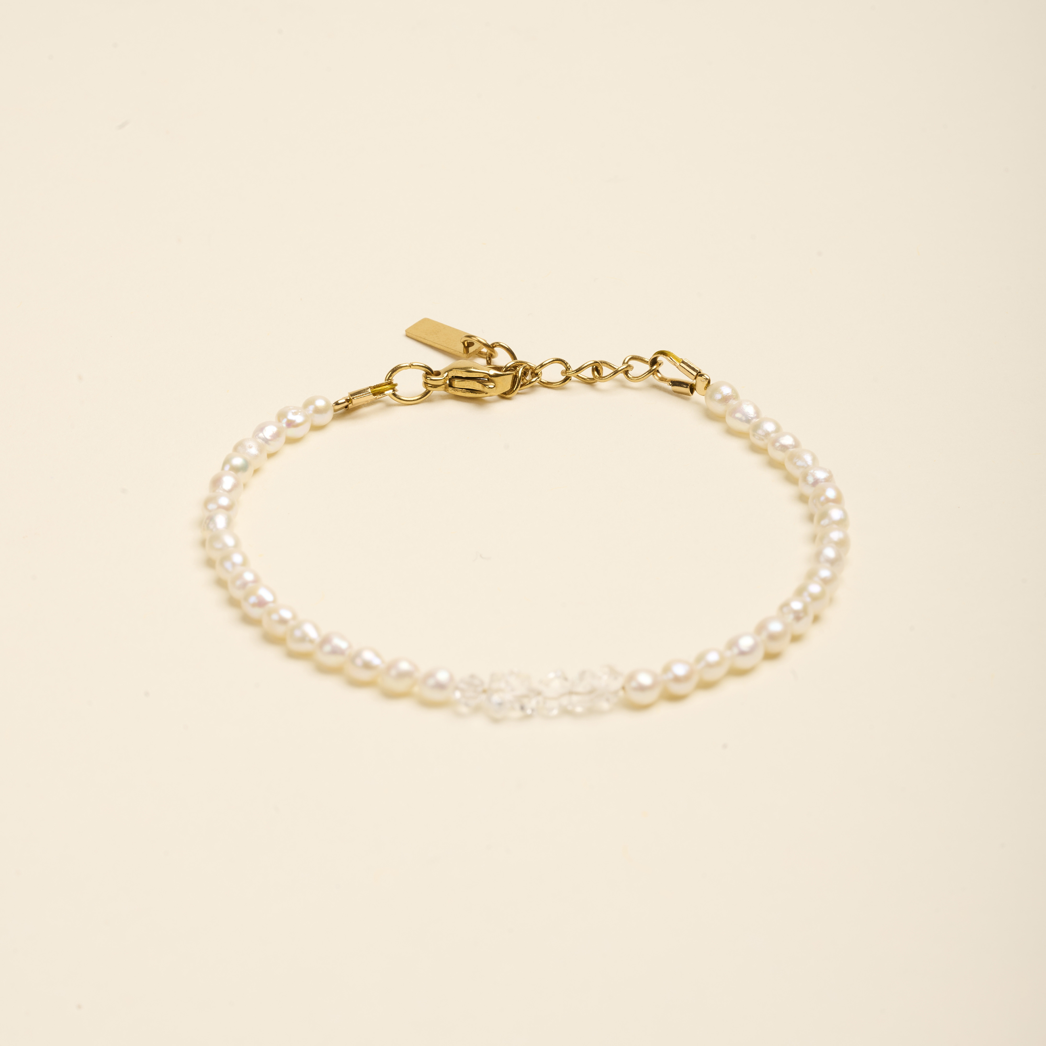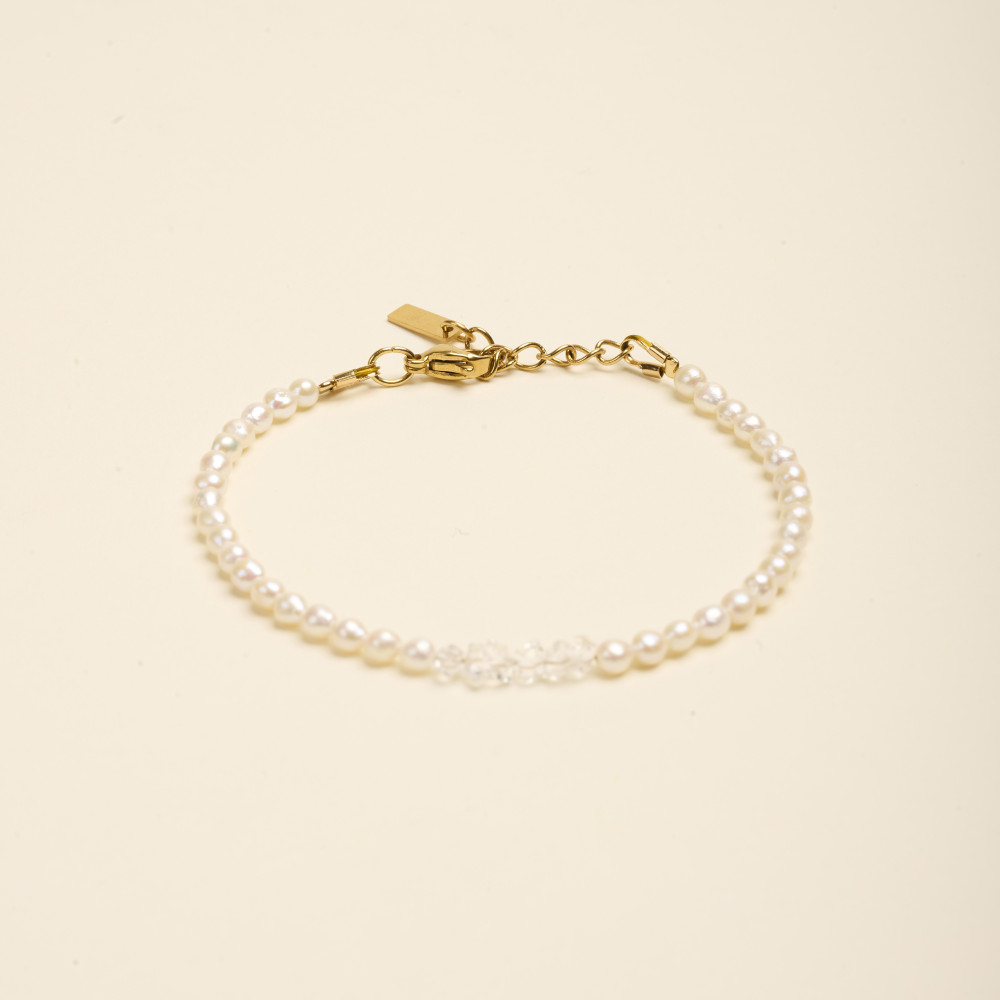 Le bracelet Seda est composé de perles de culture associées à des diamants Herkimer. Sa fermeture en acier assure solidité et élégance. Confectionné dans notre atelier à Nîmes, il est doté d’une chaîne de rallonge qui lui permet de s’adapter à tous les poignets.