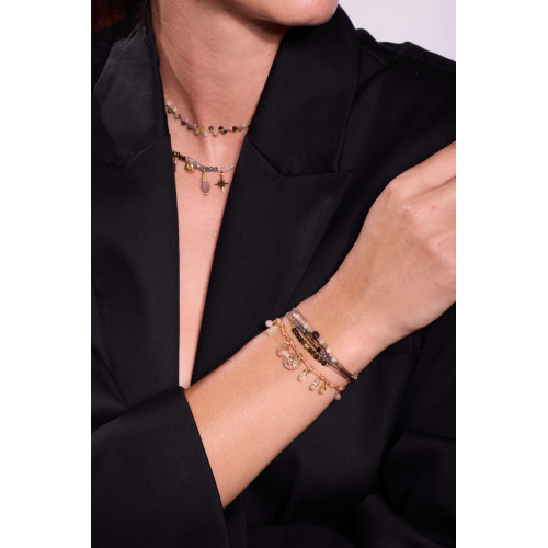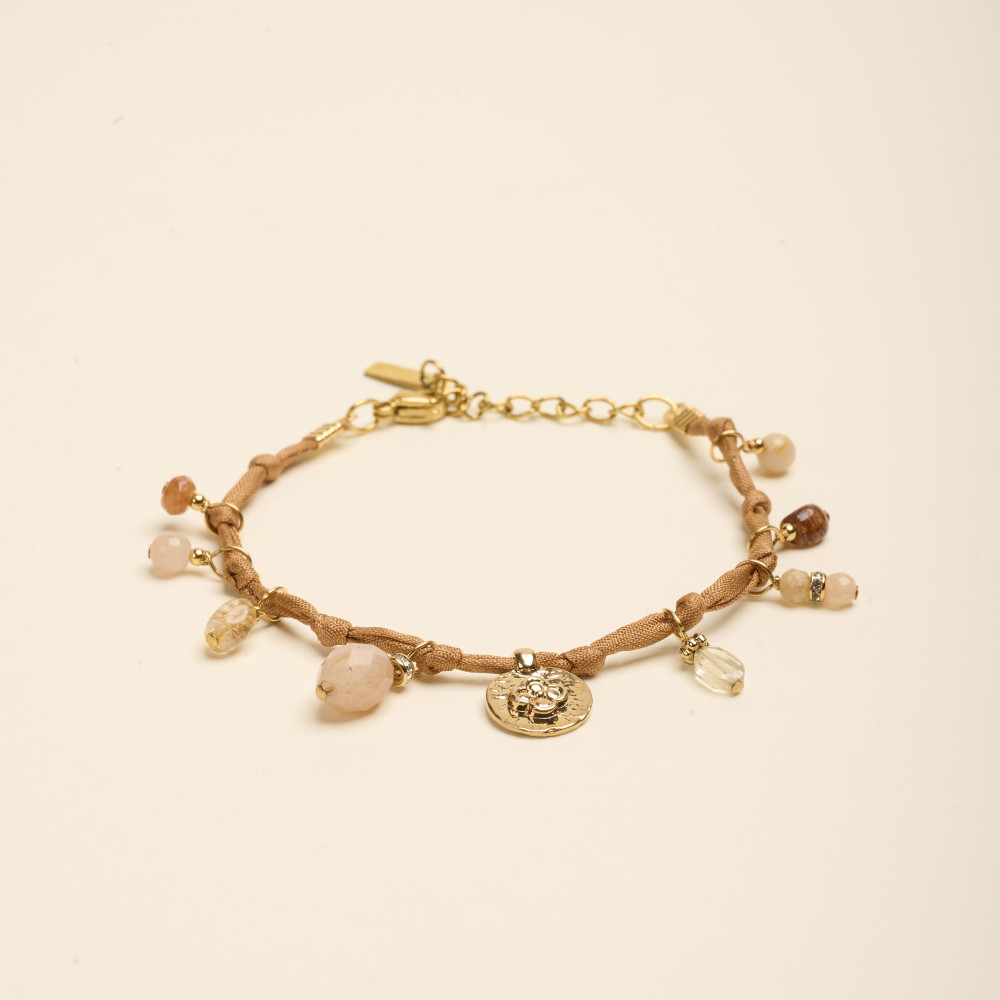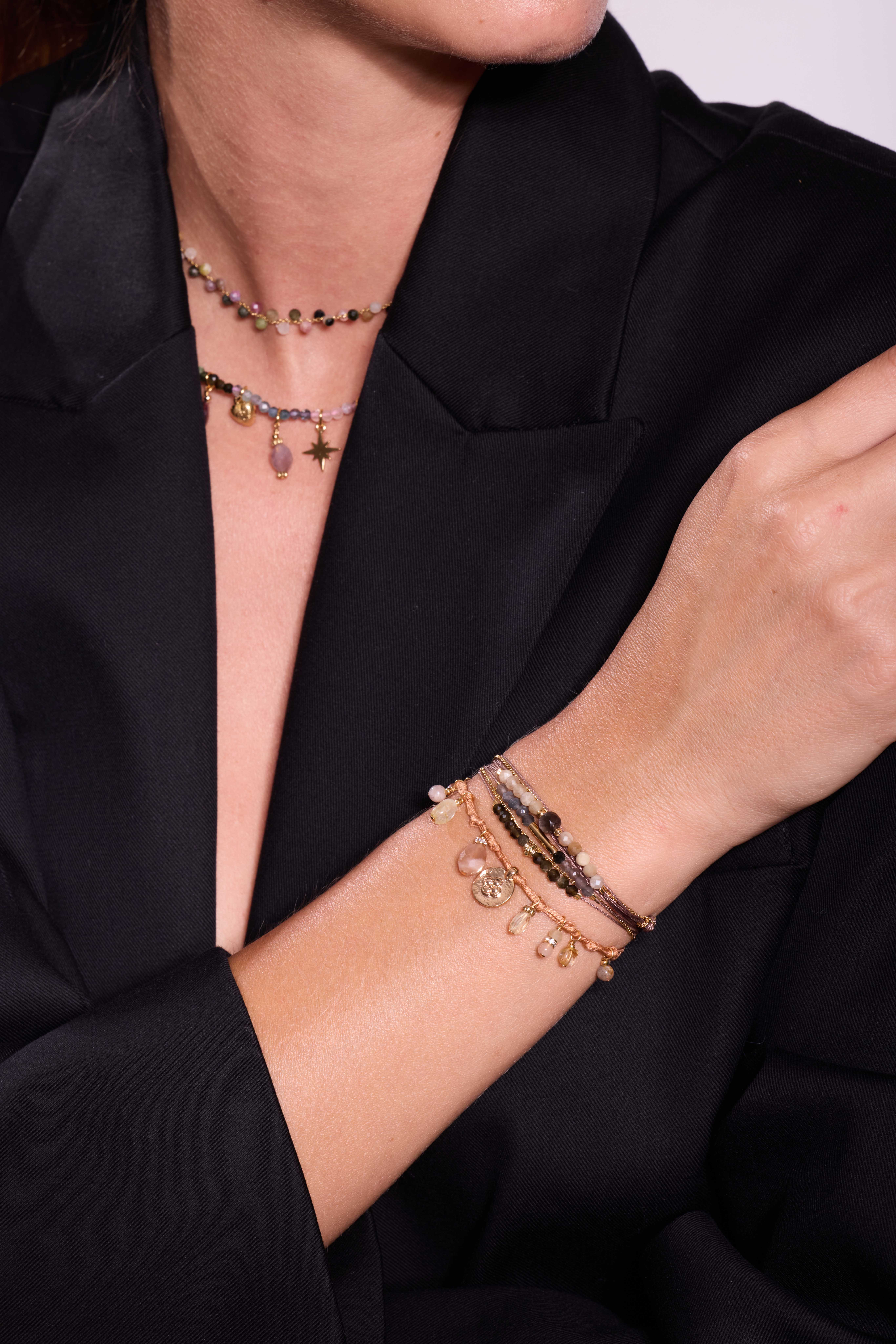 Il associe délicates pampilles en pierres fines : pierre de lune pêche, quartz rutile, citrine. Ainsi qu'une médaille dorée à l'or fin, le tout sur un fil de soie roulé.