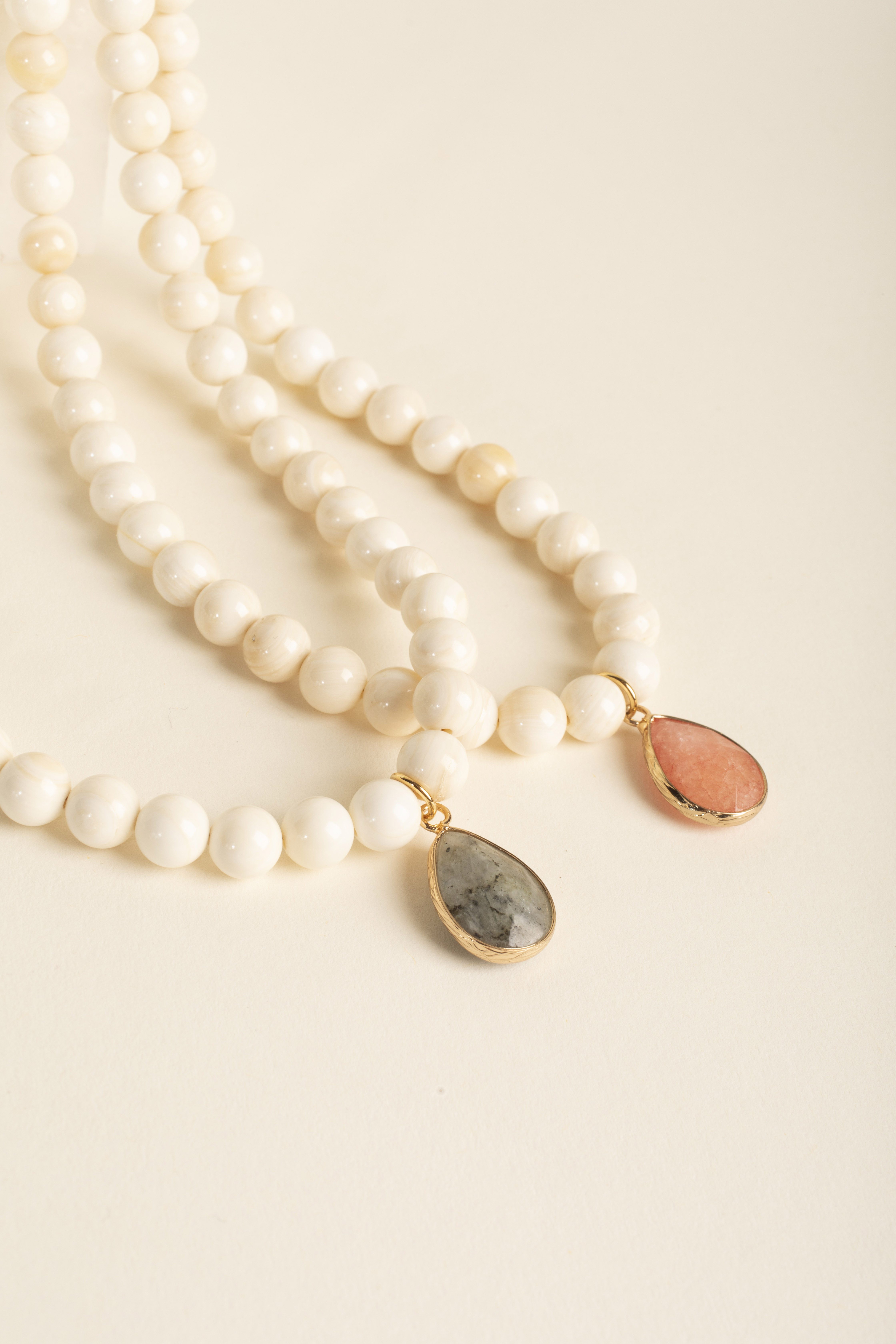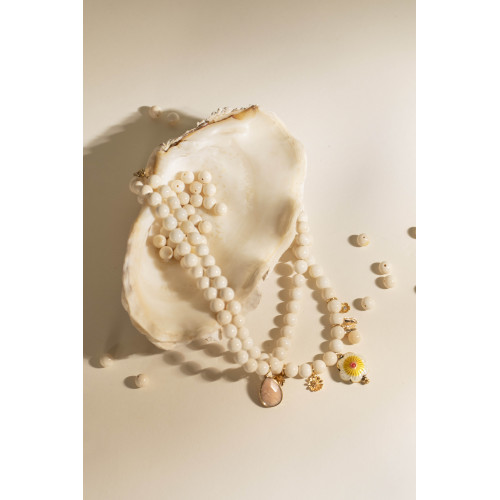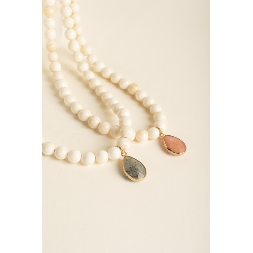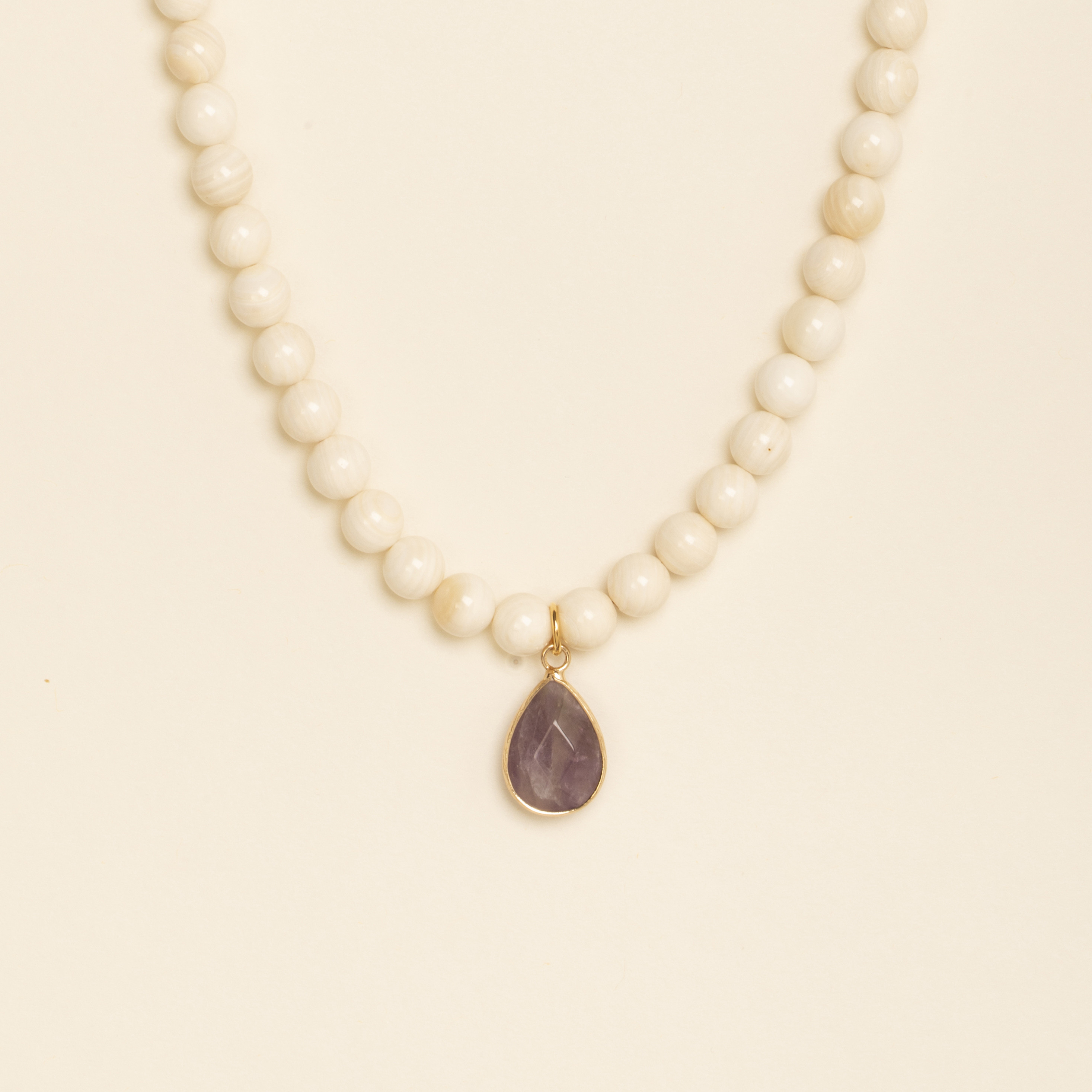Le collier Dori est composé de perles en jaspe blanc et d'un pendentif en améthyste serti en forme de goutte. Il mesure 38 cm avec une chaîne de rallonge de 7 cm permettant d'ajuster la longueur jusqu'à 45 cm.