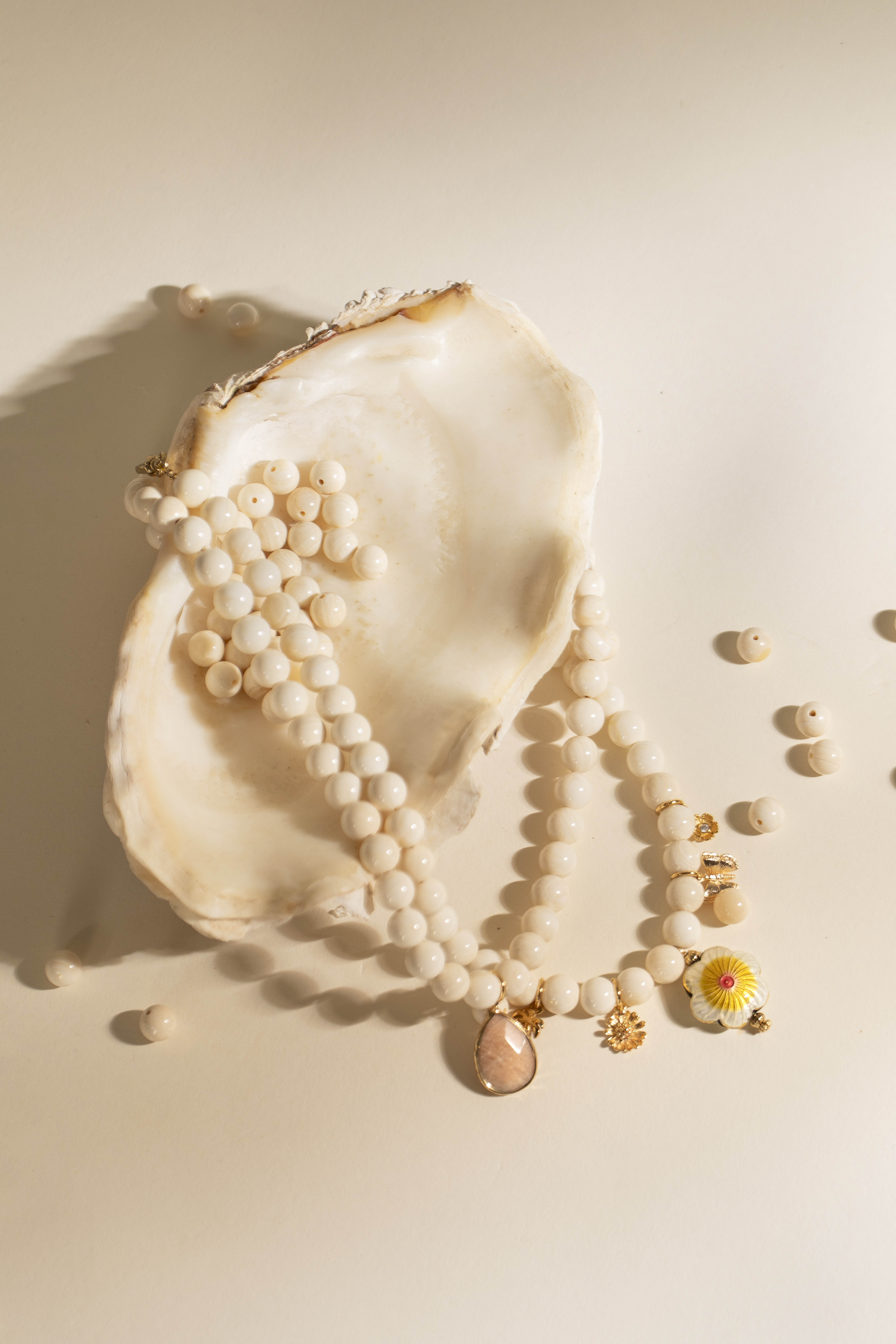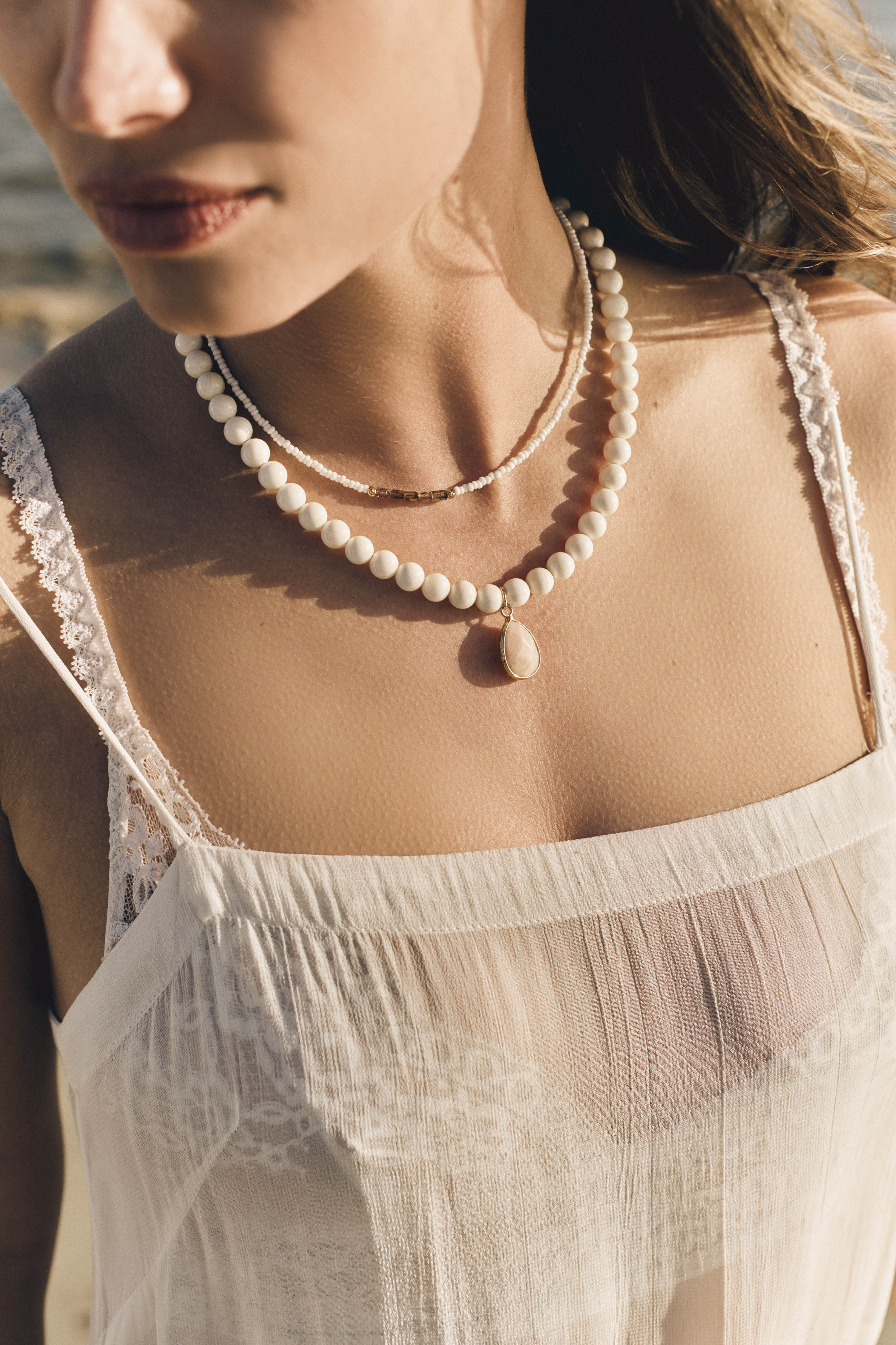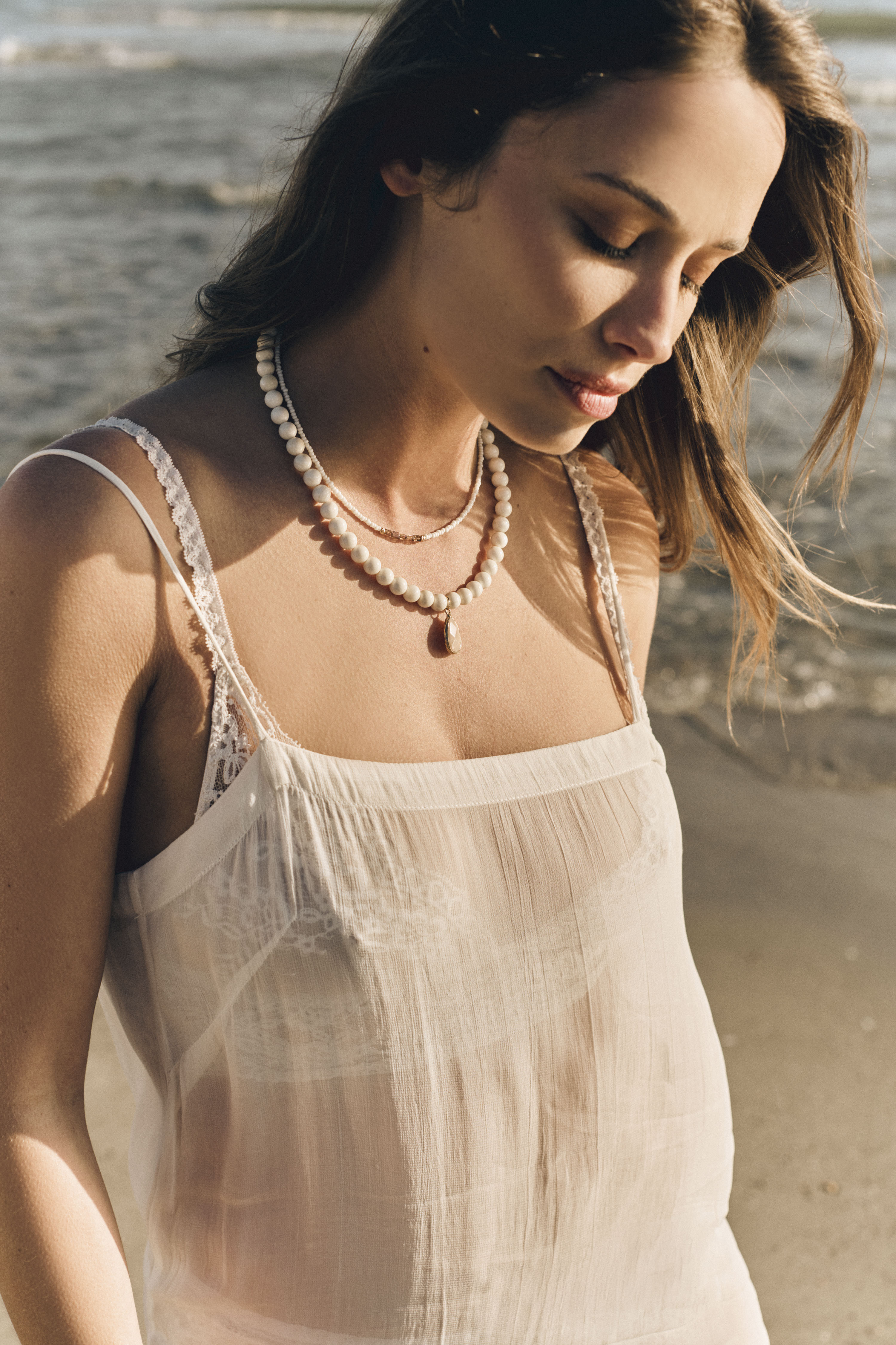 Le collier Dori est composé de perles en jaspe blanc et d'un pendentif en améthyste serti en forme de goutte. Il mesure 38 cm avec une chaîne de rallonge de 7 cm permettant d'ajuster la longueur jusqu'à 45 cm.