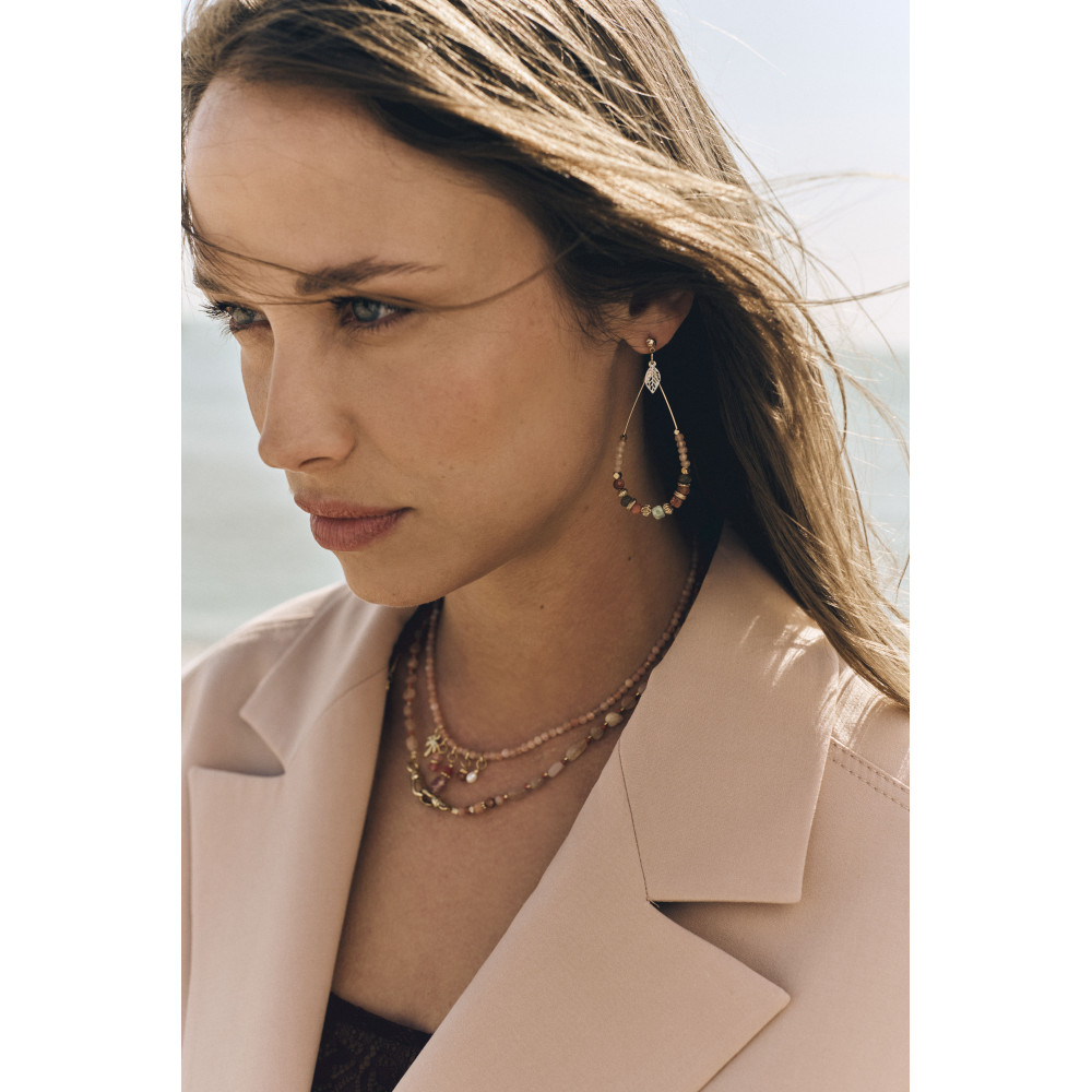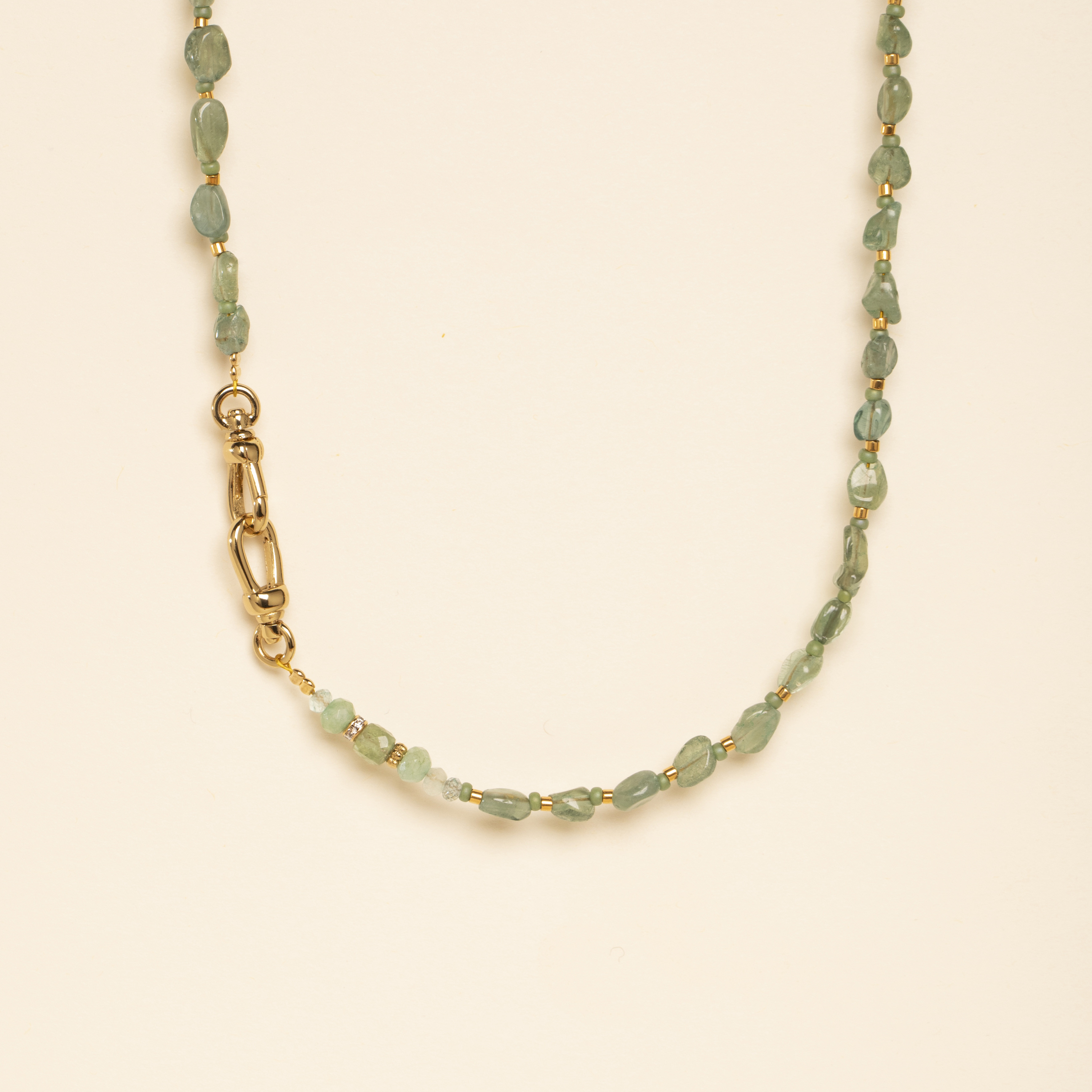 De l'un des fermoirs part un effilage composé d'aventurine et d'amazonite taillés dans des formes variées, pour ajouter un jeu de texture.
