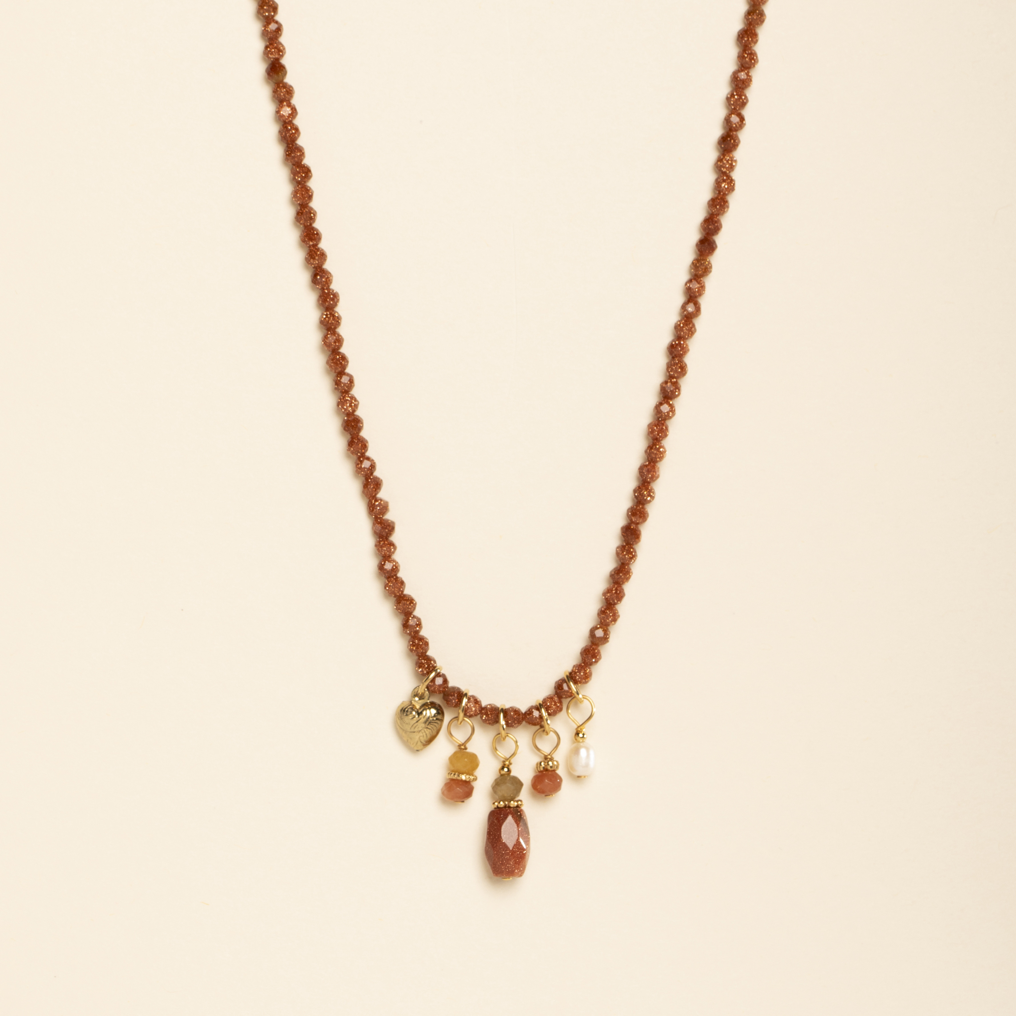 Le collier Baïa est une composition délicate mêlant plusieurs pierres fines soigneusement sélectionnées à des petites papilles en métal doré, pour un effet charm's raffiné et lumineux.