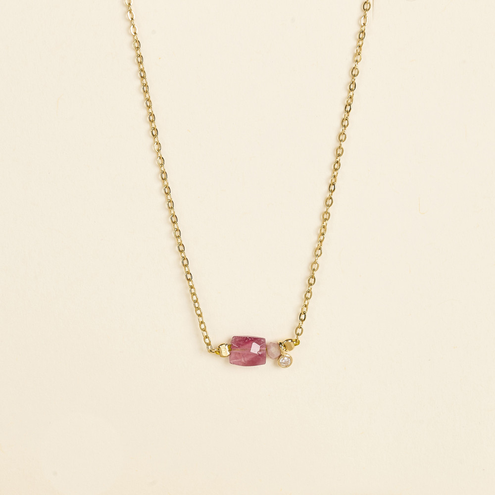 Il se compose d'une perle ovale facettée en tourmaline rose , délicatement associée à un petit oxyde de zirconium serti clos, qui apporte une touche de modernité lumineuse.