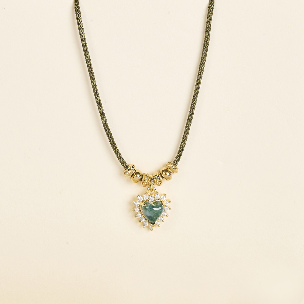 Le collier Alby se compose d'une pierre taillée en forme de cœur en agate indienne enfilée sur un cordon en soie tressé.