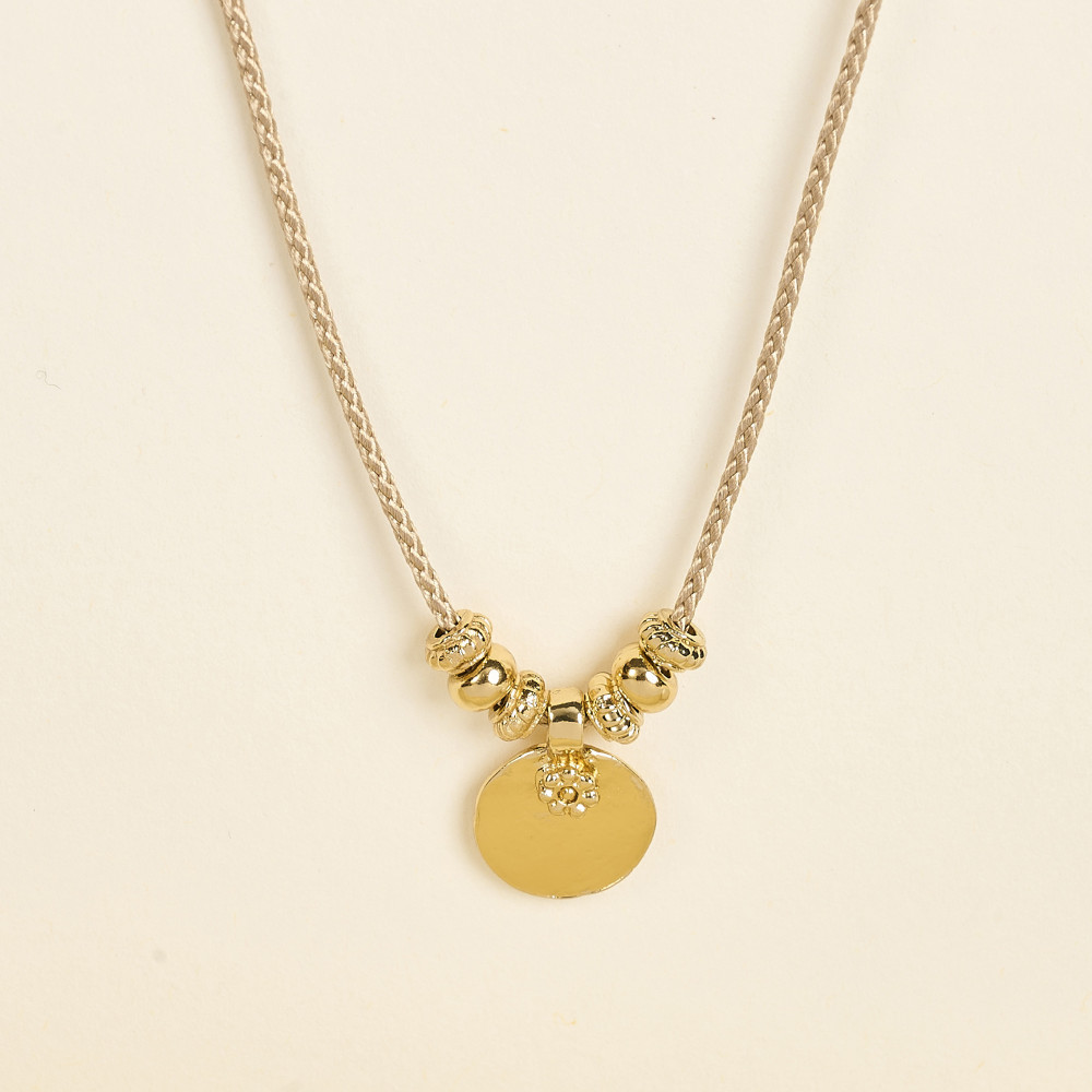 Le collier Alek Ronde By Garance, d’une longueur de 36 à 44 cm, séduit par sa simplicité lumineuse. Son médaillon rond reflète délicatement la lumière, soutenu par un cordon tressé et des perles dorées pour un style minimaliste et élégant.
