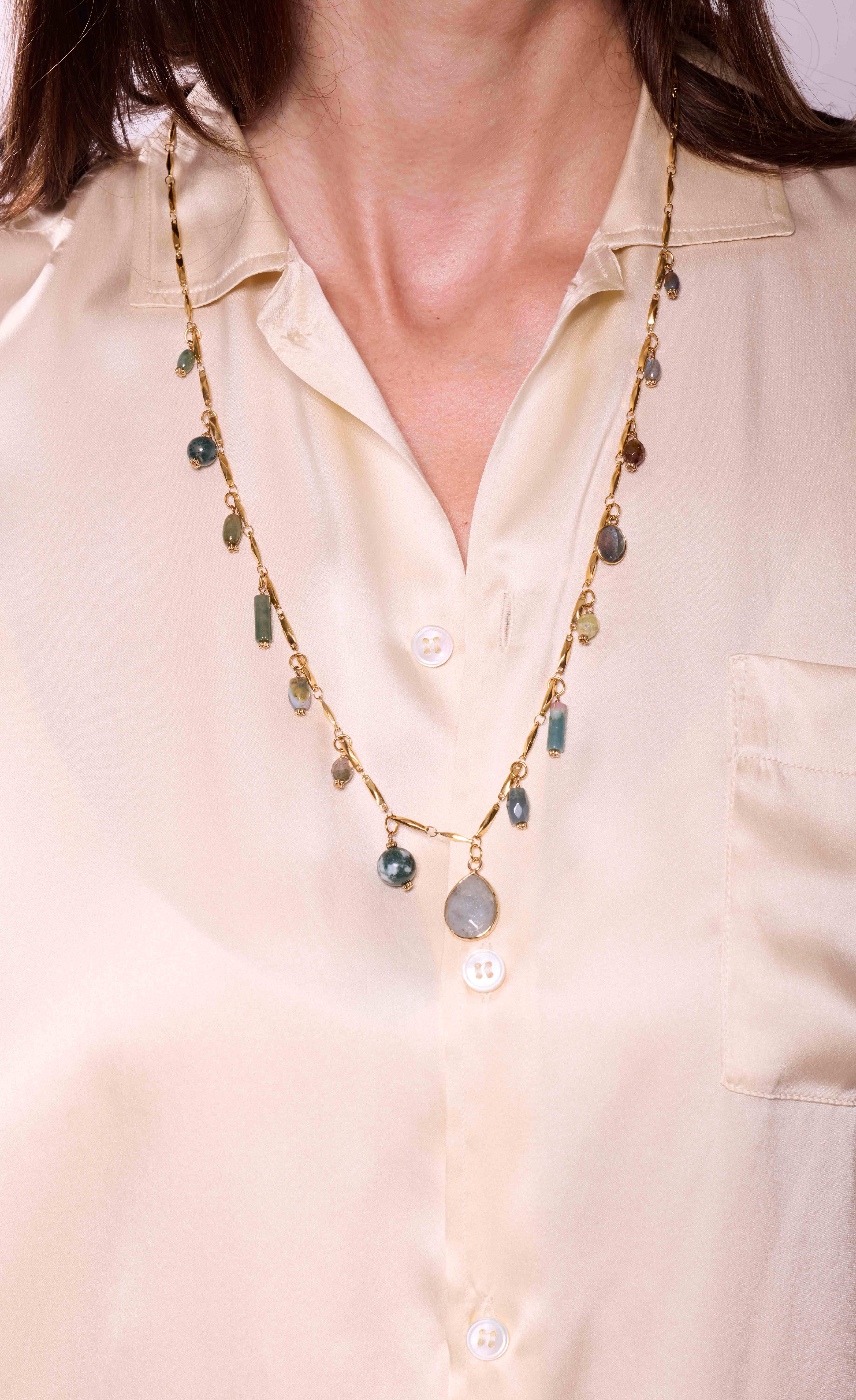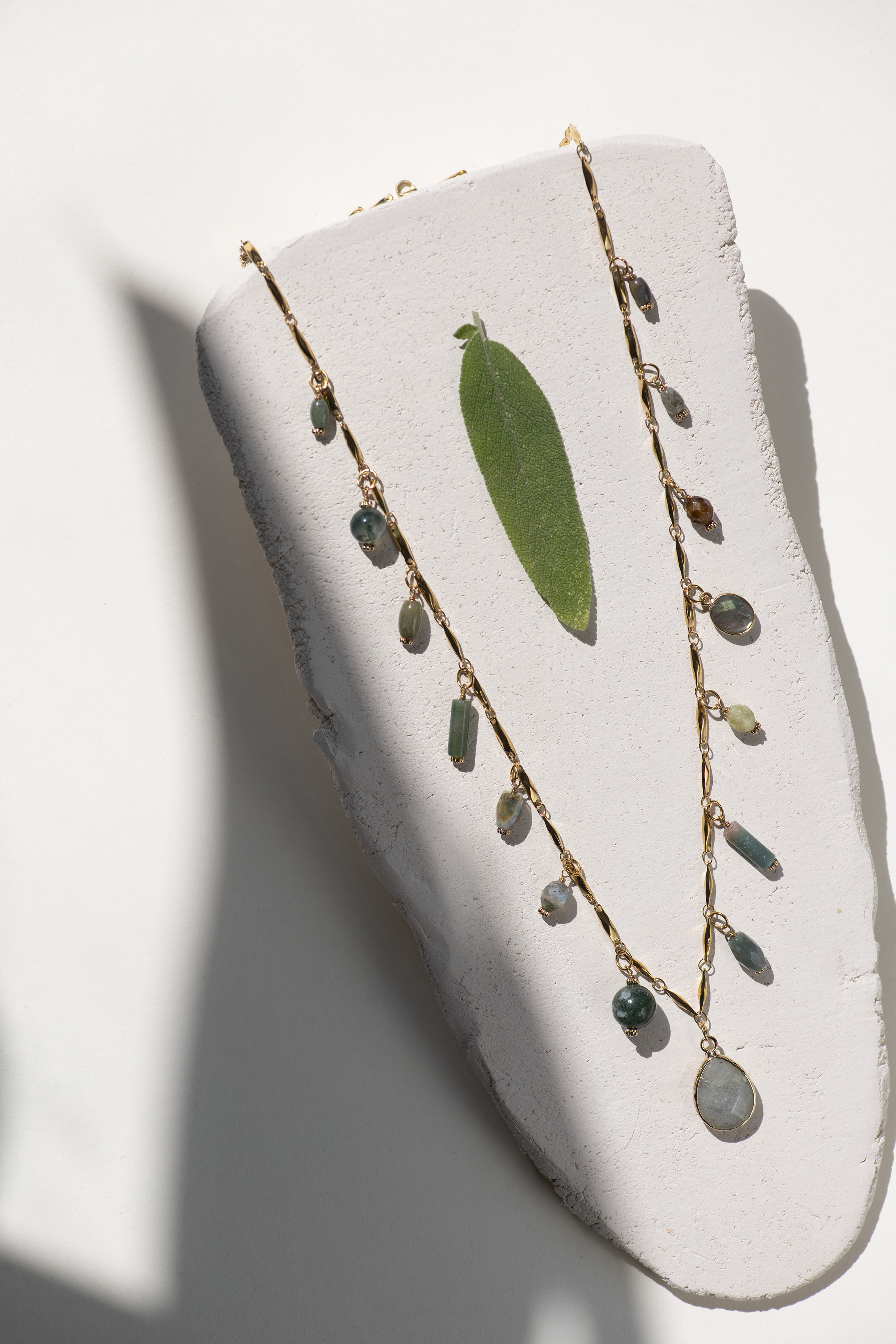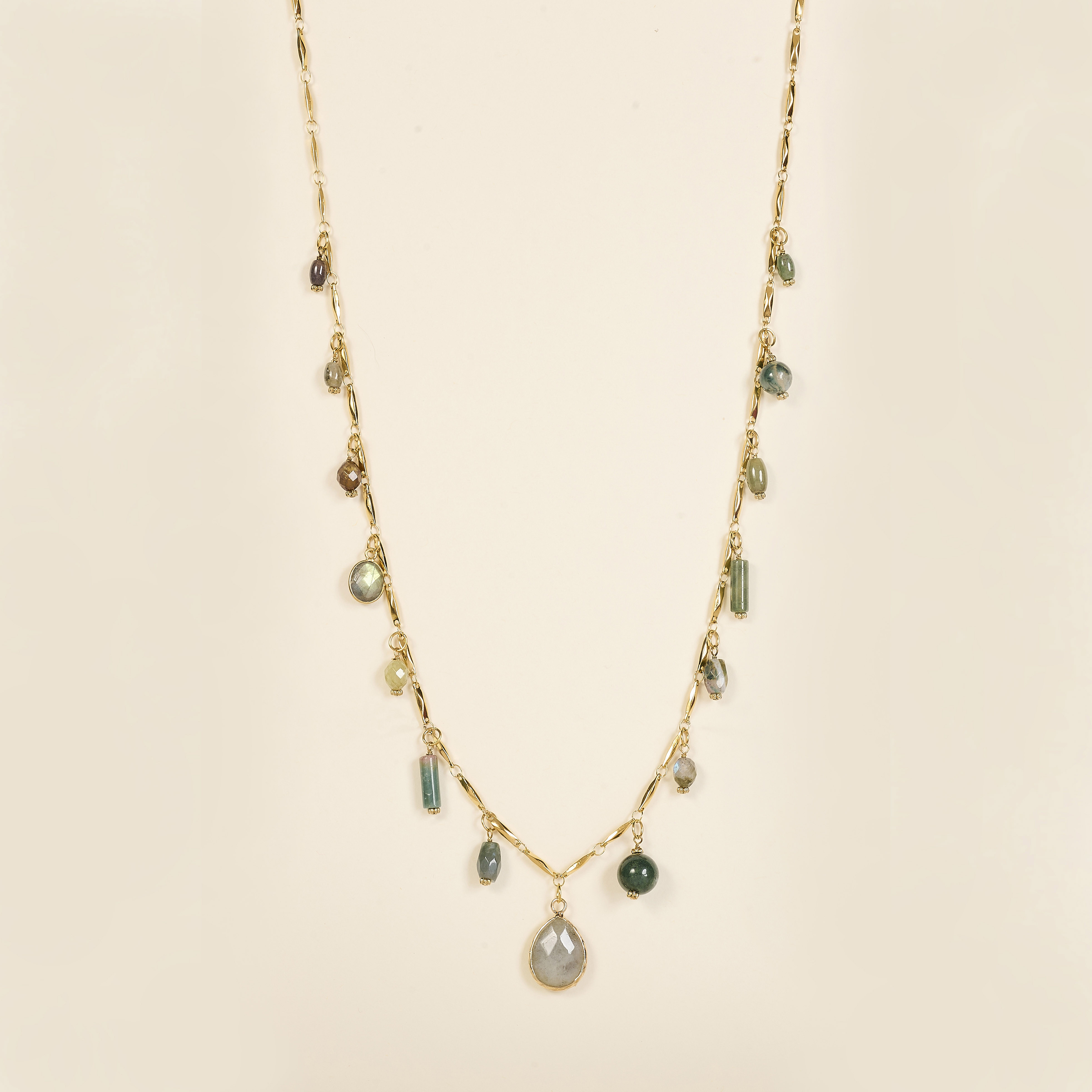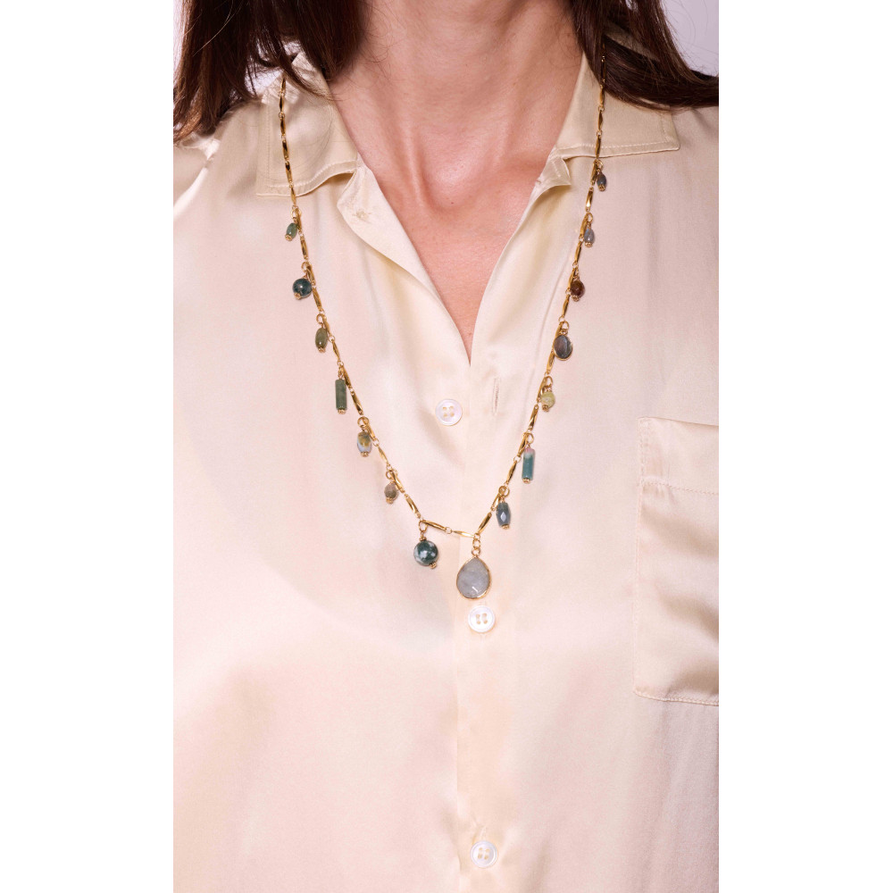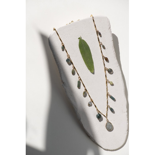 Le collier Cati est un sautoir raffiné qui séduit par son jeu de couleurs et de textures délicates. Il se compose d’un élégant mélange de pierres semi-précieuses, principalement dans des nuances de vert, rehaussées de petites pampilles serties clos qui captent subtilement la lumière.