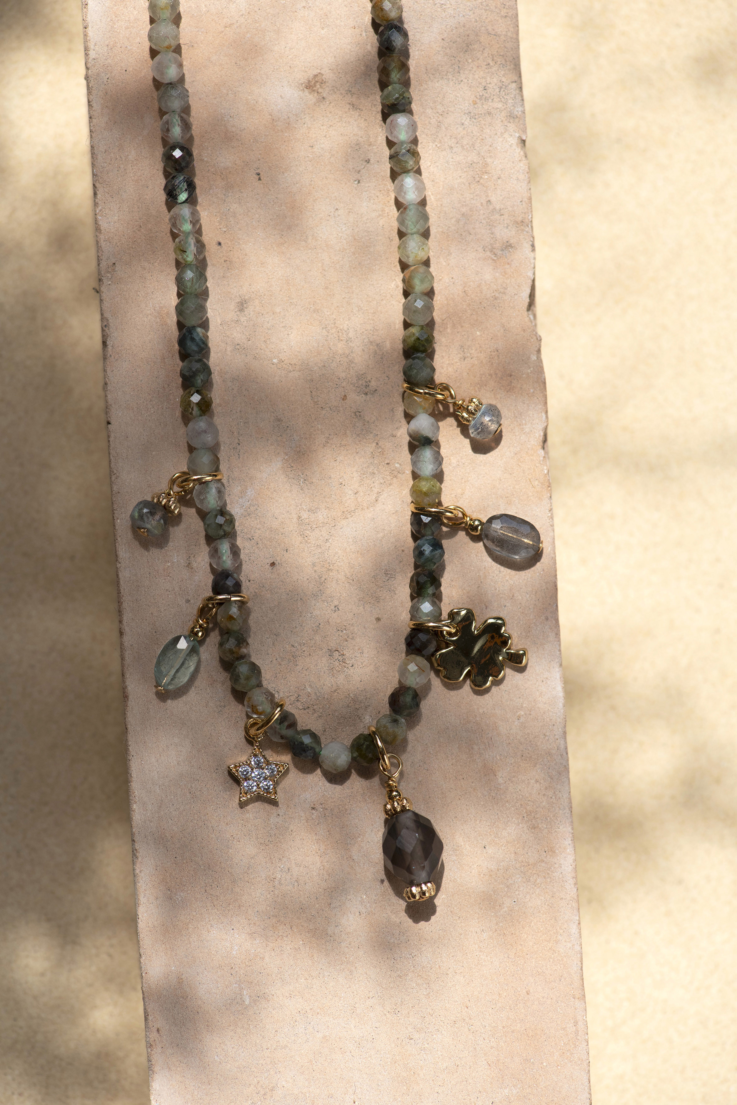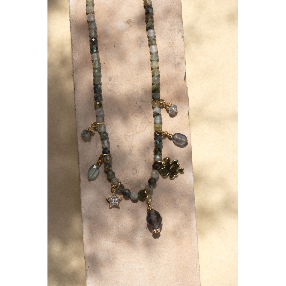 Il est orné de perles en labradorite grise, dont les reflets uniques apportent profondeur et caractère à chaque pièce.
