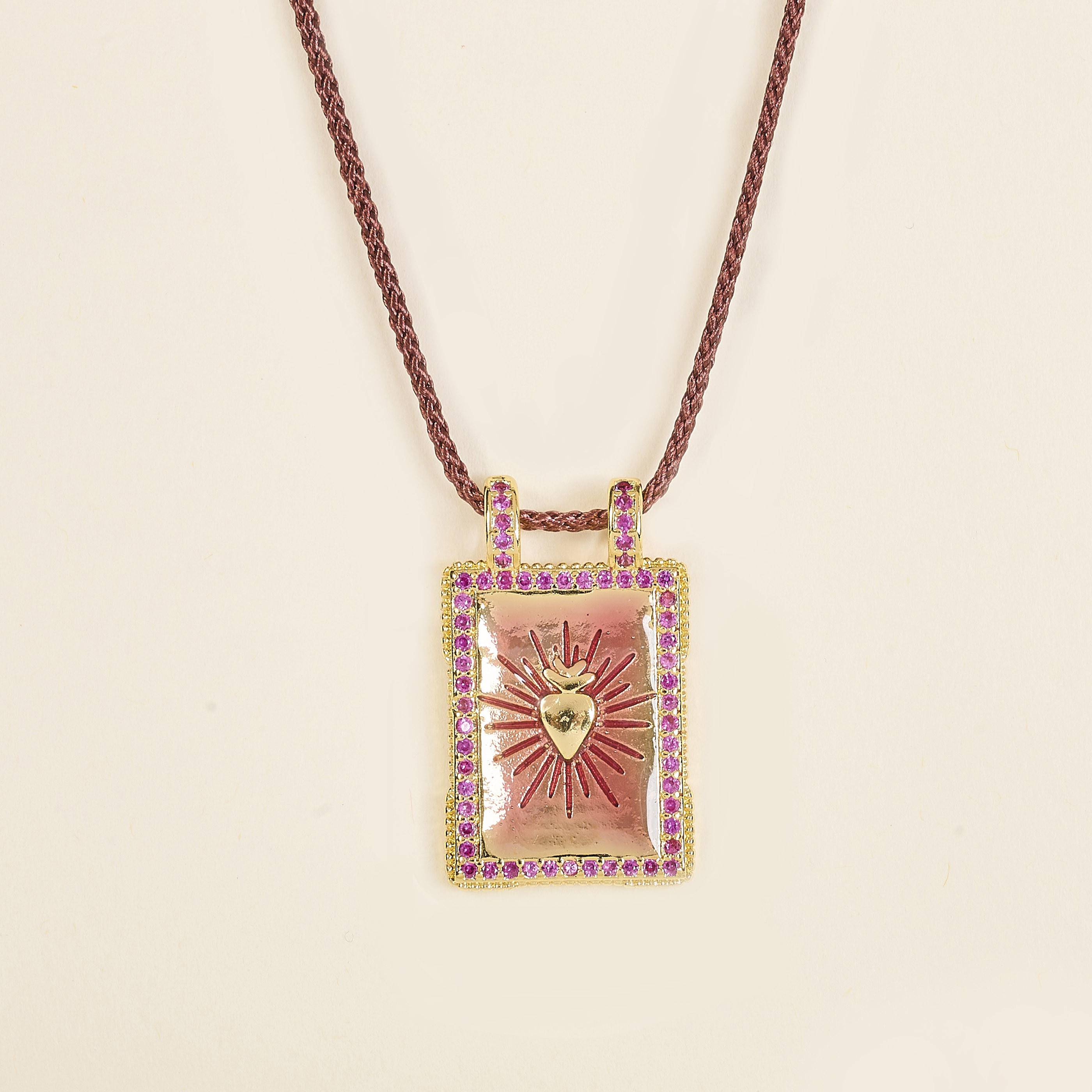 Le collier Imra Ex-Voto Rose associe la douceur du rose émaillé à la brillance du doré. Son médaillon rectangulaire, serti d’oxydes de zirconium roses, évoque la lumière et la protection.