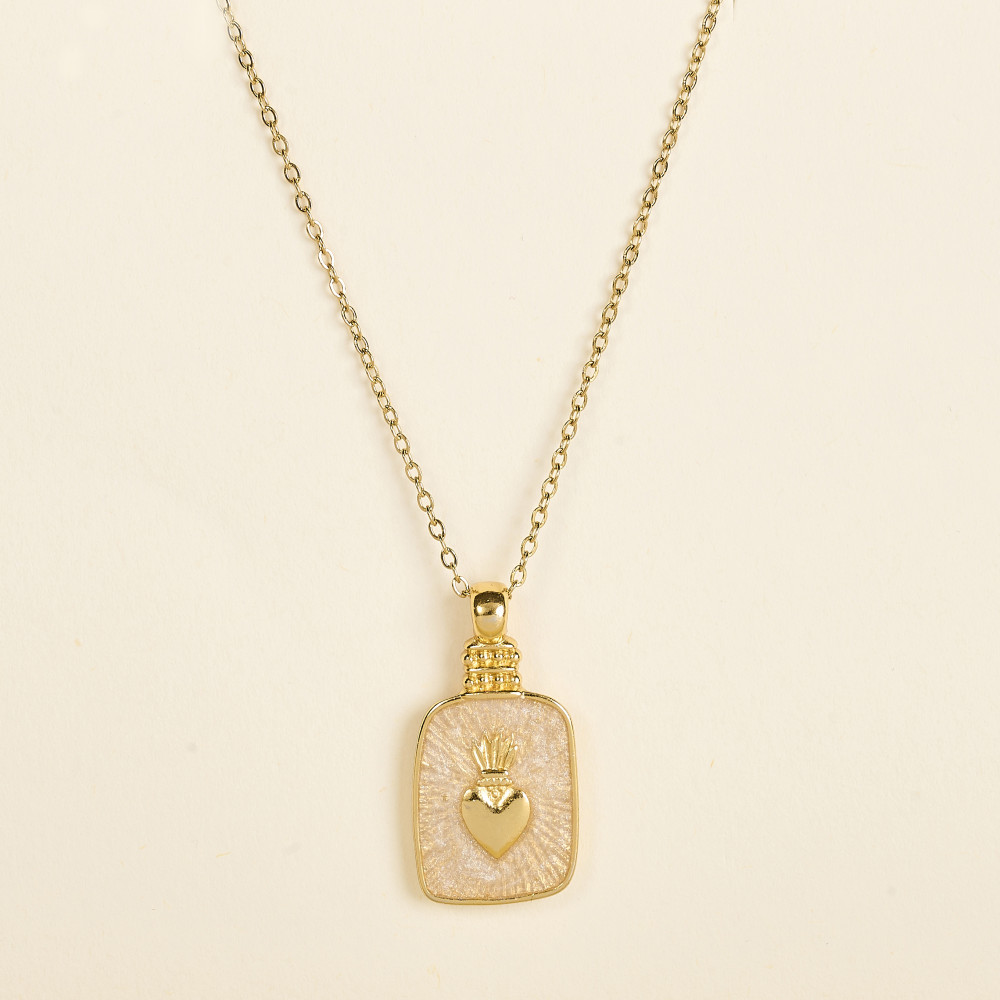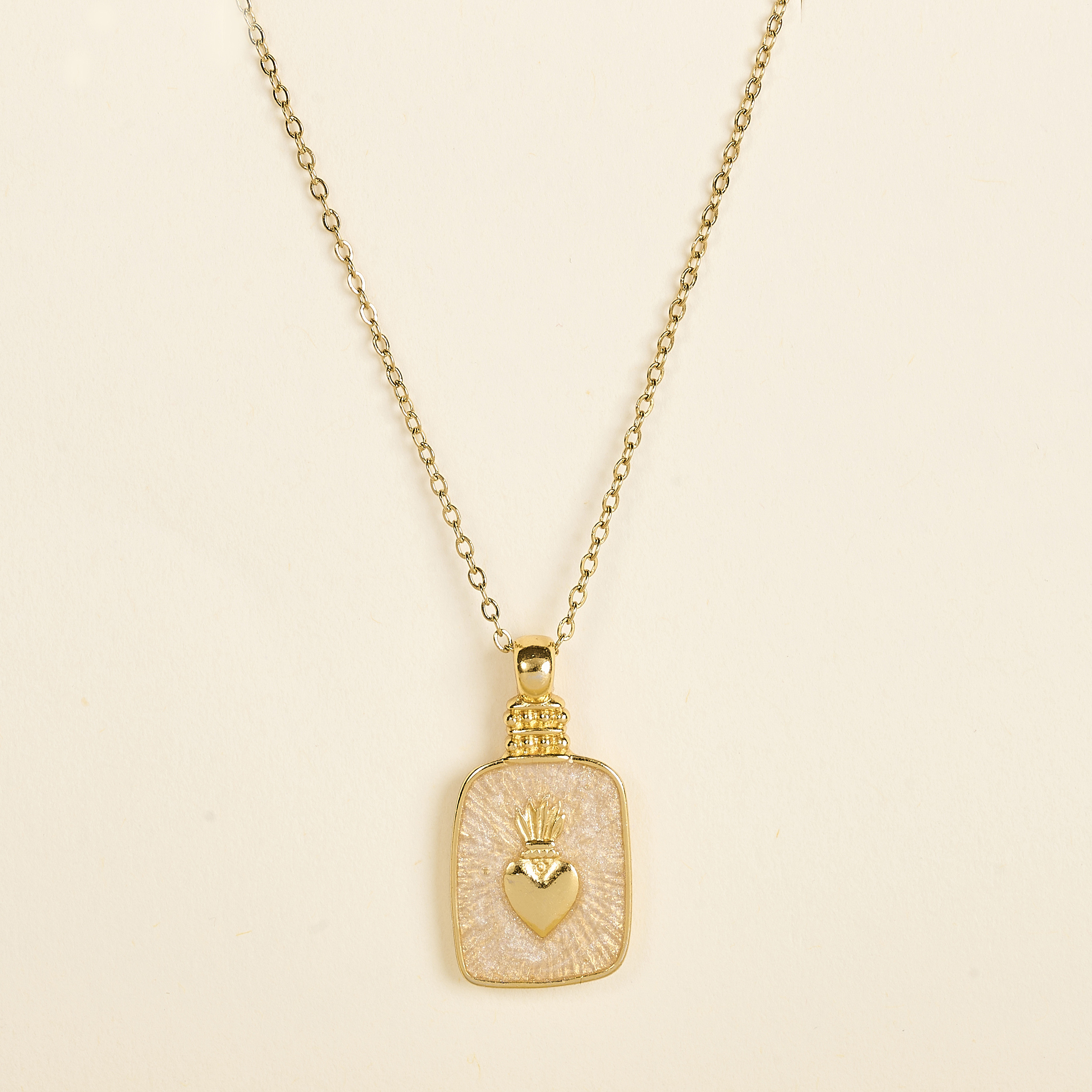Le collier Inez se compose d'une médaille centrale représentant un cœur ex-voto, émaillée avec le plus grand soin dans notre atelier à Nîmes. L’émail, de couleur nacré transparent, révèle de subtiles nuances qui rendent chaque pièce unique.