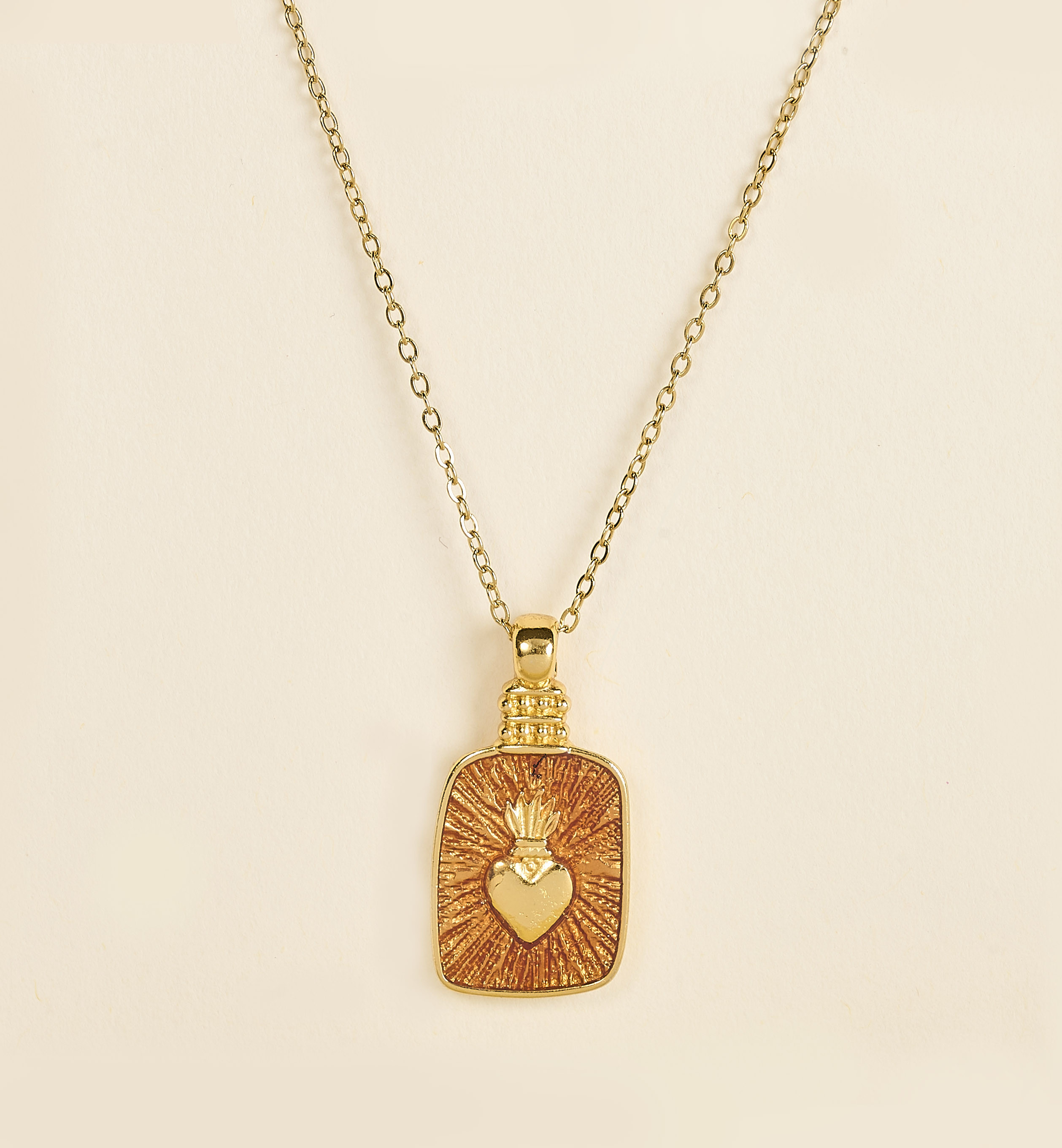 Le collier Inez se compose d'une médaille centrale représentant un cœur ex-voto, émaillée avec le plus grand soin dans notre atelier à Nîmes. L’émail, de couleur terracotta transparent, révèle de subtiles nuances qui rendent chaque pièce unique.