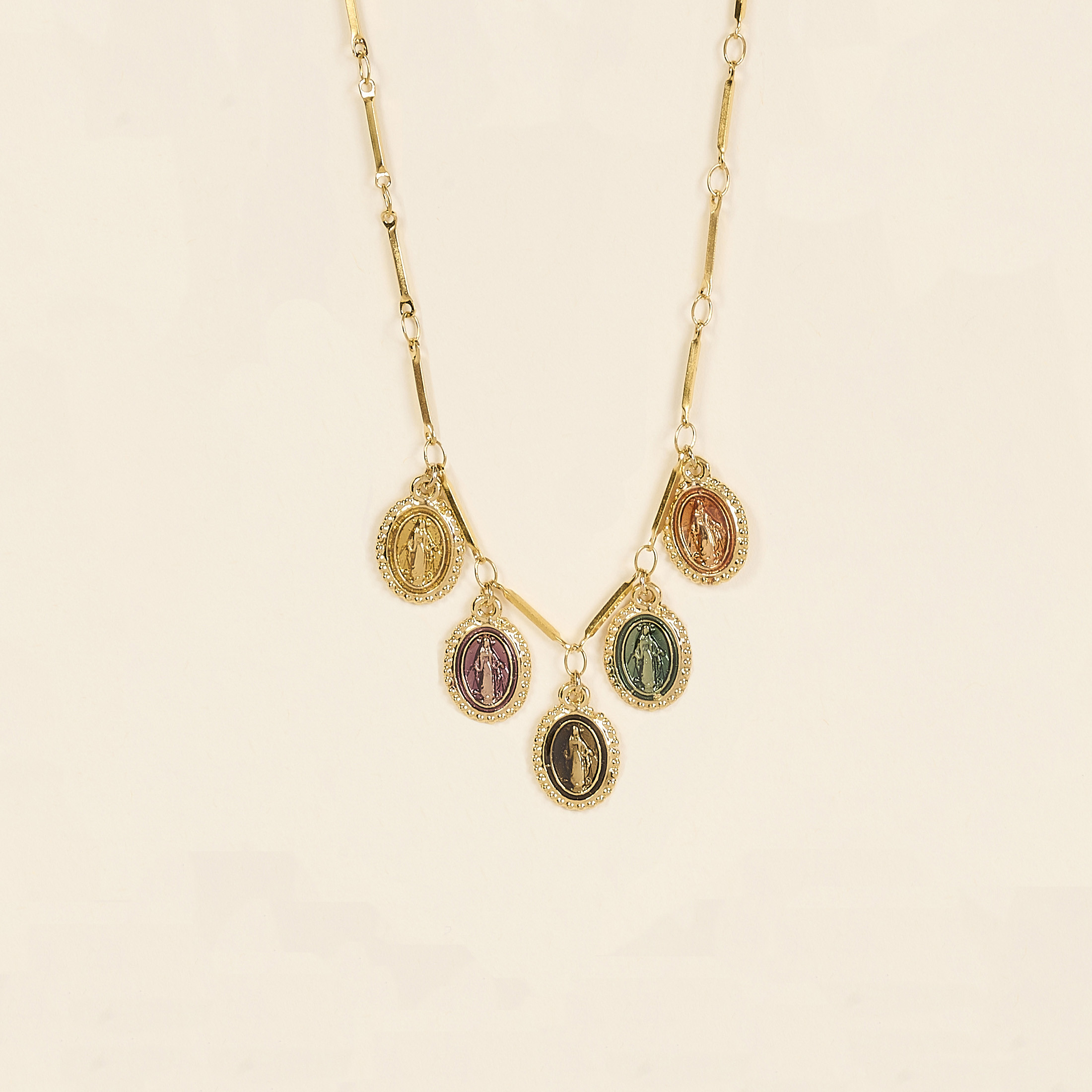 Le collier Inga se compose de 5 médailles représentant la Vierge, émaillées avec le plus grand soin dans notre atelier à Nîmes.