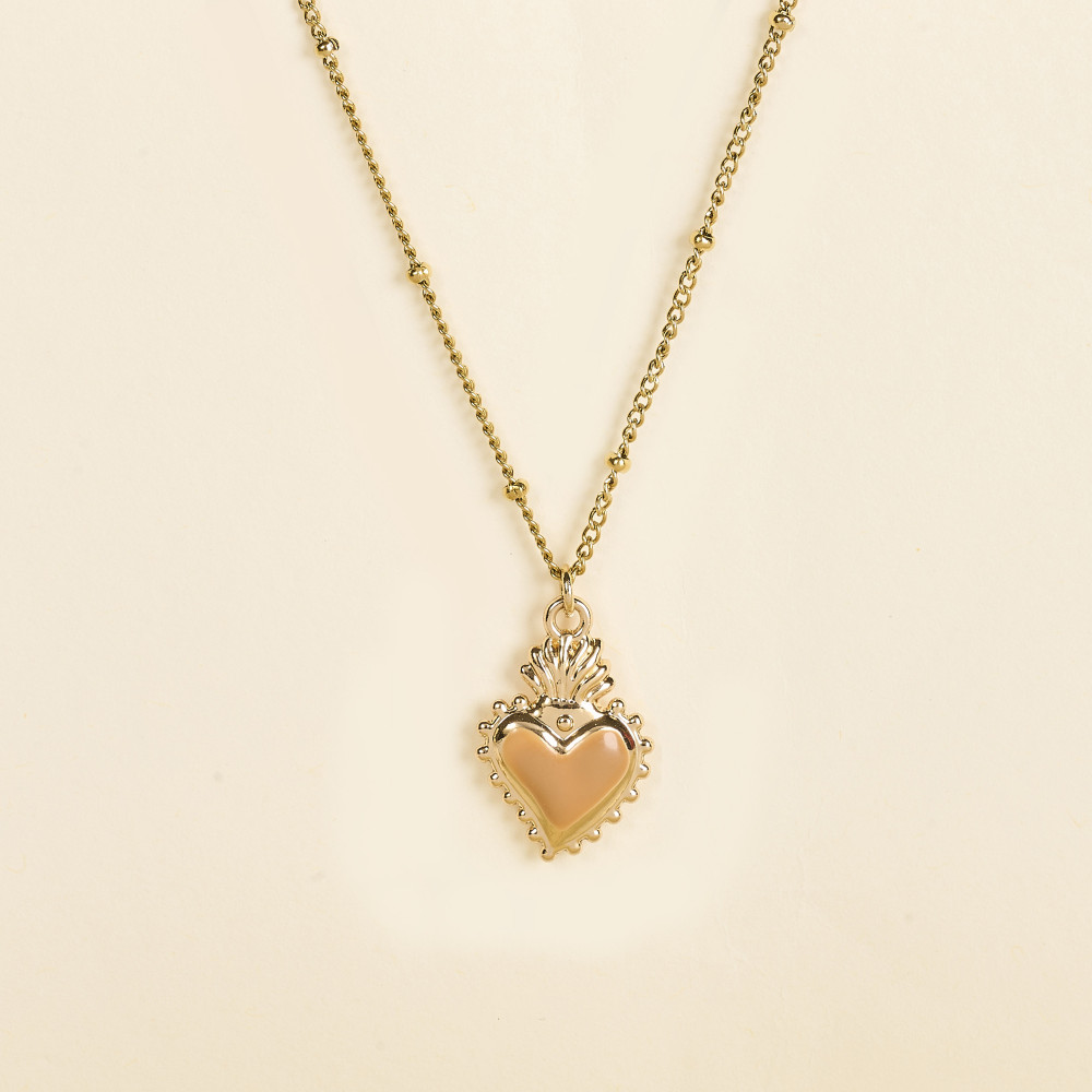 Le collier Isha Camel By Garance met en lumière un cœur sacré doré rehaussé d’un émail camel aux reflets doux et chaleureux. Son contour finement sculpté apporte une touche baroque et délicate. Monté sur une chaîne en acier doré de 40 cm, il se porte comme un talisman moderne, élégant et intemporel.