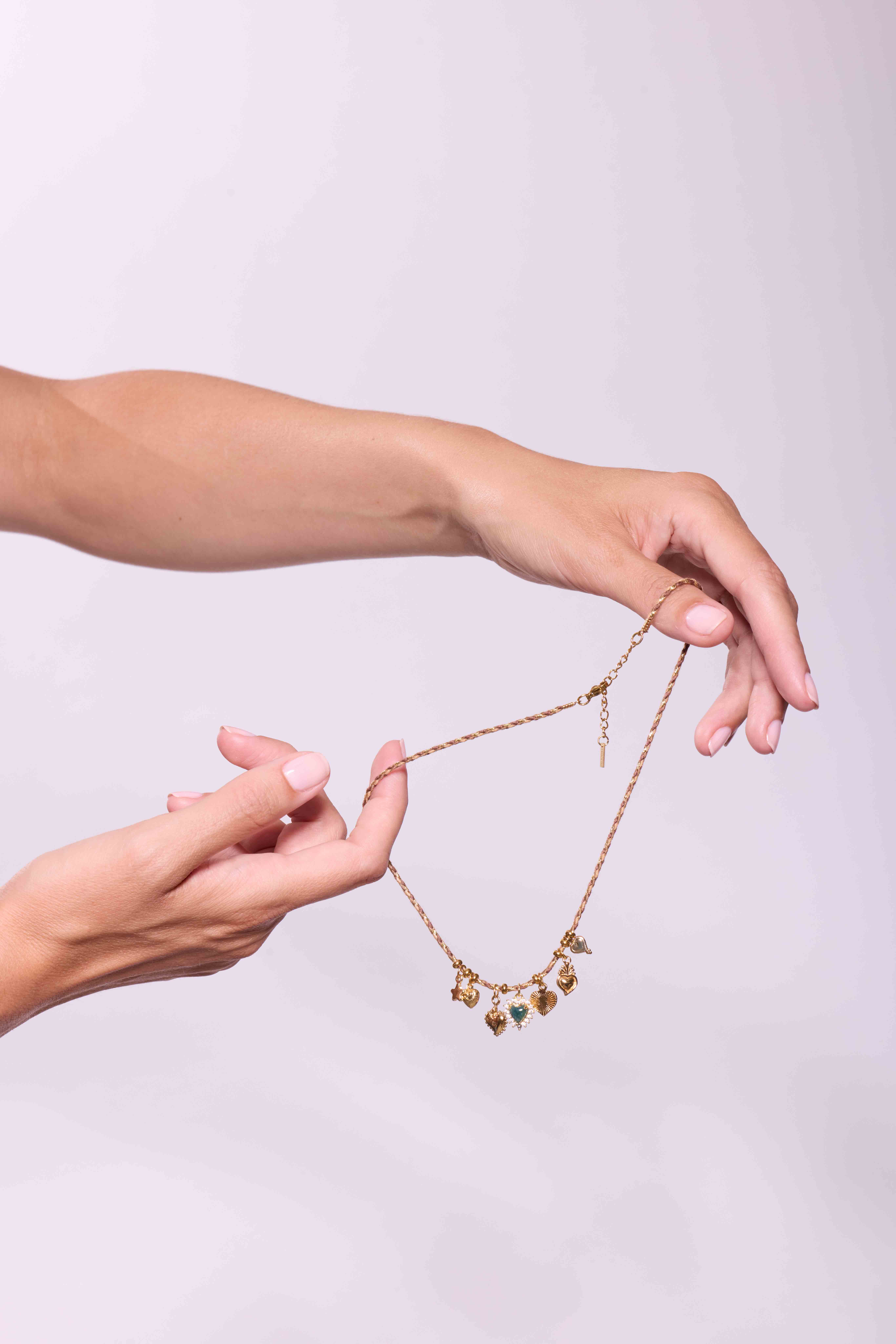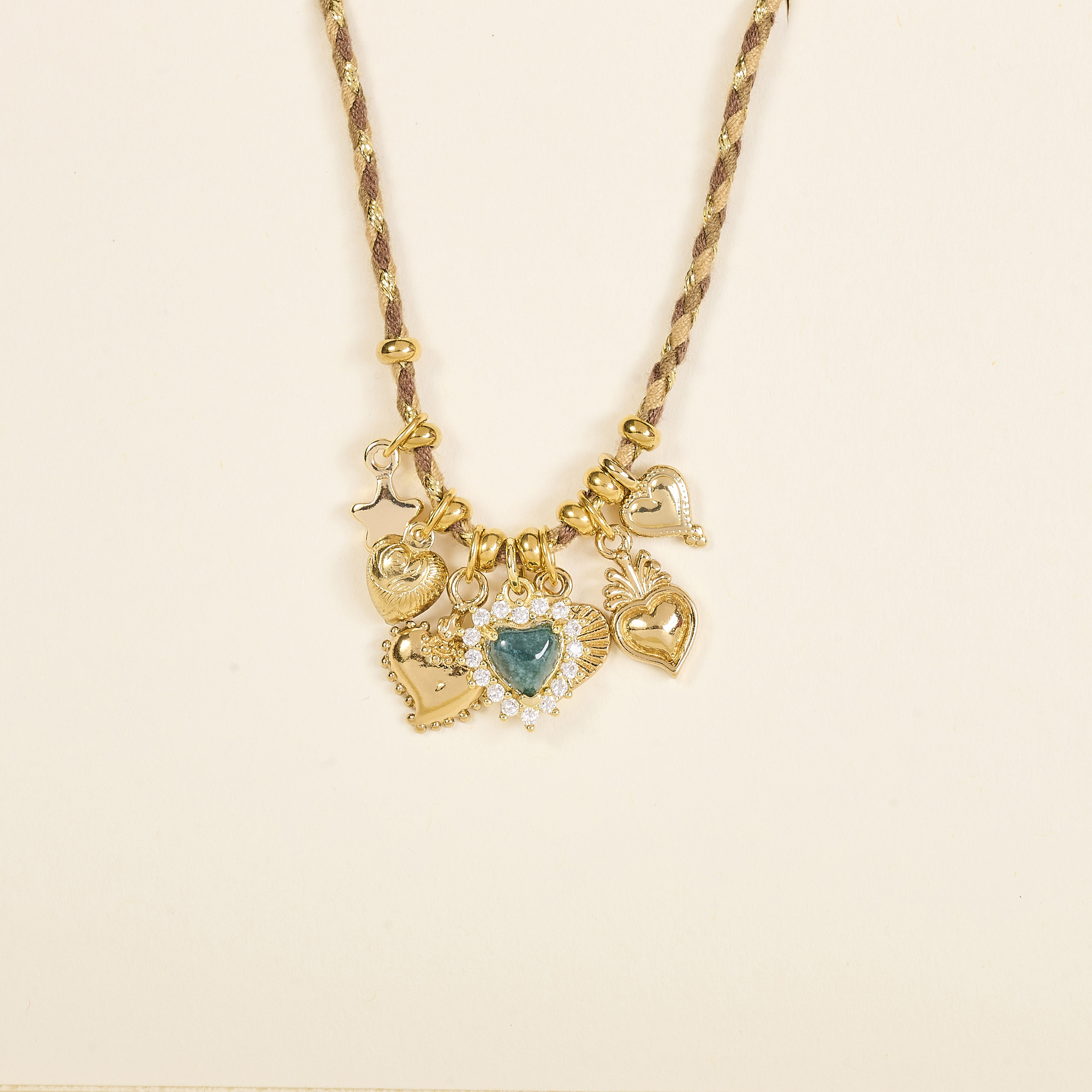 Le collier Izak se compose de plusieurs médailles symboliques : un cœur, une étoile, un ex-voto, un cœur en agate mousse serti d’oxydes de zirconium, ainsi qu’un cœur strié.