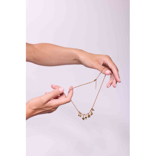 Le collier Izak se compose de plusieurs médailles symboliques : un cœur, une étoile, un ex-voto, un cœur en agate mousse serti d’oxydes de zirconium, ainsi qu’un cœur strié.