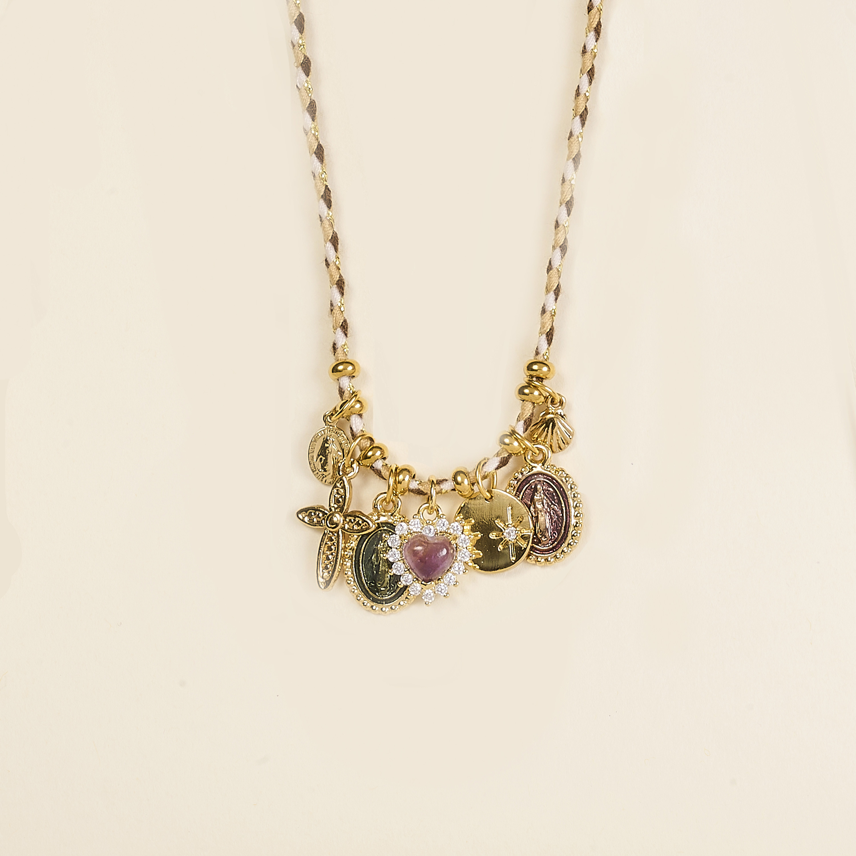 Le collier Izak se compose de plusieurs médailles symboliques : une médaille vierge miraculeuse, une croix perlée, deux vierge émaillée dans des tons de bronze et de violet transparent, un cœur en améthyste serti d’oxydes de zirconium, ainsi qu’un coquillage.