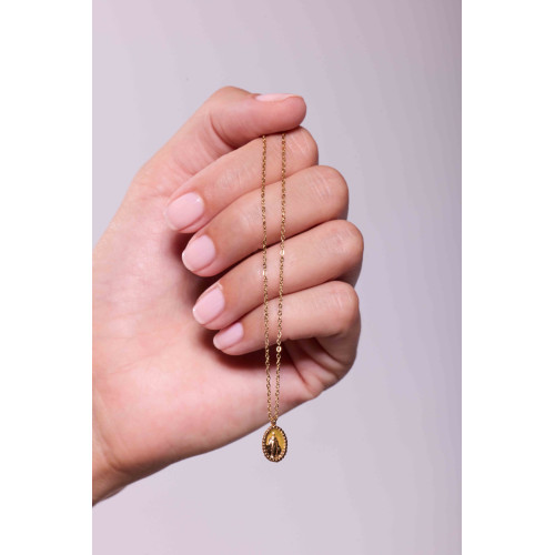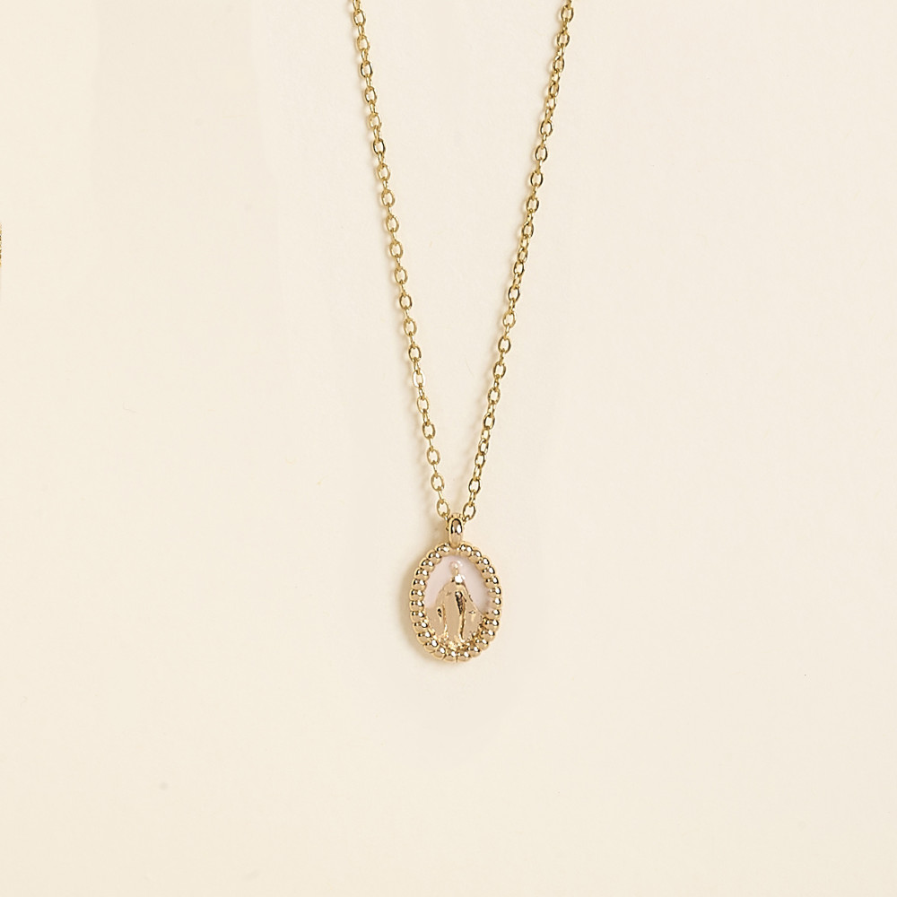 Le collier Jada Kaki associe l’intensité du vert à la chaleur du doré. Sa médaille émaillée, ornée d’une Vierge dorée, incarne un style à la fois spirituel et naturel.