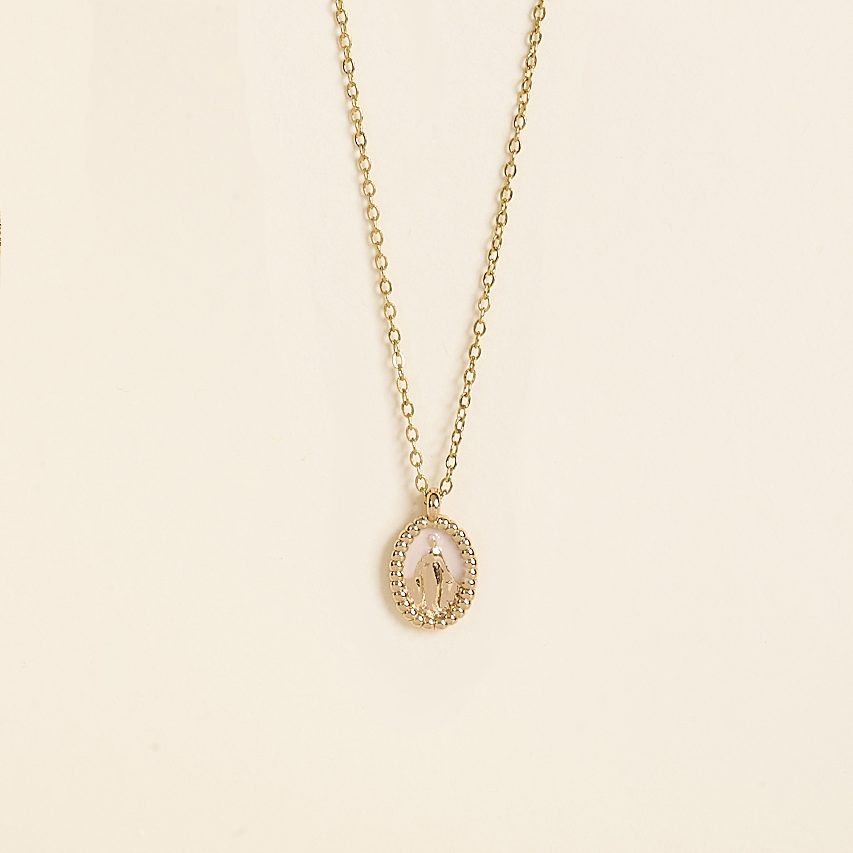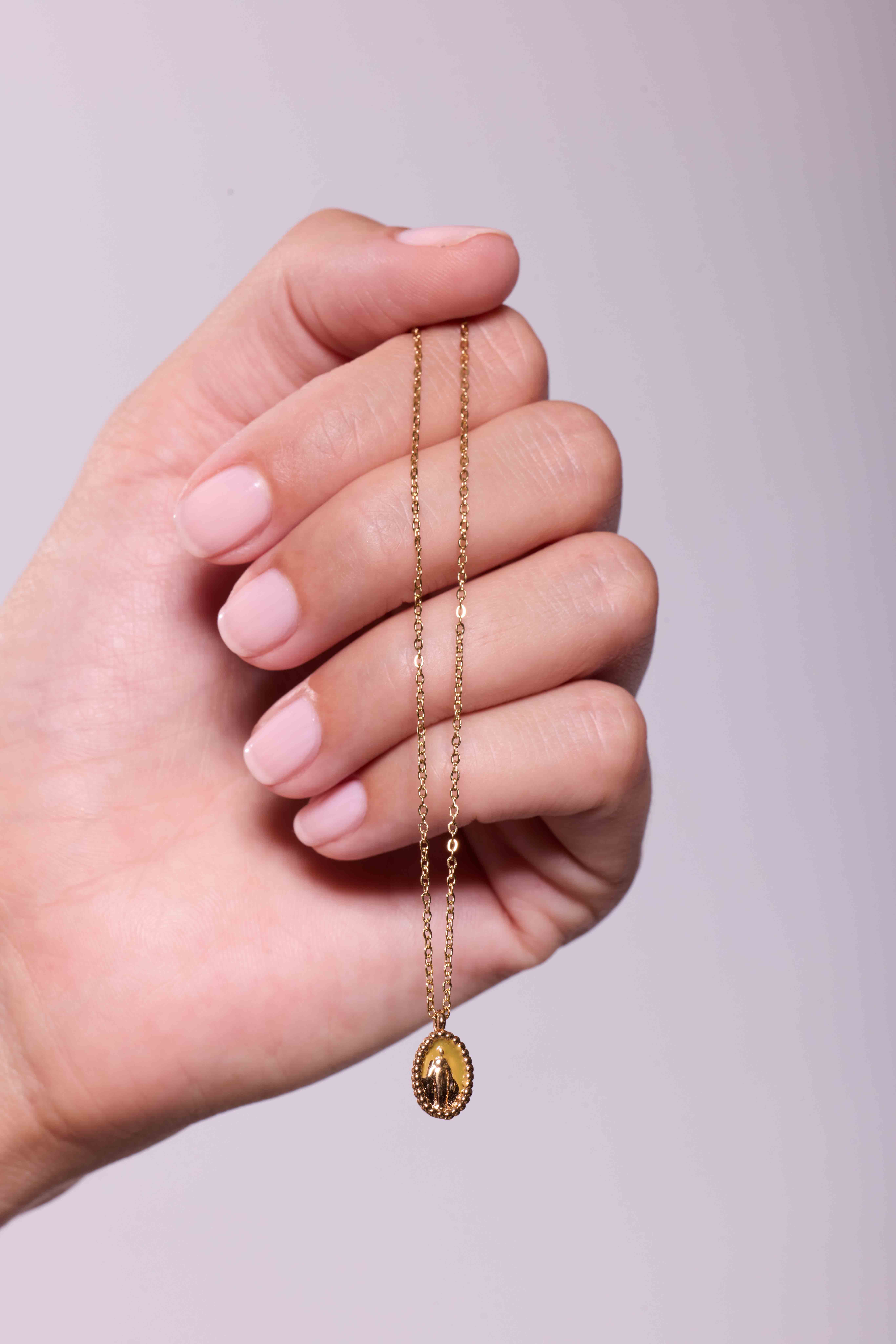 Le collier Jada Kaki associe l’intensité du vert à la chaleur du doré. Sa médaille émaillée, ornée d’une Vierge dorée, incarne un style à la fois spirituel et naturel.
