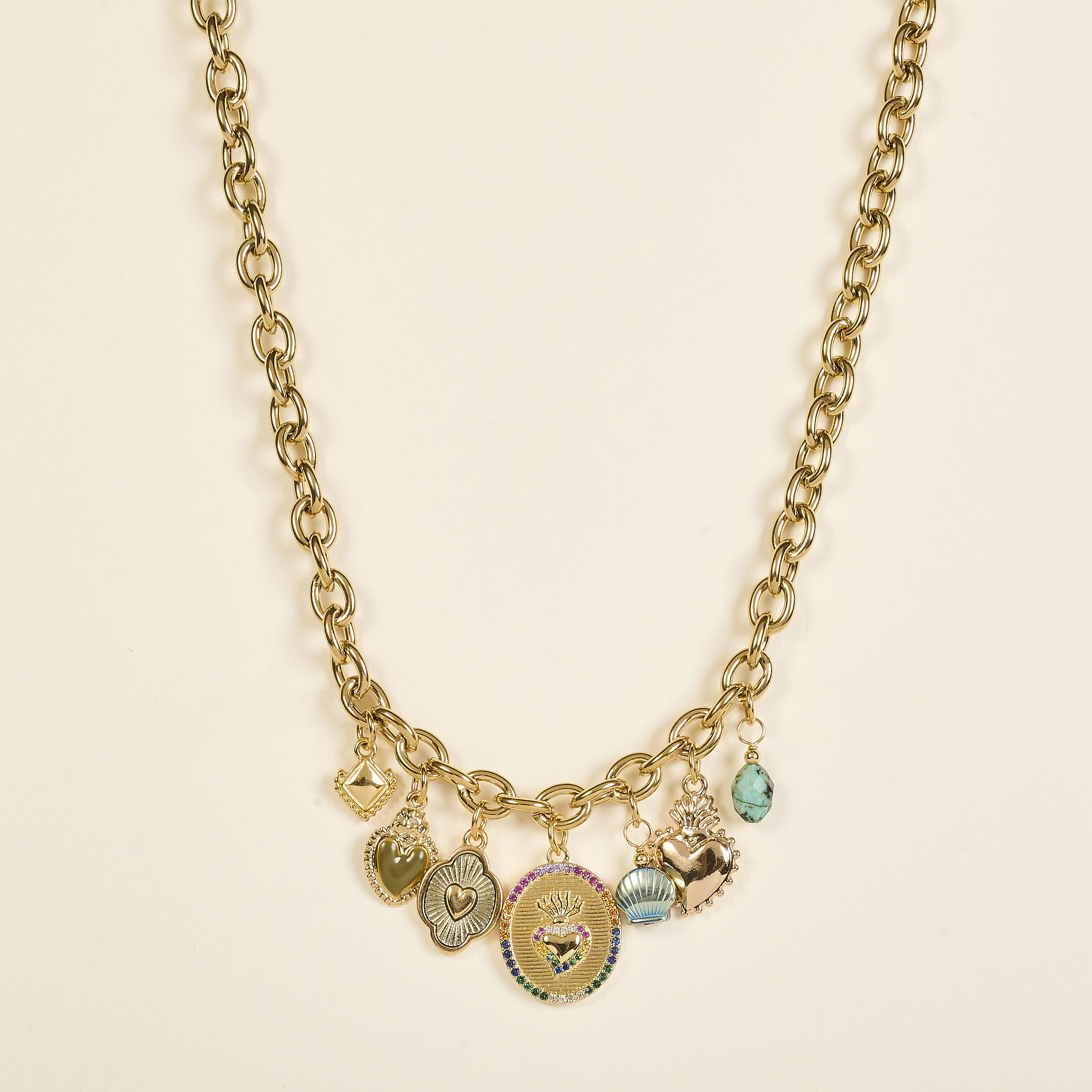Le collier Javi se compose de plusieurs médailles symboliques : un ex-voto, un cœur de lumière strié, des perles de turquoise africaine, une coquille, et un ex-voto central serti d’oxydes de zirconium multicolores.